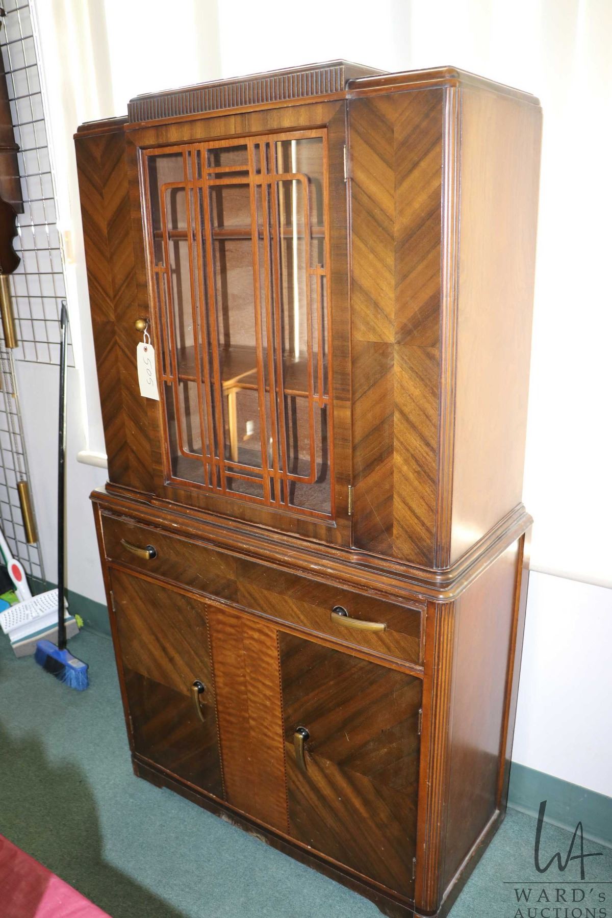 Art Deco matched grain walnut china cabinet with original pulls and finish, 68" in height and 38" wide