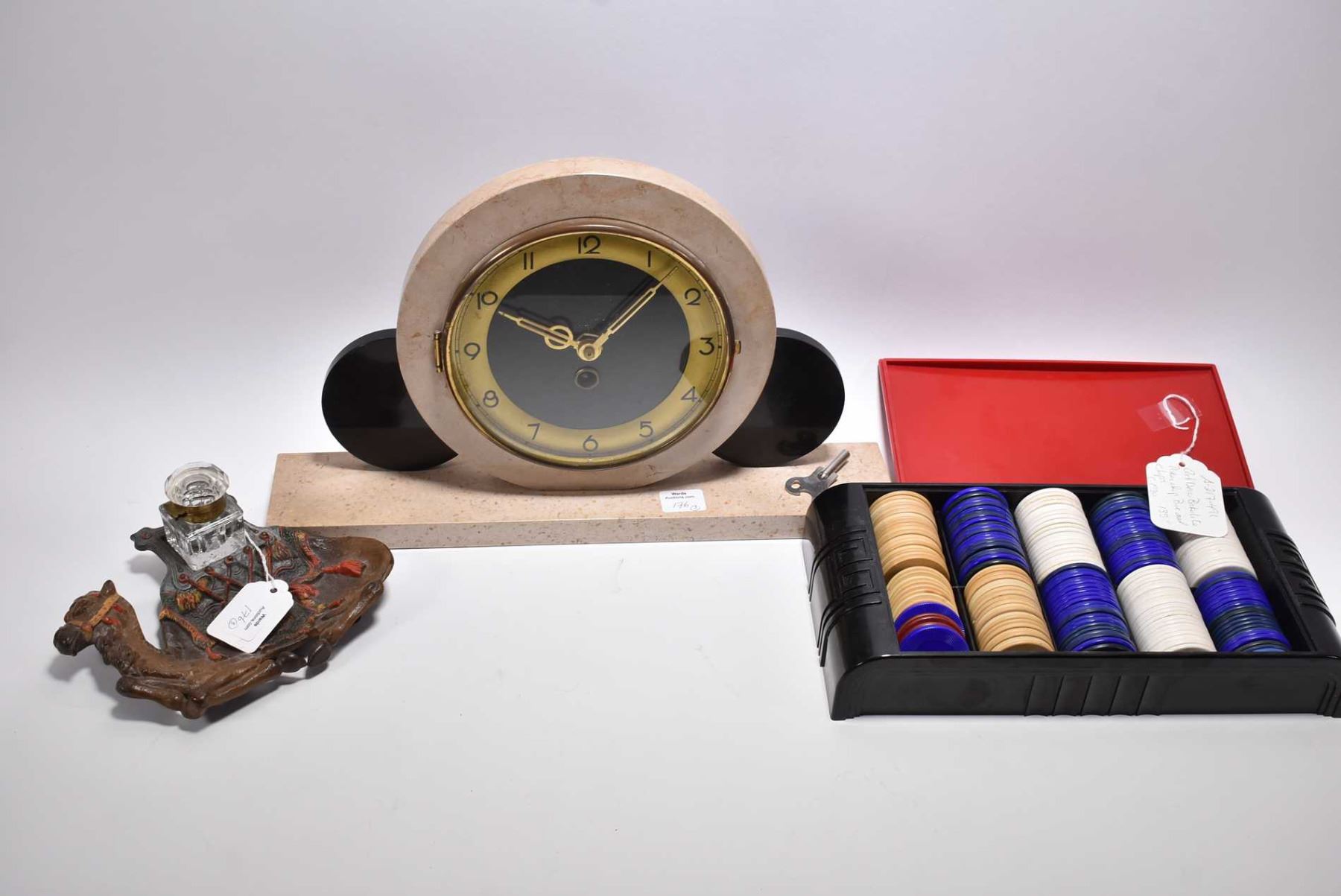 Art deco poker set, Victorian camel motif ink well and a Deco stone clock