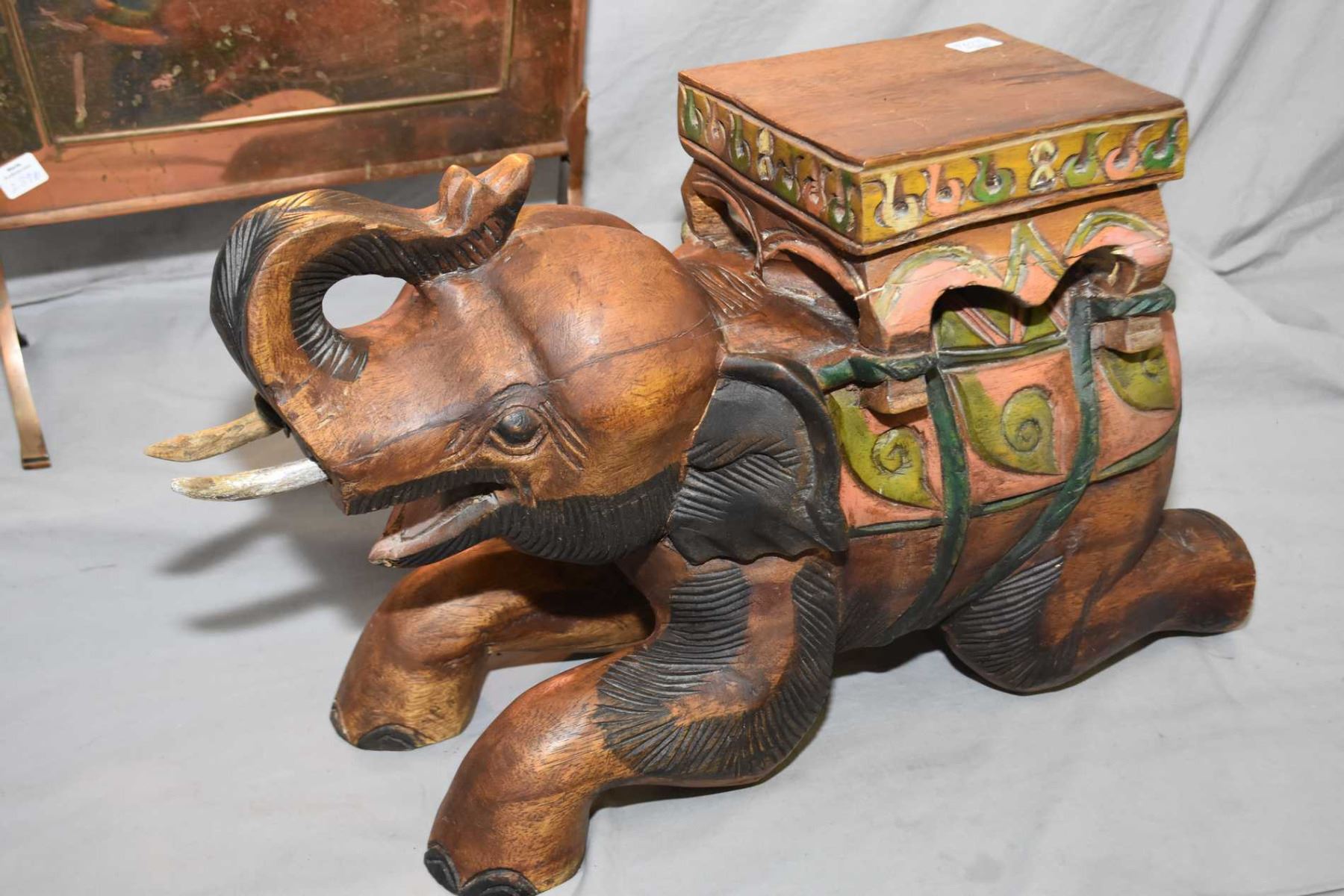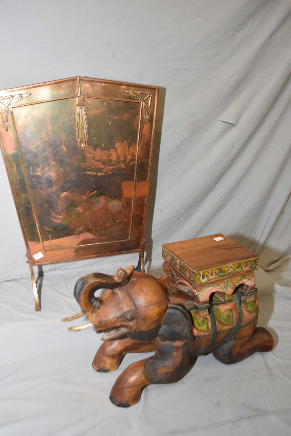 Art deco shield shaped copper fire screen and a carved elephant plant stand