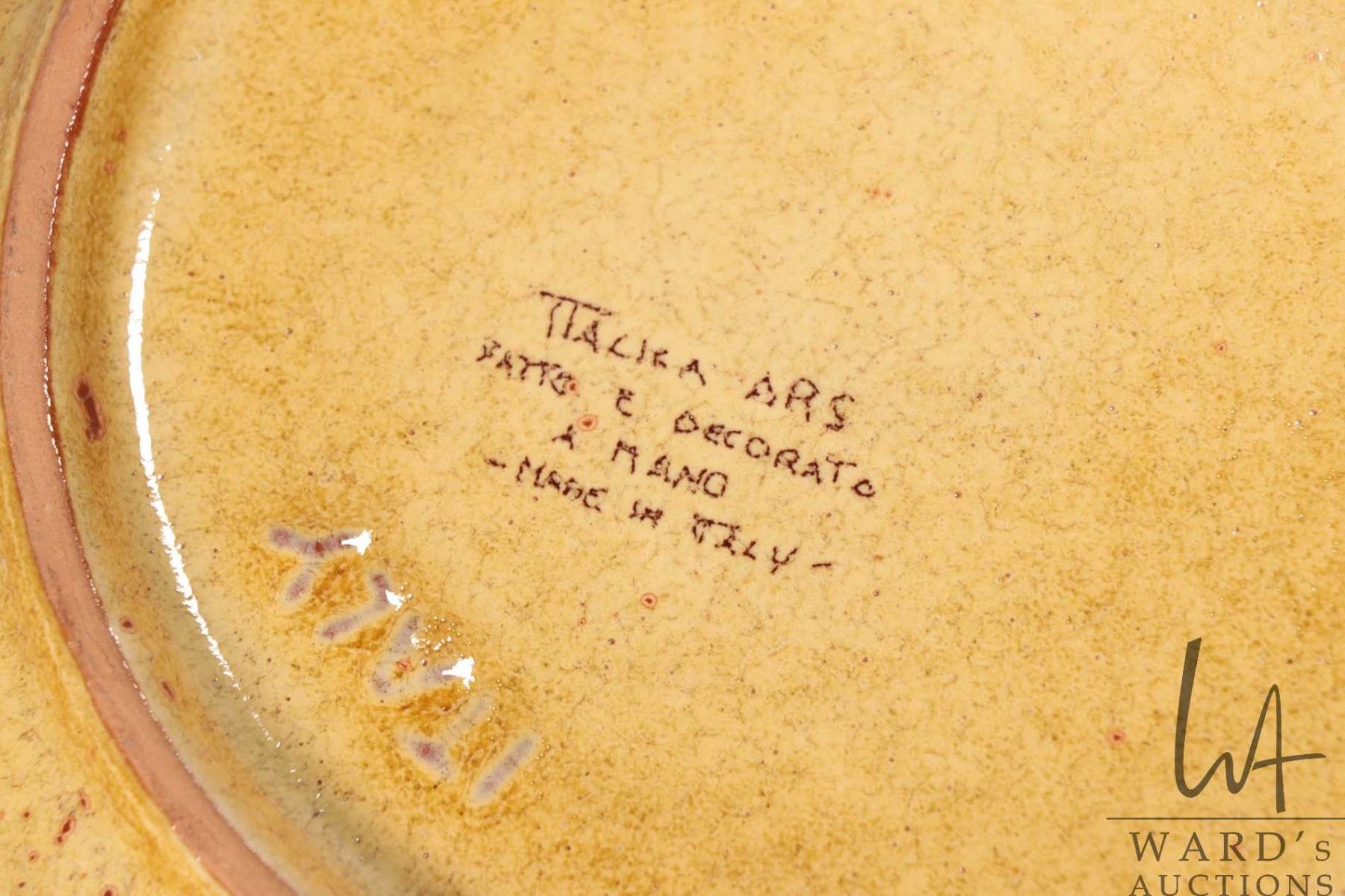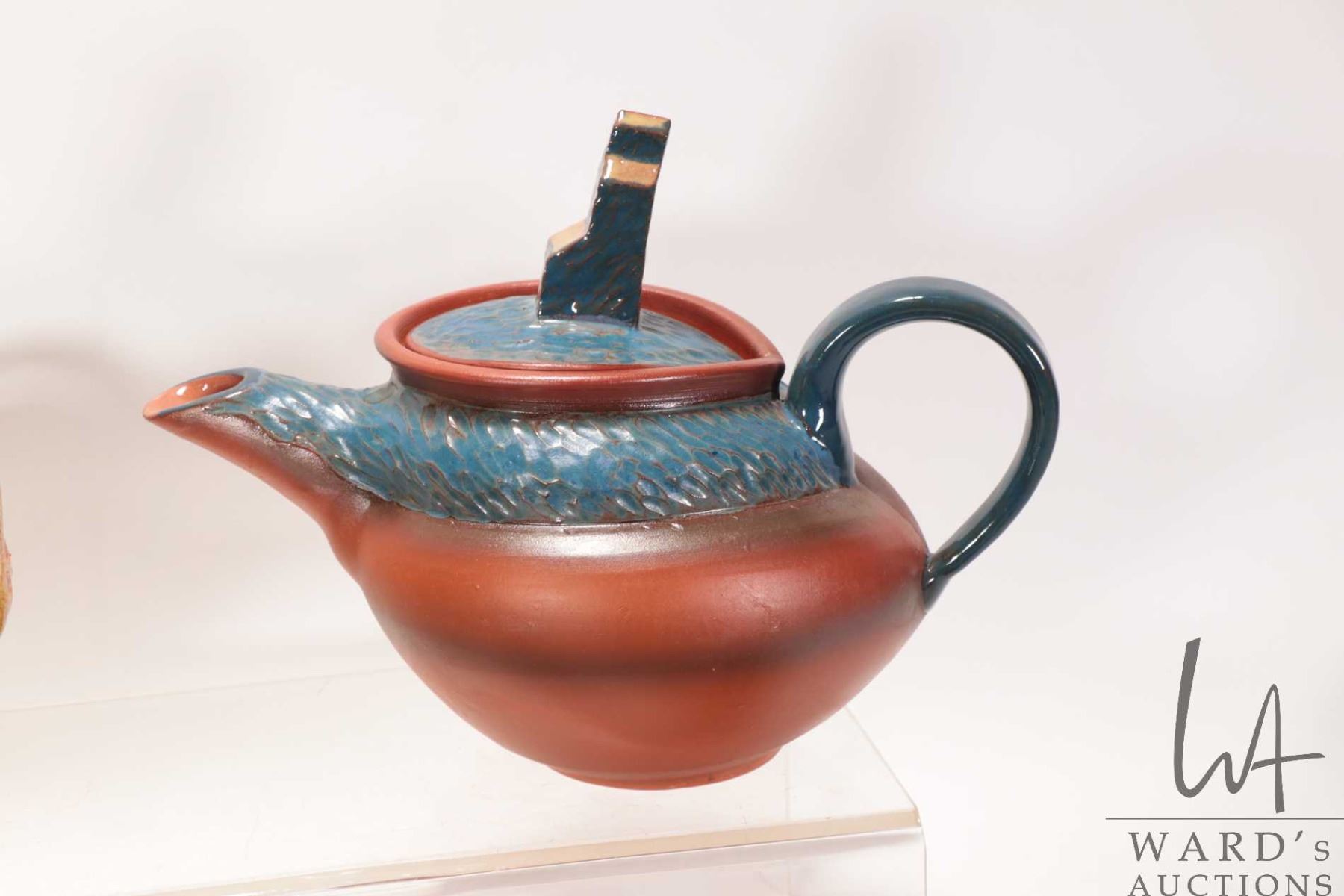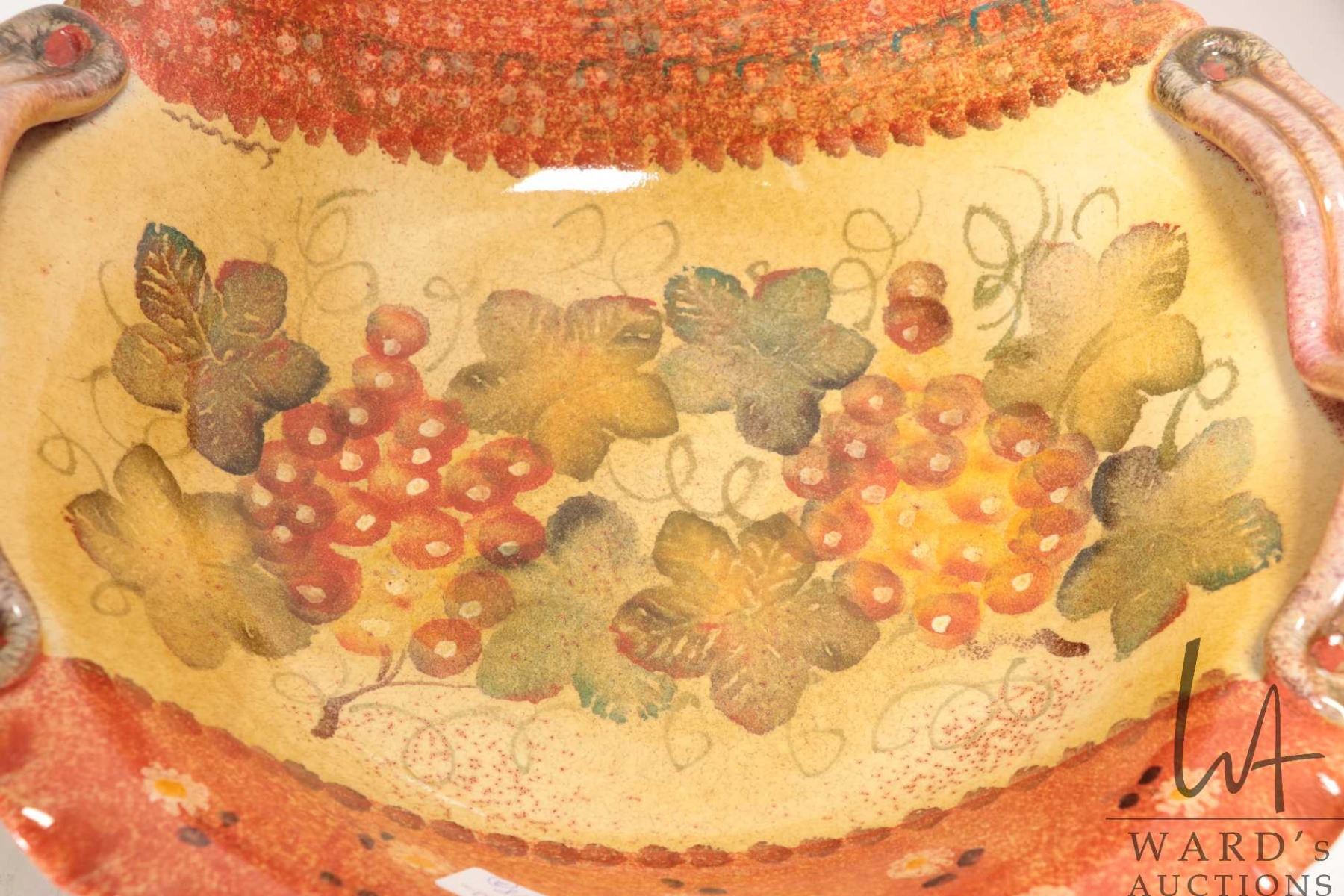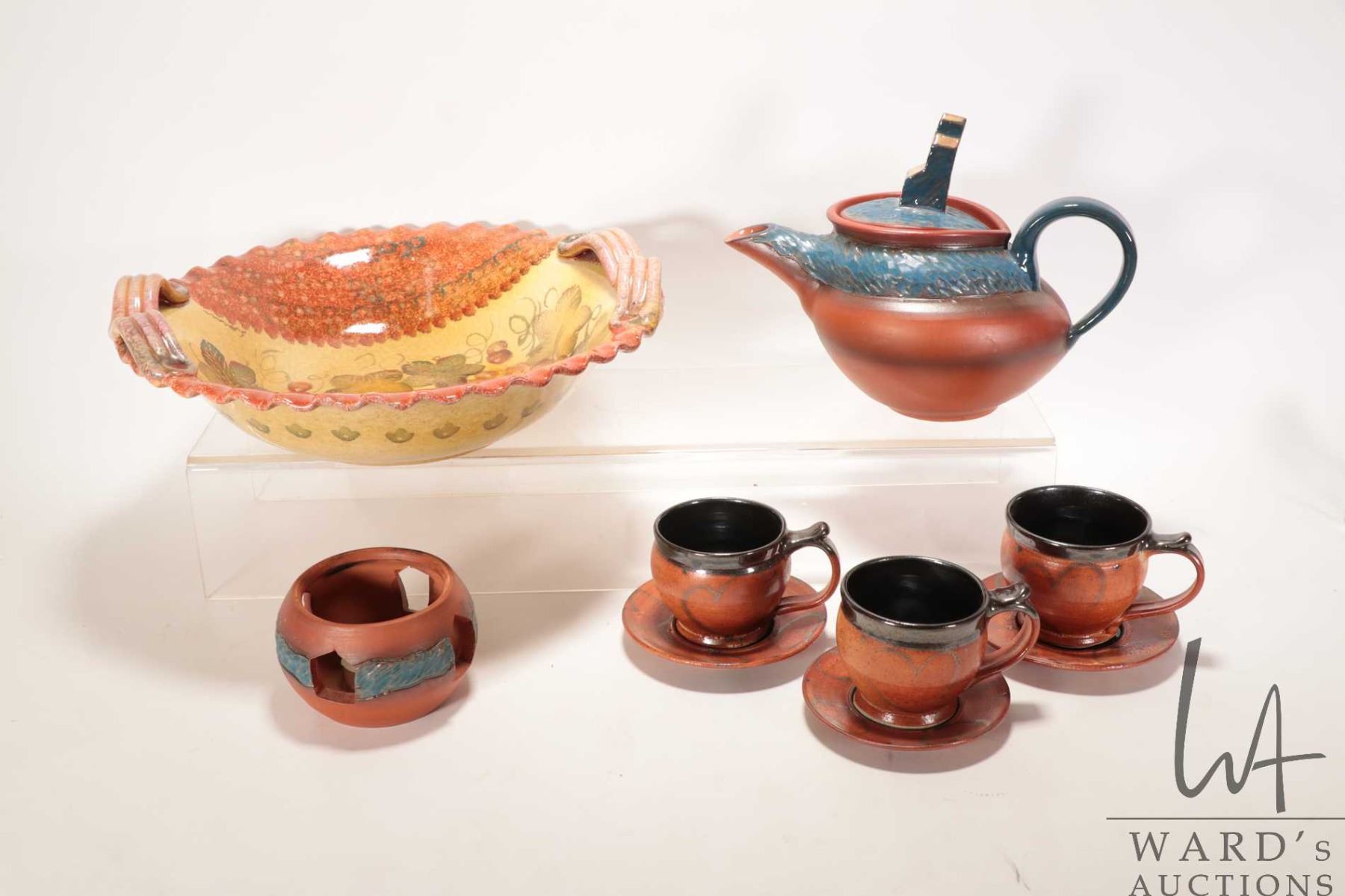 Artisan made and hand signed teapot with grain elevator finial and three clay teacups and saucers plus an Italian made clay bowl with fluted edge and handles, 14" in diameter