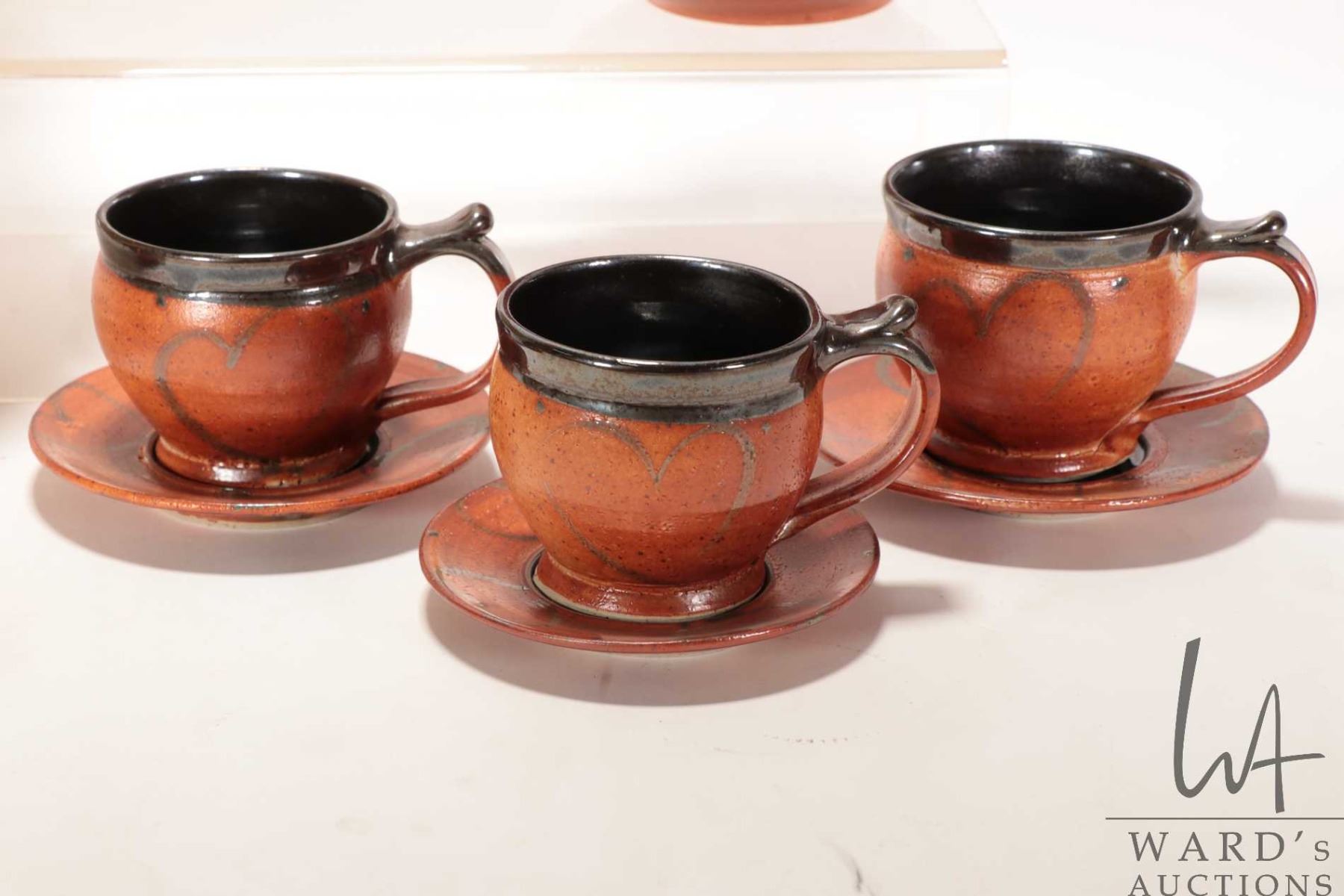 Artisan made and hand signed teapot with grain elevator finial and three clay teacups and saucers pl