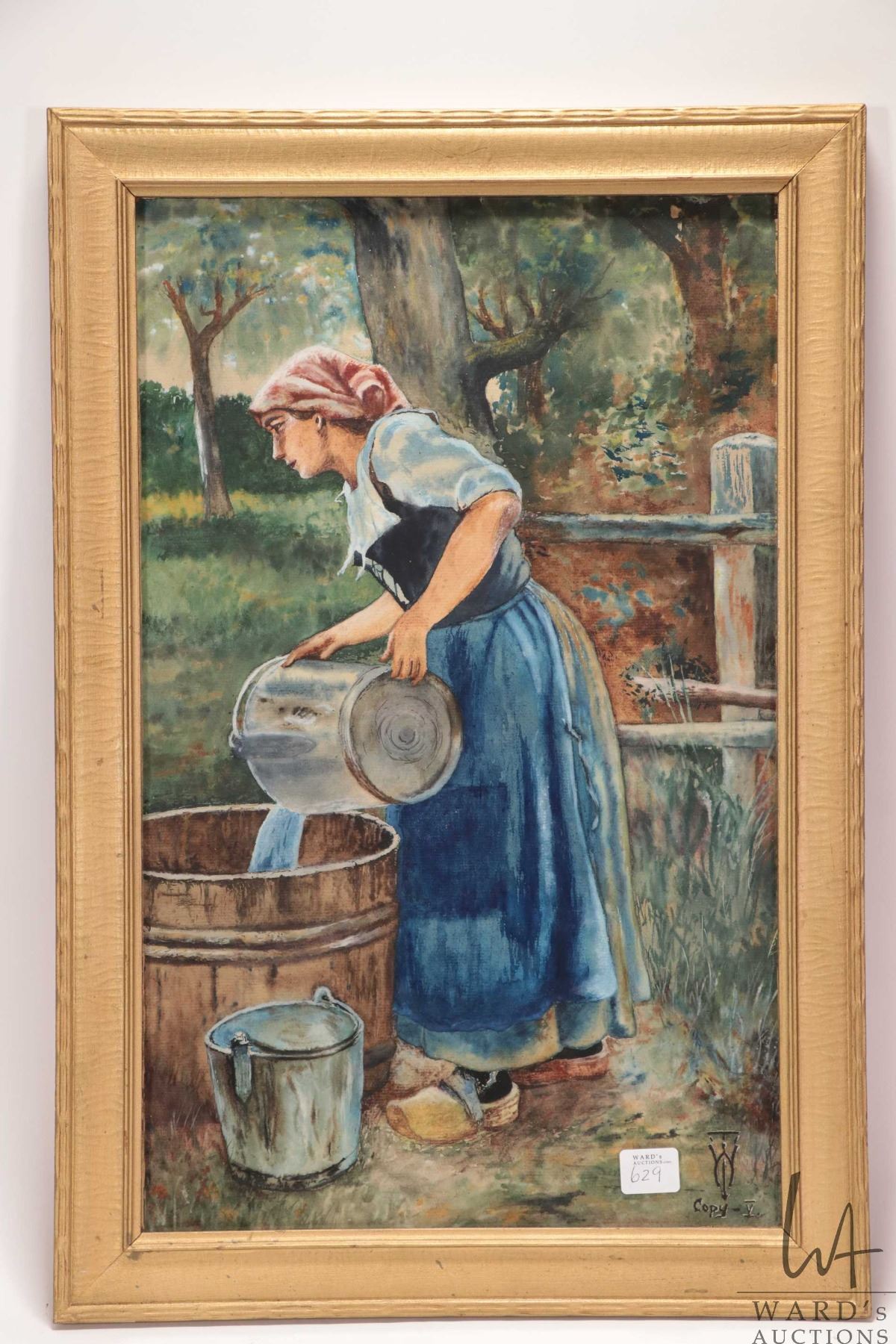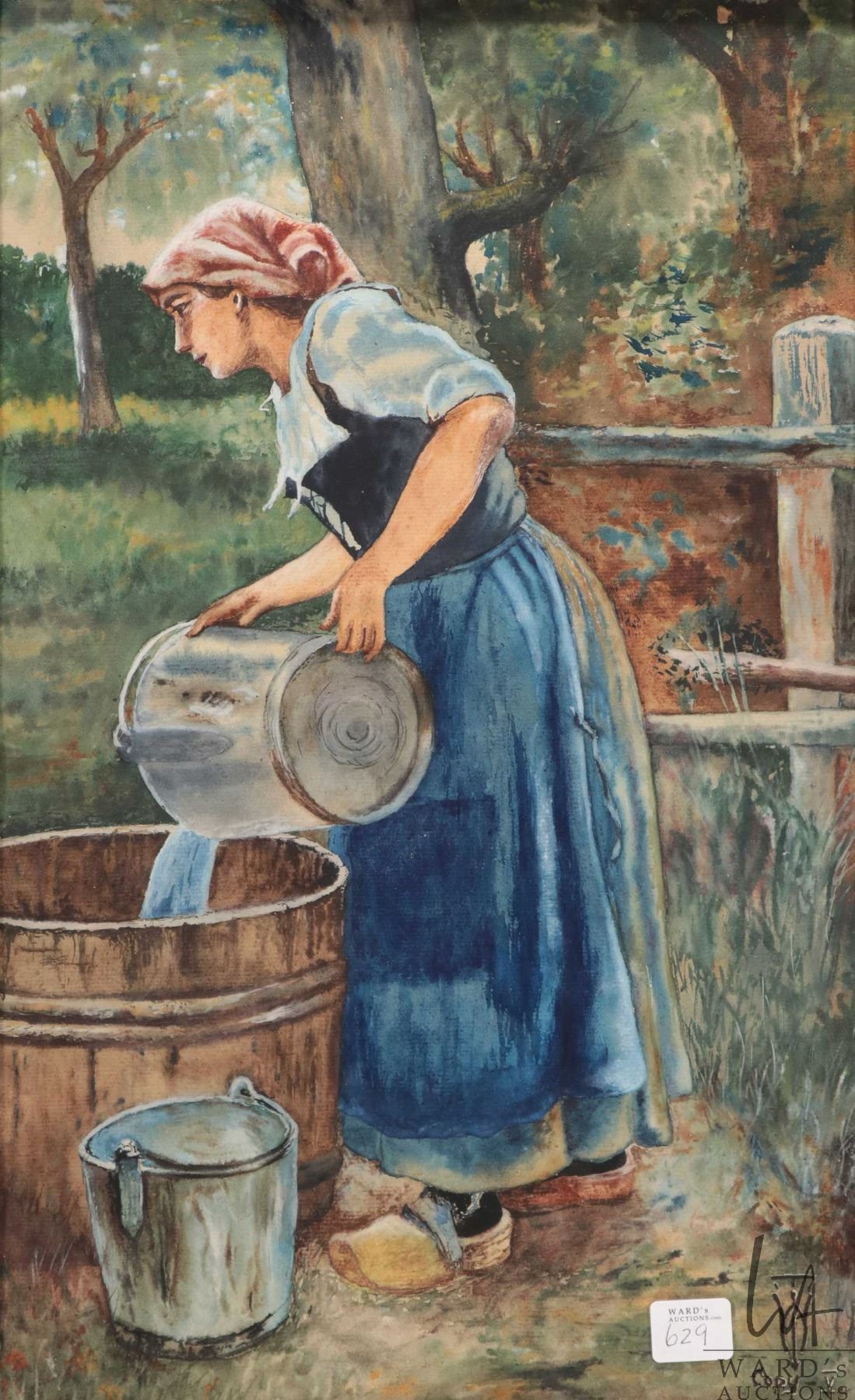 Artist initialled framed original watercolour of a Dutch woman pouring water, marked "Copy V" 17 1/2