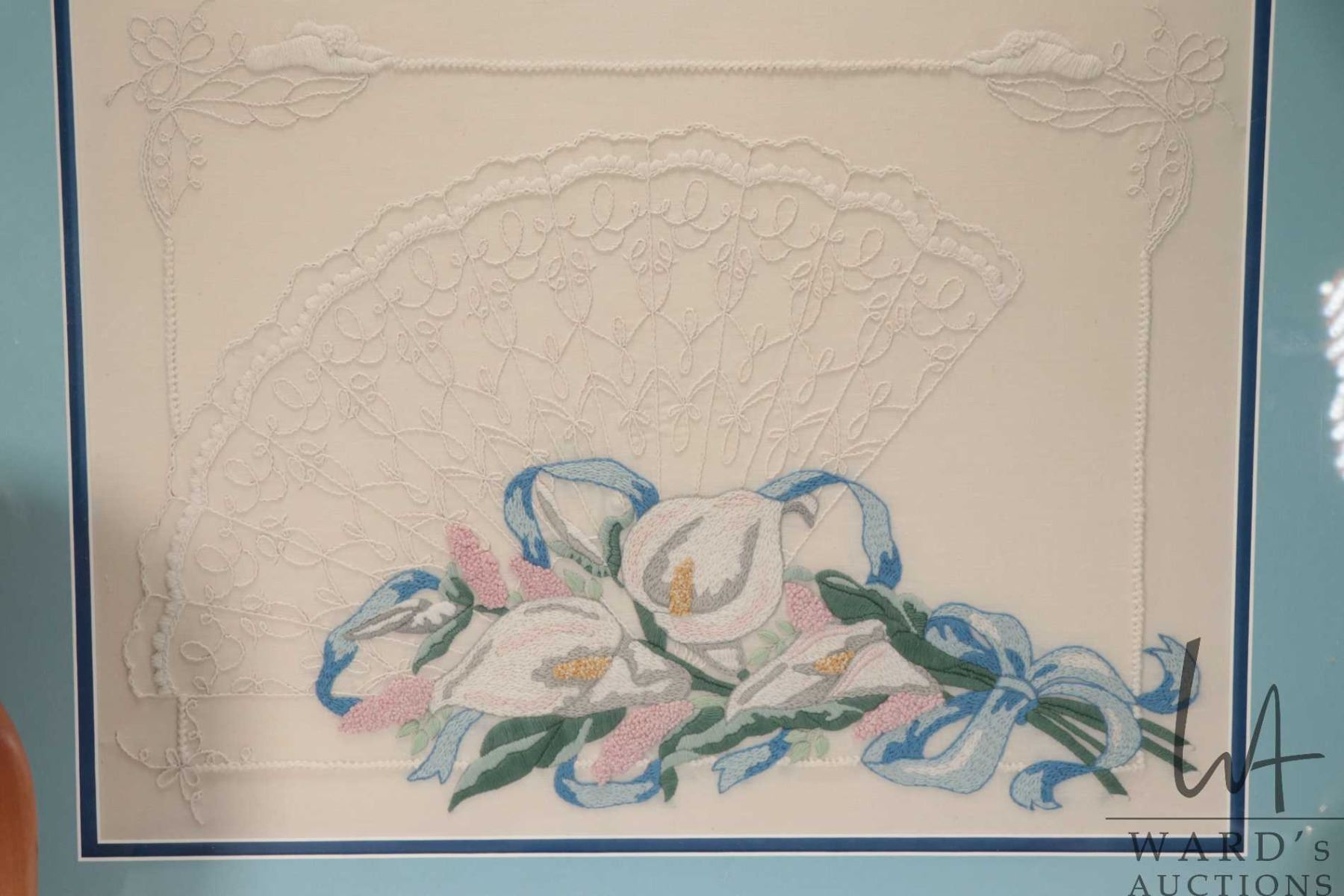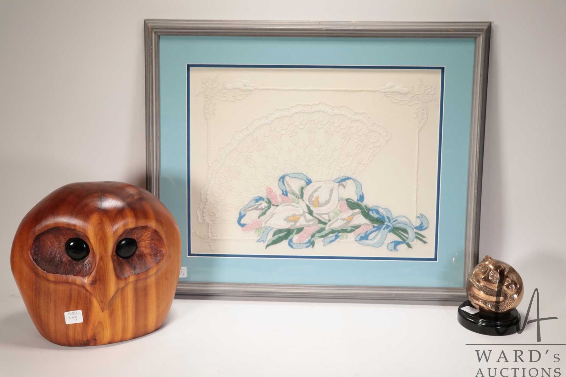 Artist made wooden owl sculpture labeled "Dale Douglas and Ted Head Bears Essential Owls" plus a bronze Panda bear sculpture and a framed needlework, overall dimensions including framed 18 1/2" X 22 1/2"