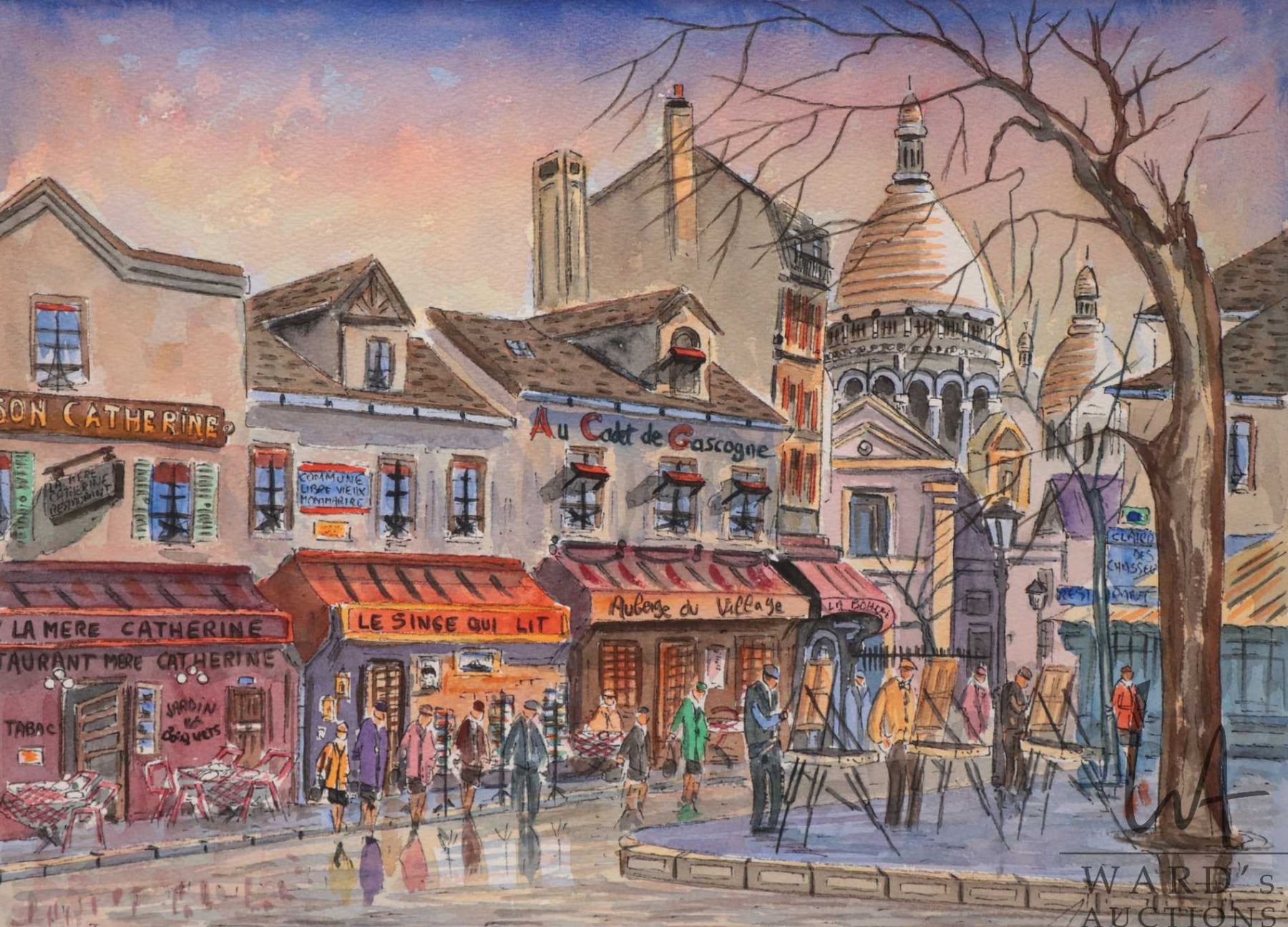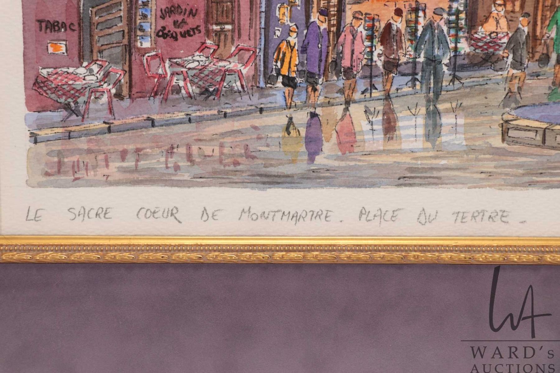Artist signed gilt framed watercolour painting titled "Le Sacre Coeur De Montmartre, Place De Tetre", 12" X 16"