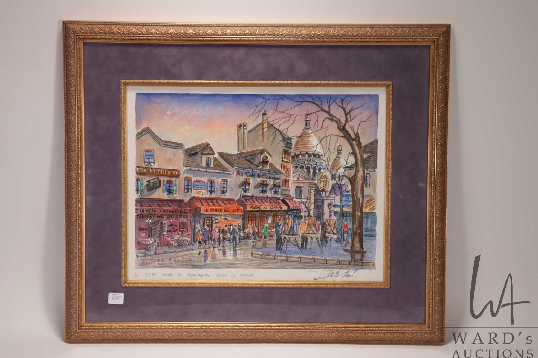 Artist signed gilt framed watercolour painting titled "Le Sacre Coeur De Montmartre, Place De Tetre"