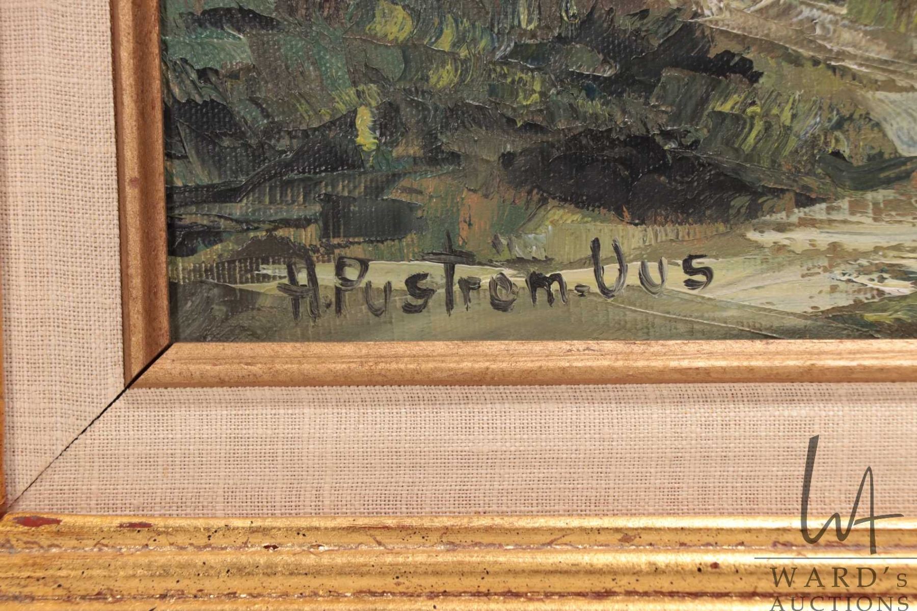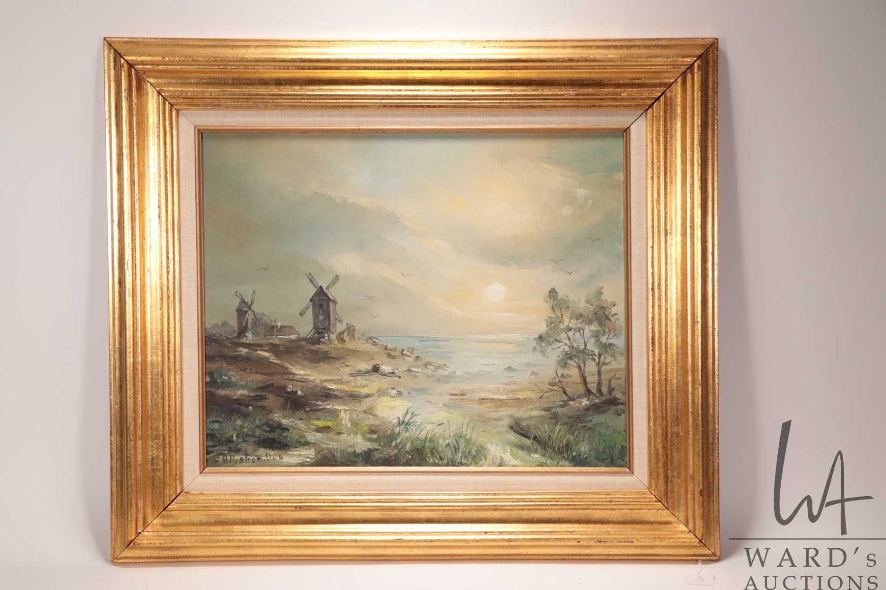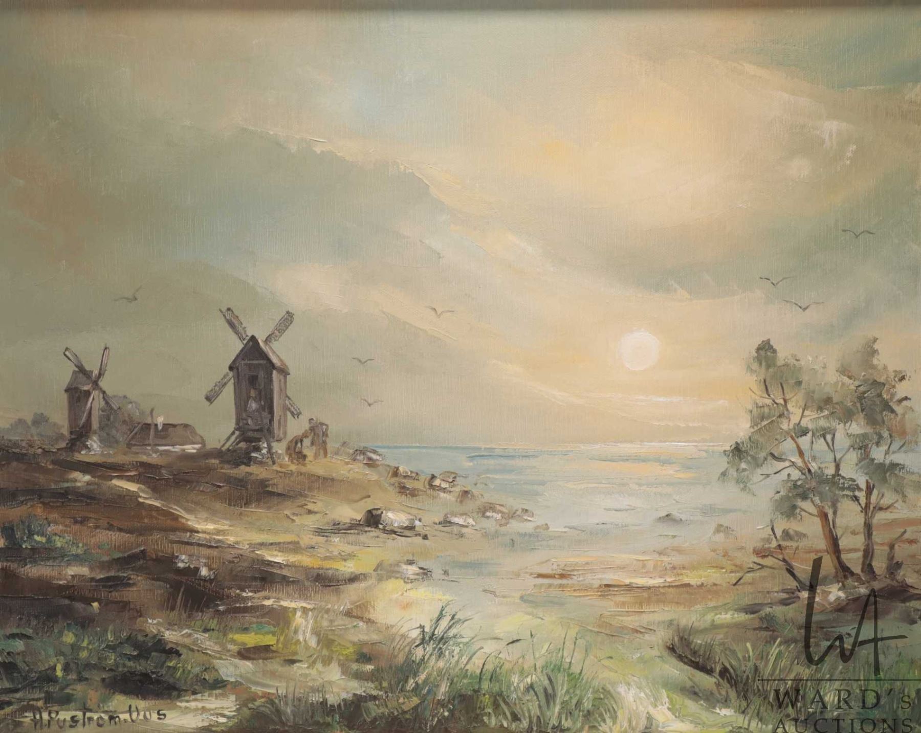 Arville Pustrom-UUS "Veski" framed original oil on canvas painting, labeled on verso "Windmills" 15 1/2" X 19 1/2". Note: This is too large to ship. Local pickup only
