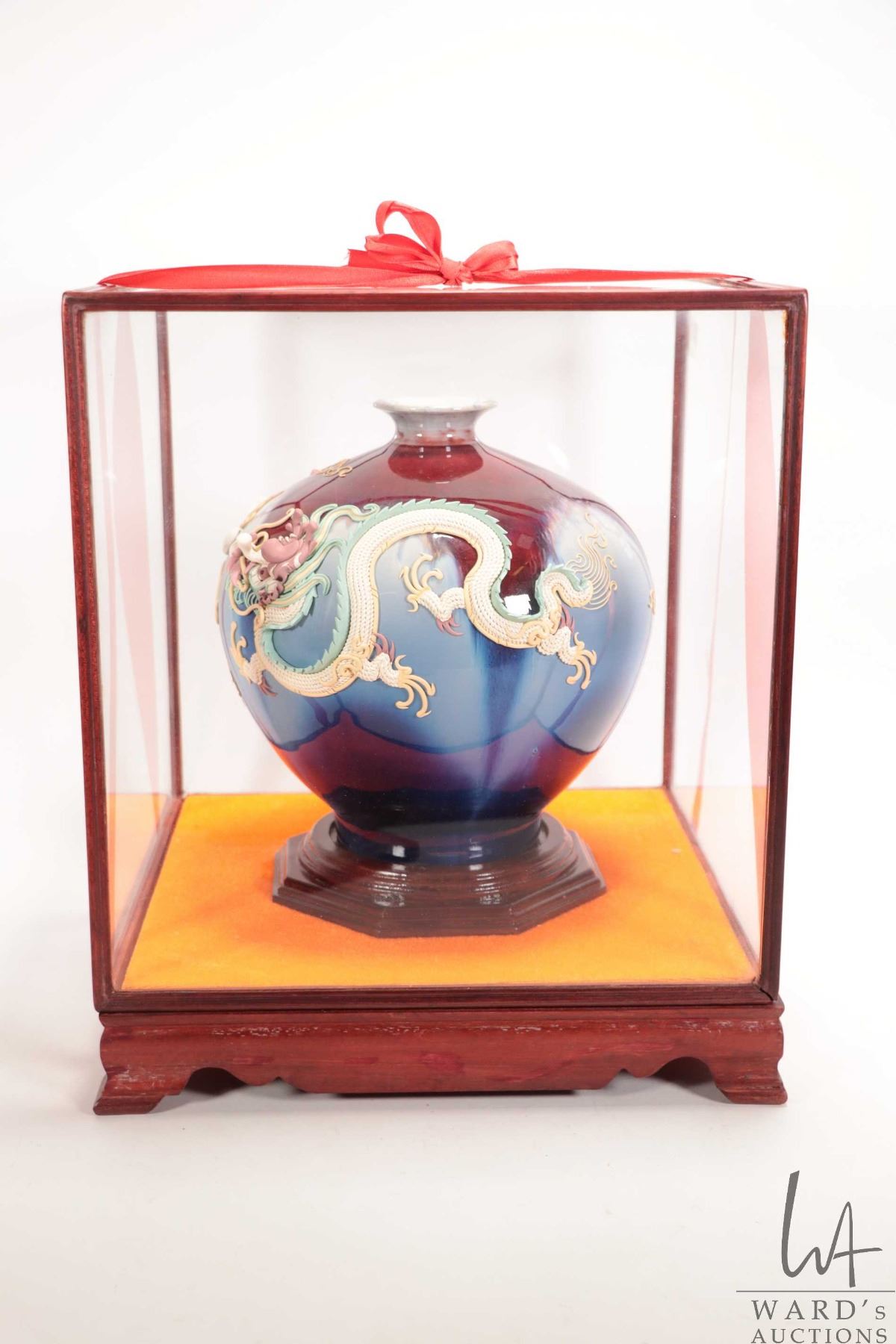 Asian Moriage dragon motif vase in fitted glass 13" X 11" X 11" box, includes lined presentation box