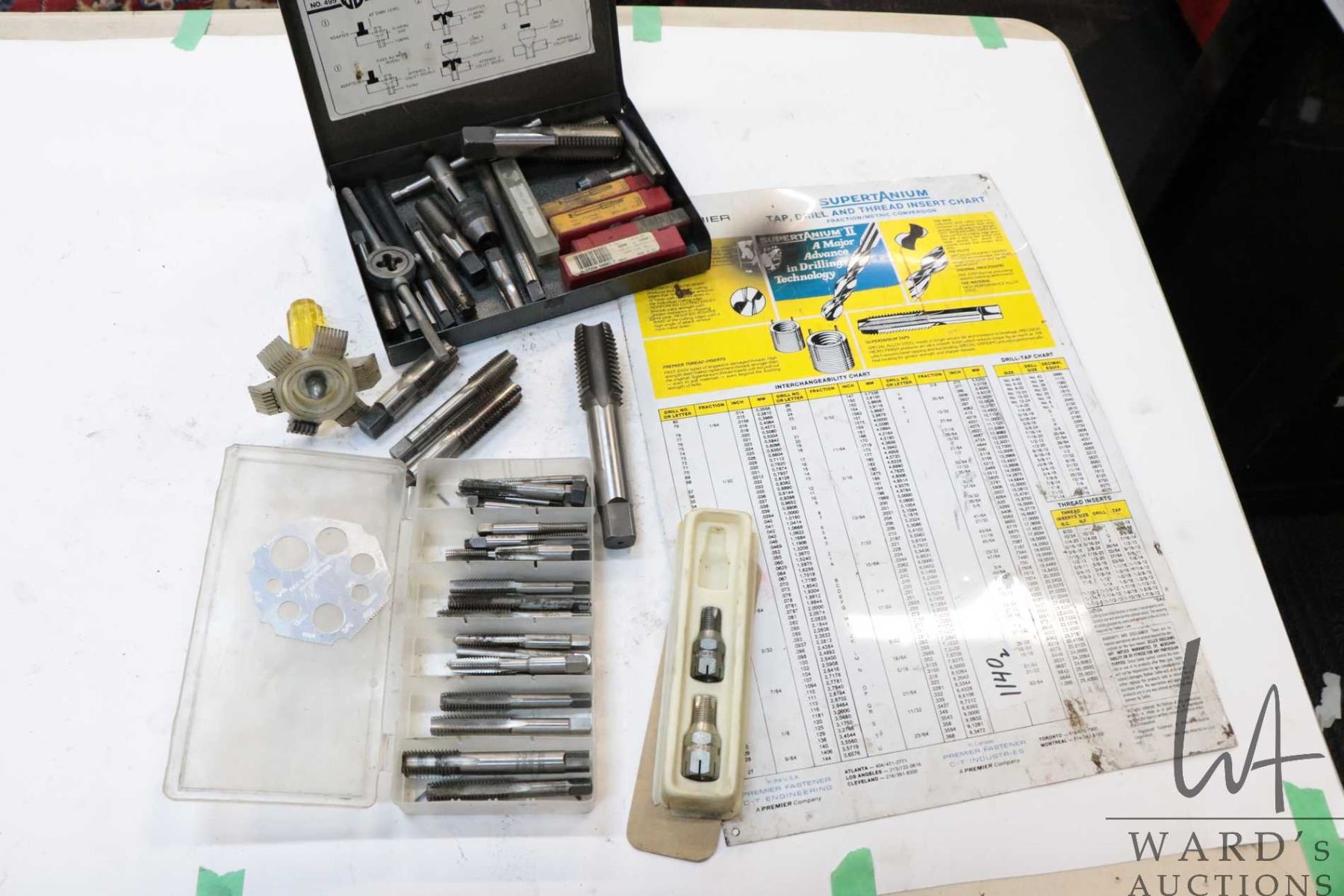 Assorted taps up to 1 1/4", thread chasers and thread cleaner and an information board