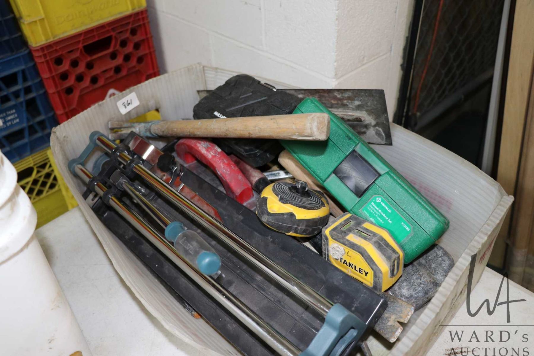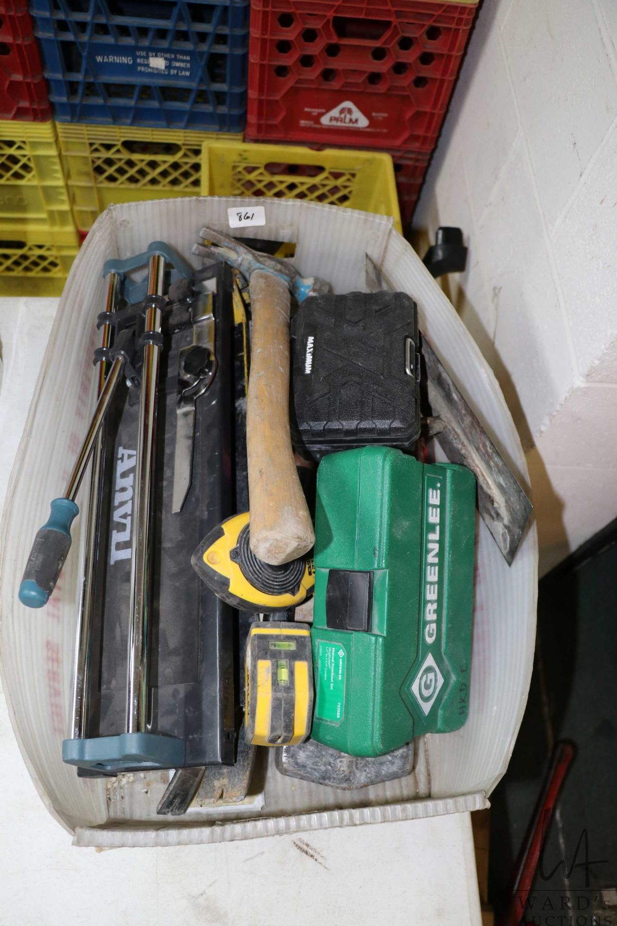 Assortment of tools including Greenlee manual knock out kit, tile cutter, tile hole cutters, trowels, chisels, pry bars, hammers, Stanley laser level etc.