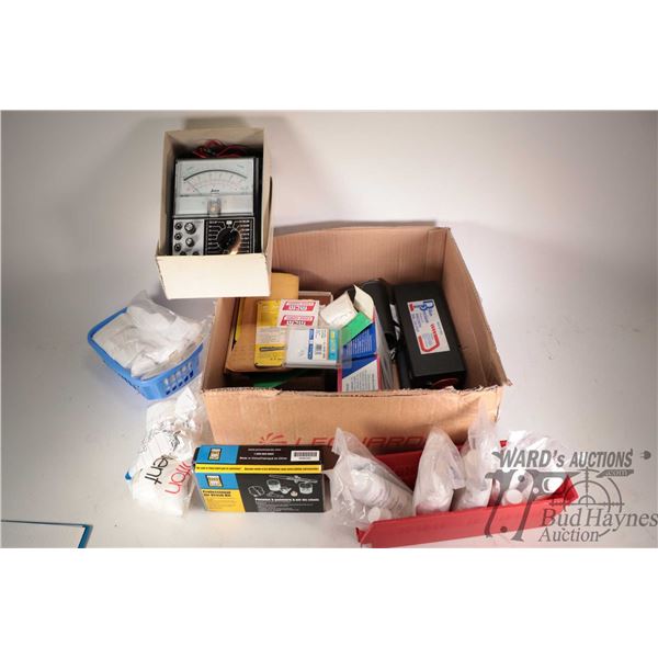 Selection of workshop supplies including patches, velocity table, checkering tools, cleaning kit, Arma-Coat, bore sight, Janna HJ-8013A multimeter etc