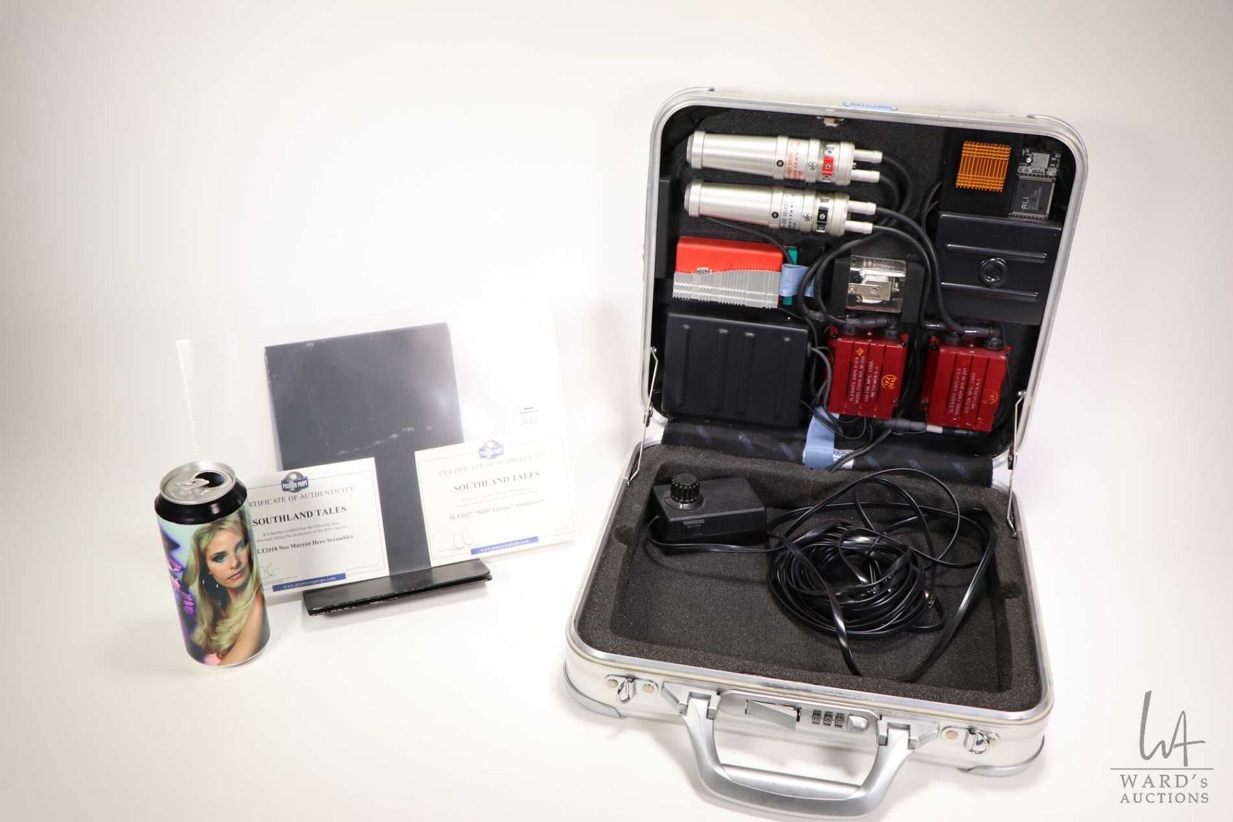 Authentic movie props from Southland Tales including "NOW Energie" aluminum can and Neo Marxist Hero Scrambler both with Premiere Props certificates of authenticity