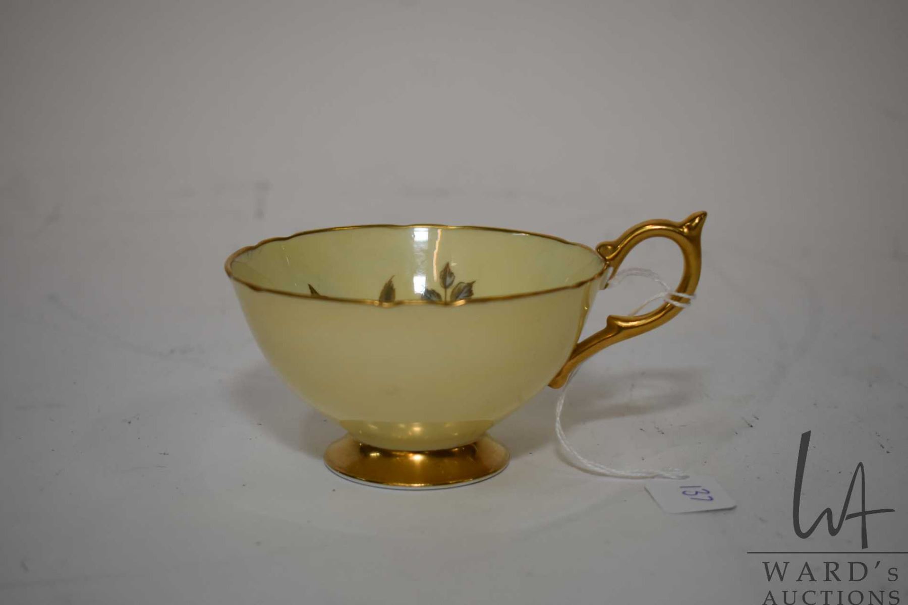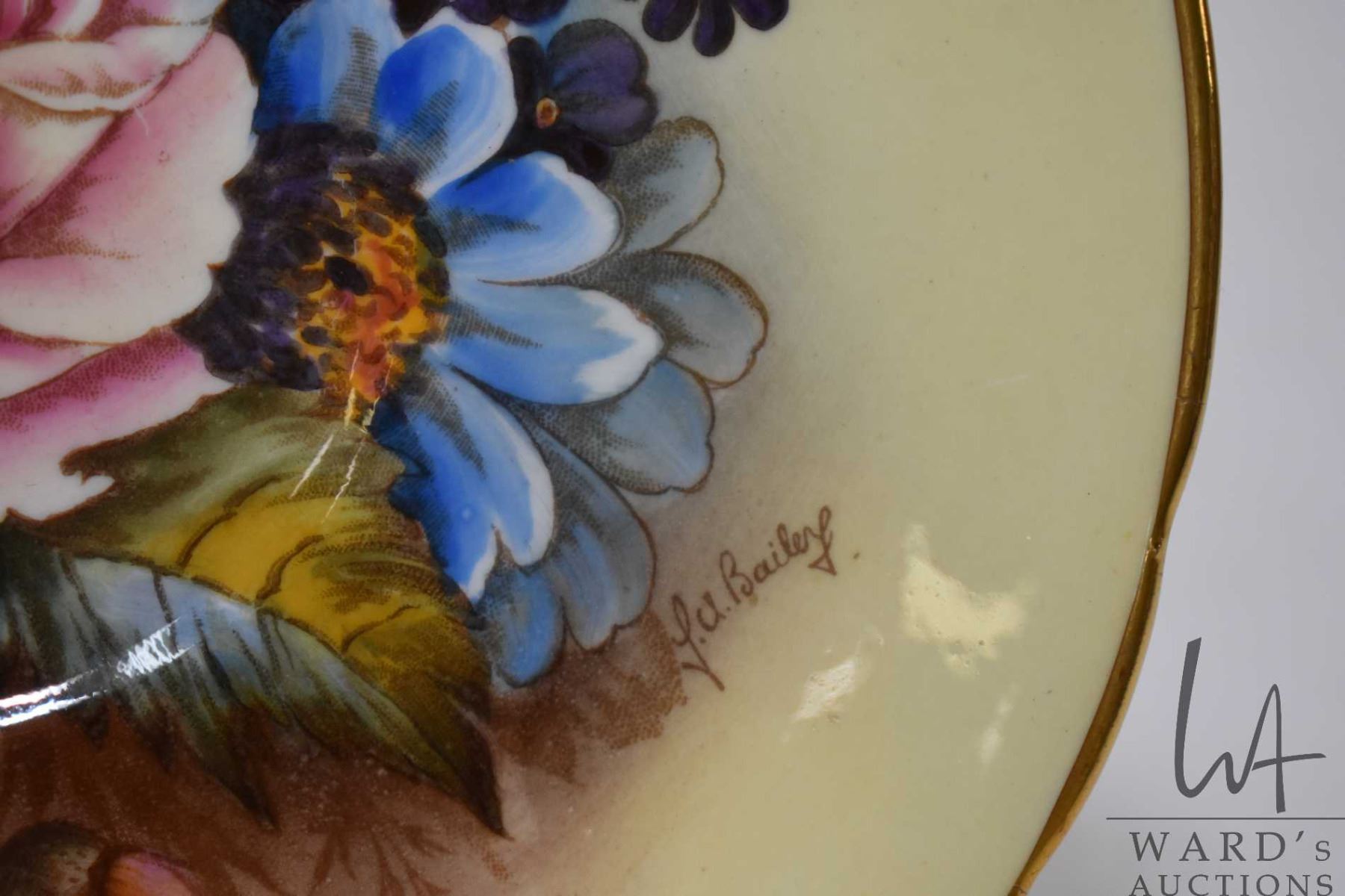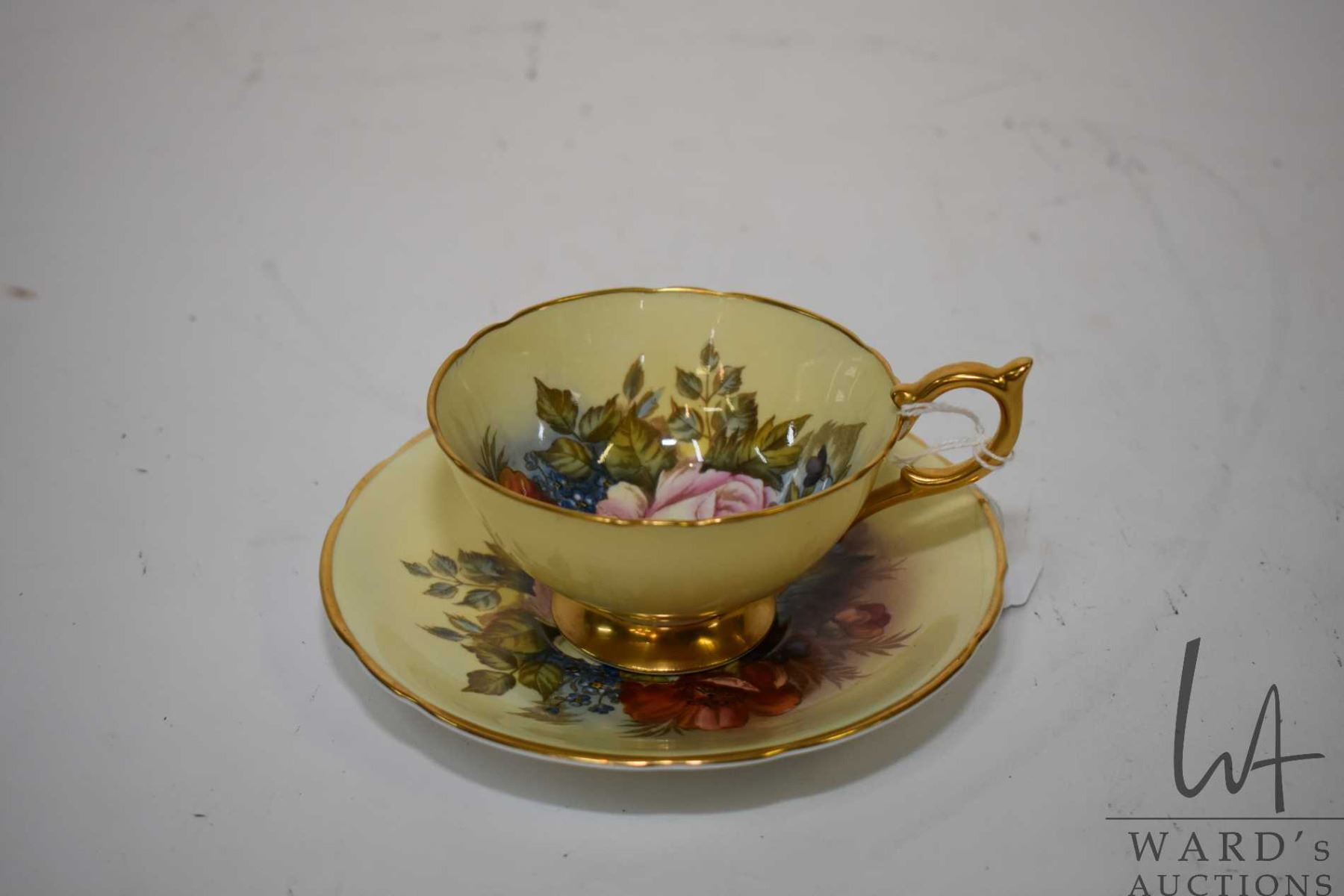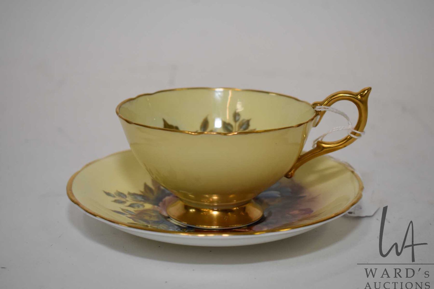 Aynsley bone china teacup and saucer with hand painted detailing and by artist J.A. Bailey. Note: This item cannot be shipped. Local Pickup Only