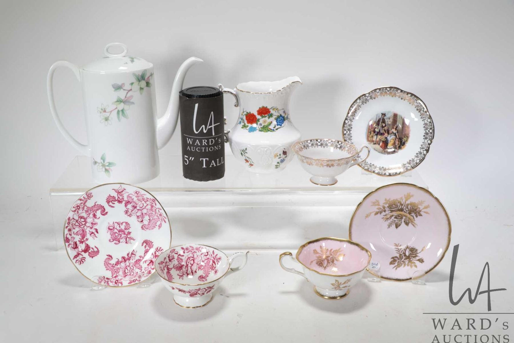 Aynsley famille Rose creamer, an 8" high Wedgwood Lemon Tree teapot and three china cups and saucers including Paragon, Rosina etc.