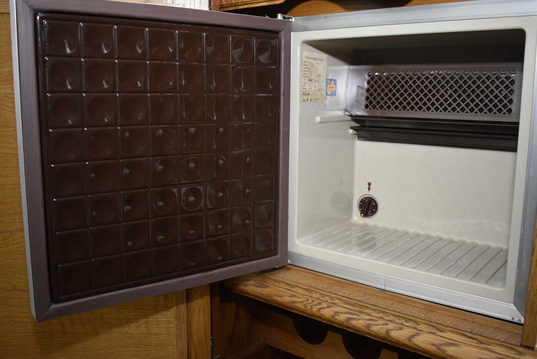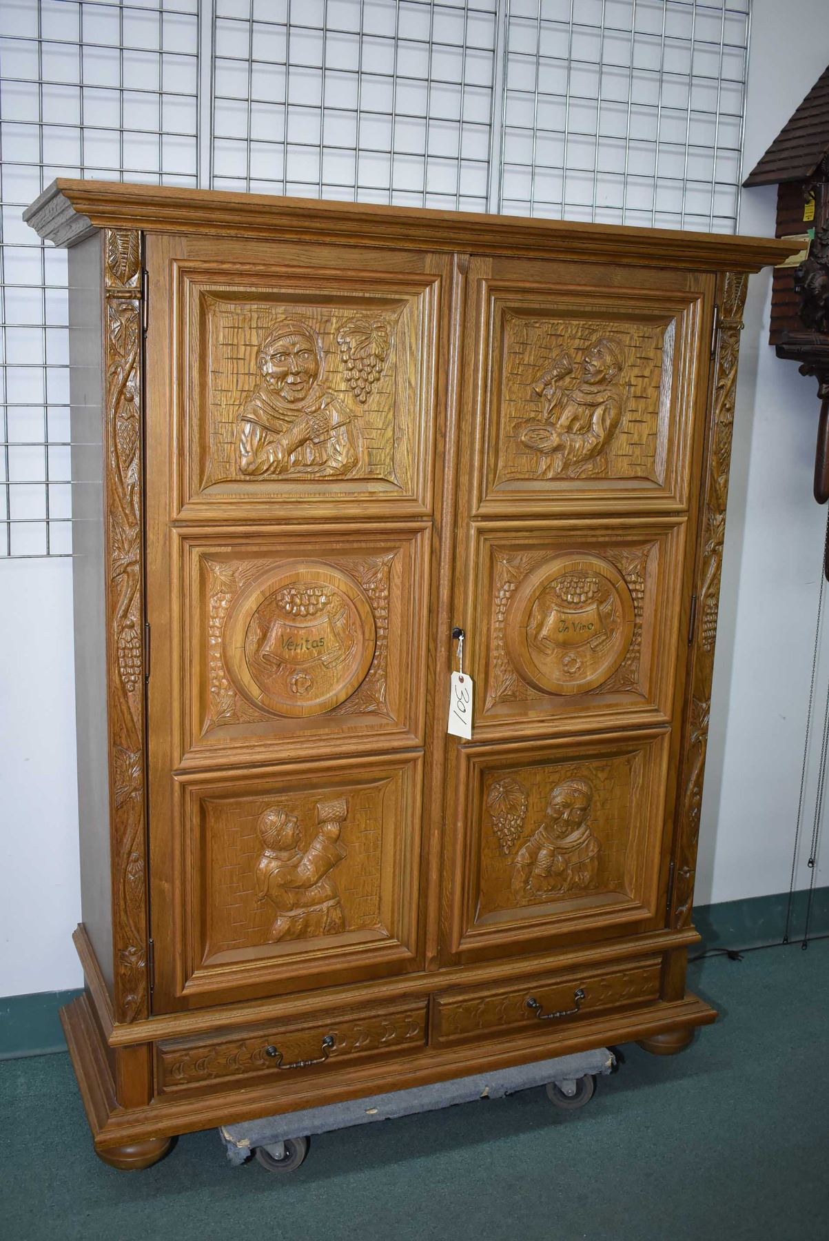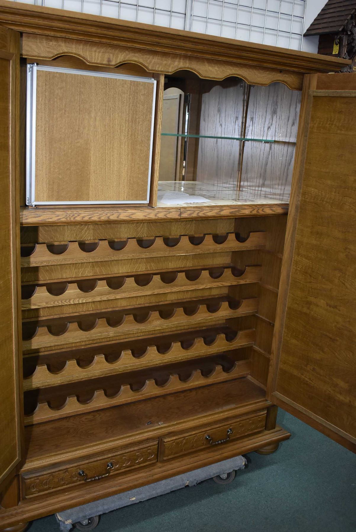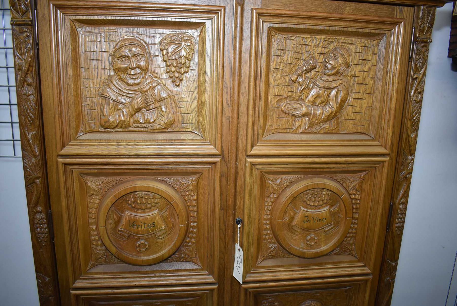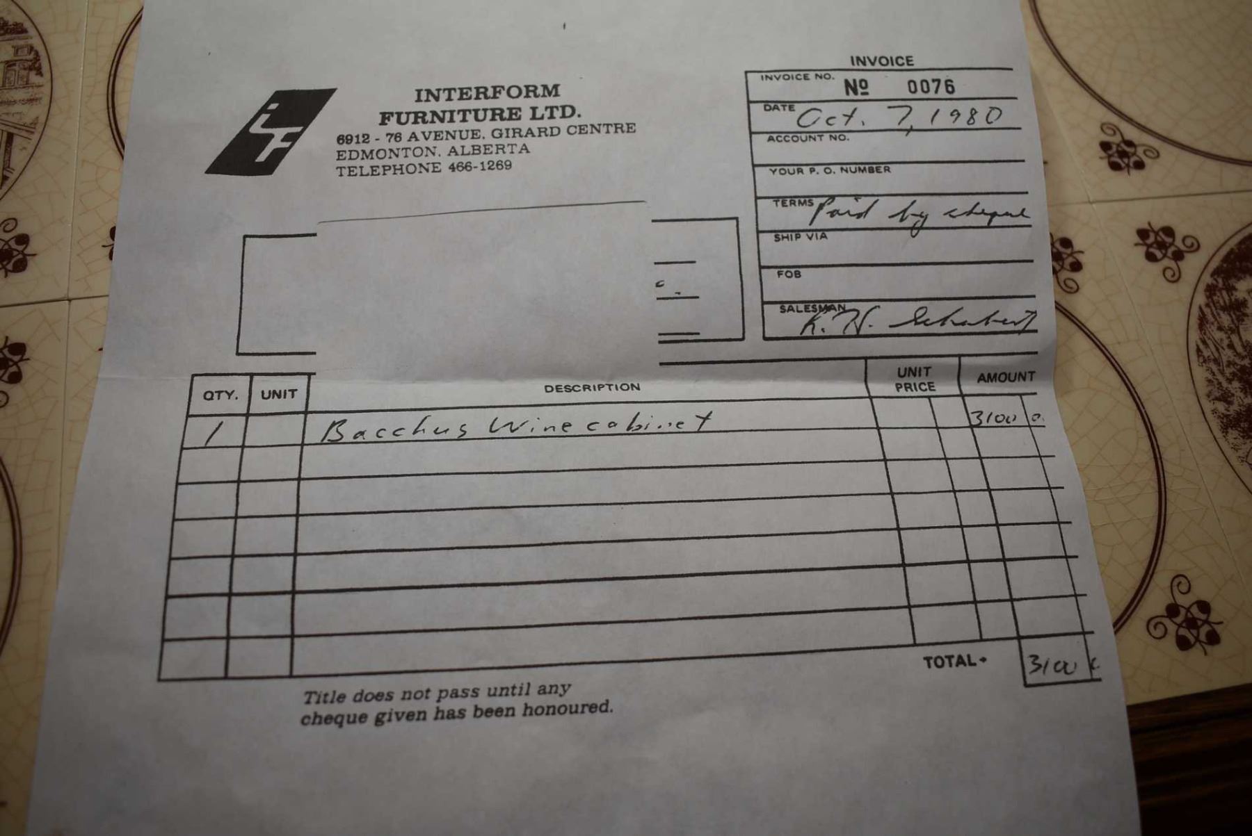 Bacchus wine cabinet with two carved oak wine themed paneled doors, tiled interior prep surface, five slide out storage shelves, each holding nine bottles plus a small fridge and double storage drawers, note original 1980 receipt from Interforn Furniture Edmonton and retailing for $3,100.00, 66" in height