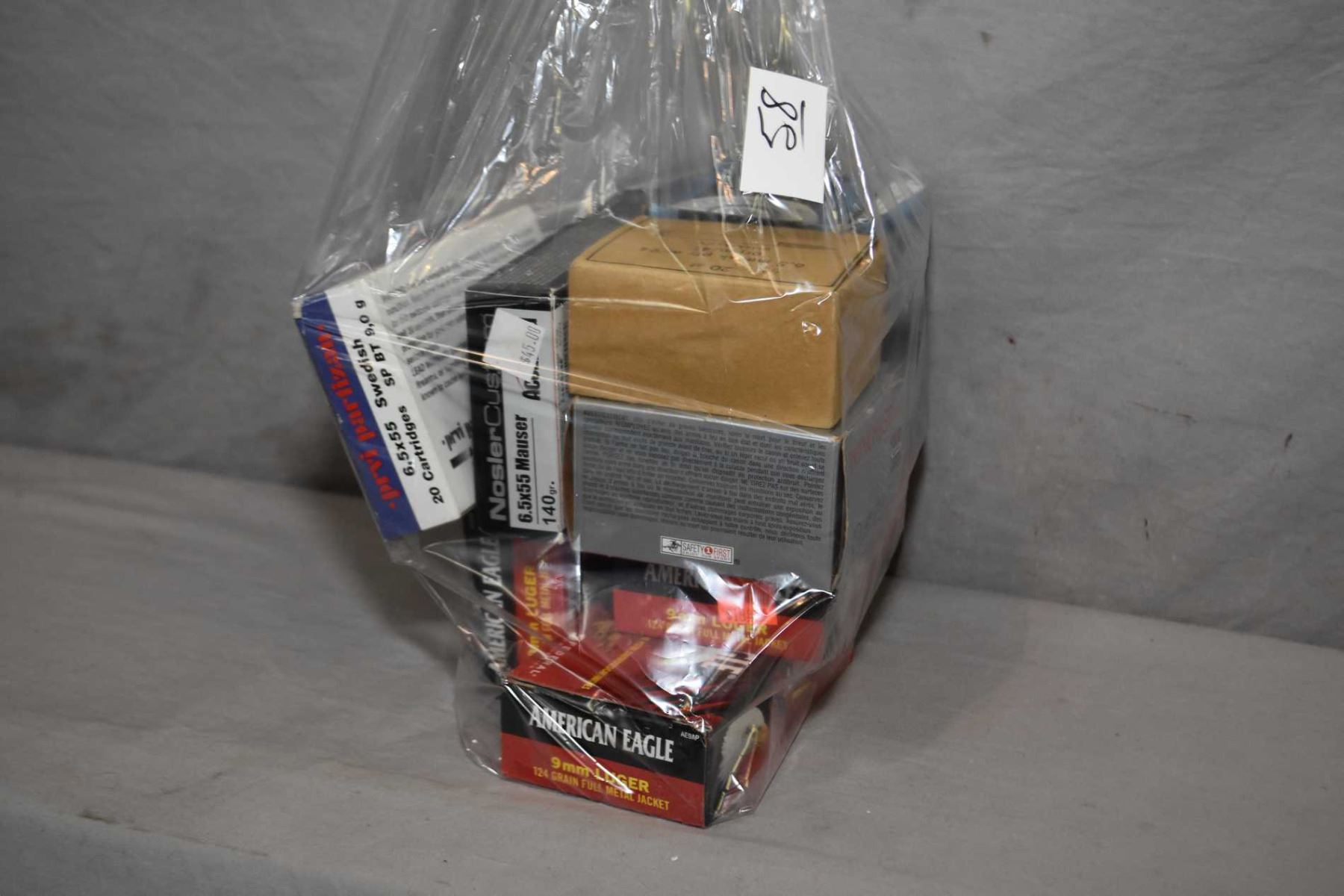 Bag Lot : 110 Rnds Plus Brass .9 MM Luger Cal Ammo - 55 Rnds .45 Colt Ammo - 3 Boxes 6.5 x 55 Swedish Mauser Cal Ammo - black bag w/ few rnds ammo, etc.