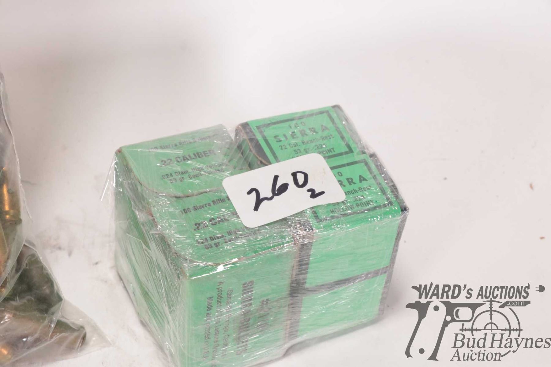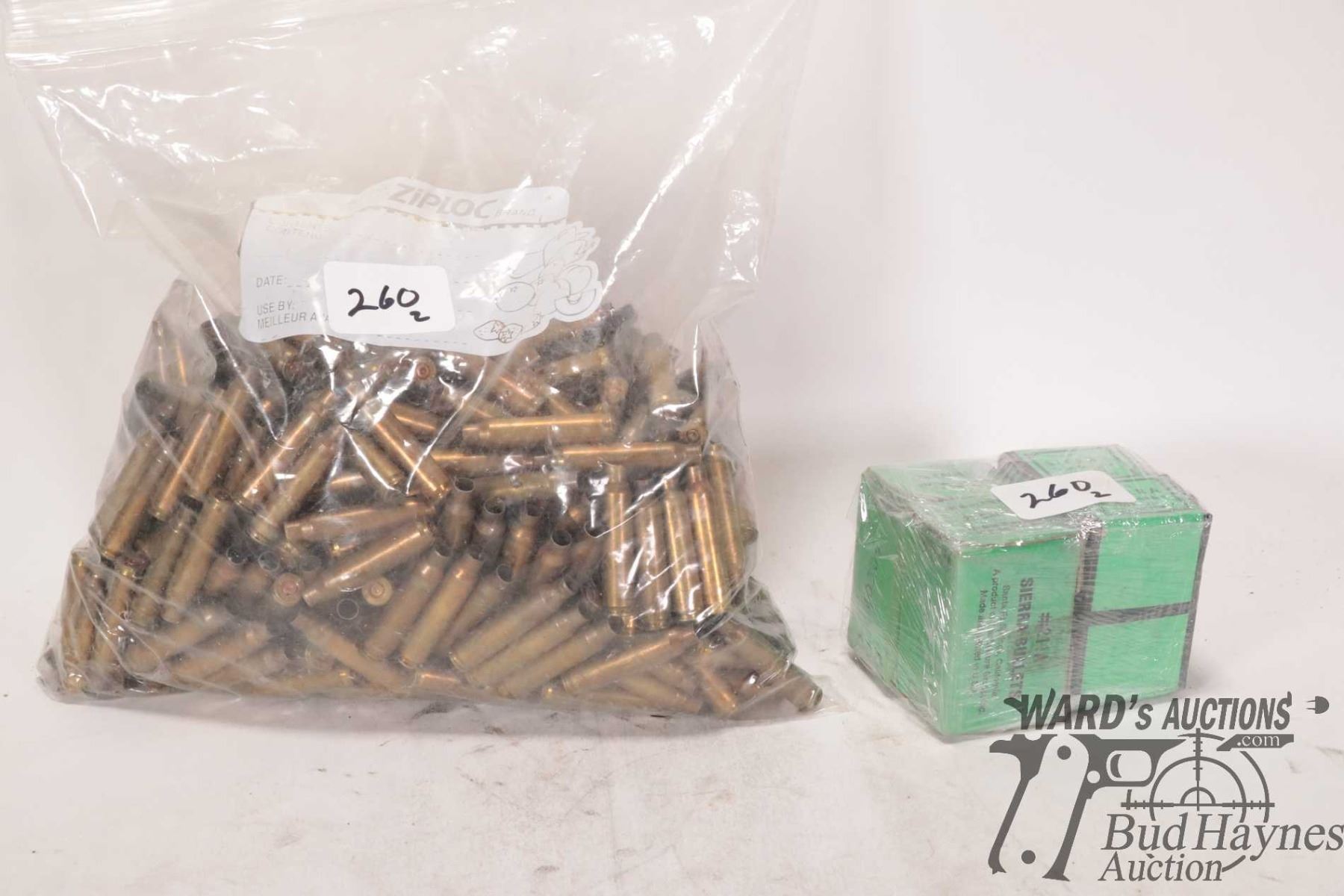 Bag of assorted .223 brass and two full boxes of Bag of assorted .223 brass and two full boxes of 100 Sierra .22 cal 53 gr hollow point and two full 100 count boxes of Sierra .22 cal 63 gr semi pointed