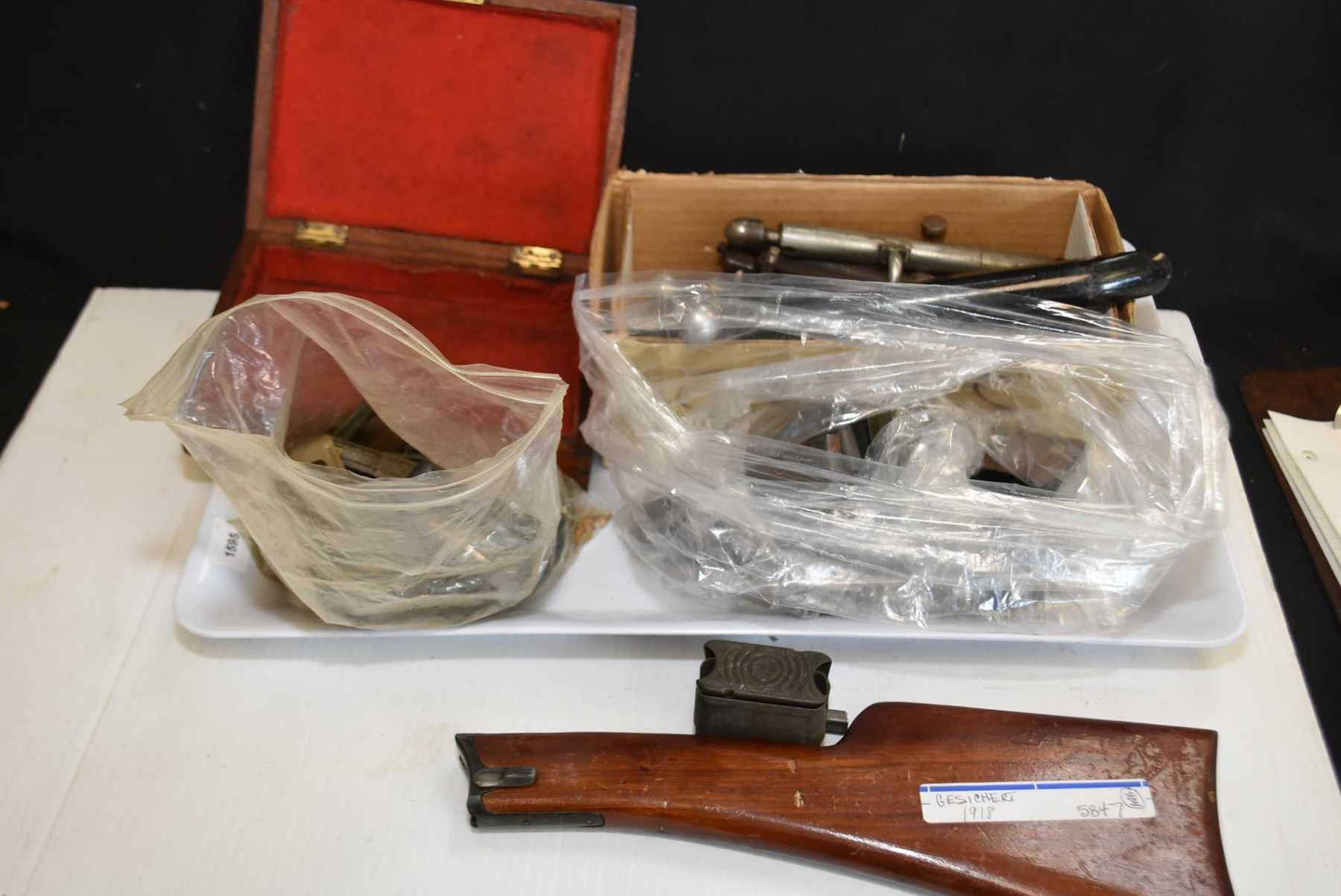 Bag of assorted clips, box of assorted bolts, wooden stock with paper label marked Gesichert 1918 and an antique pistol lock box ( no gun included)