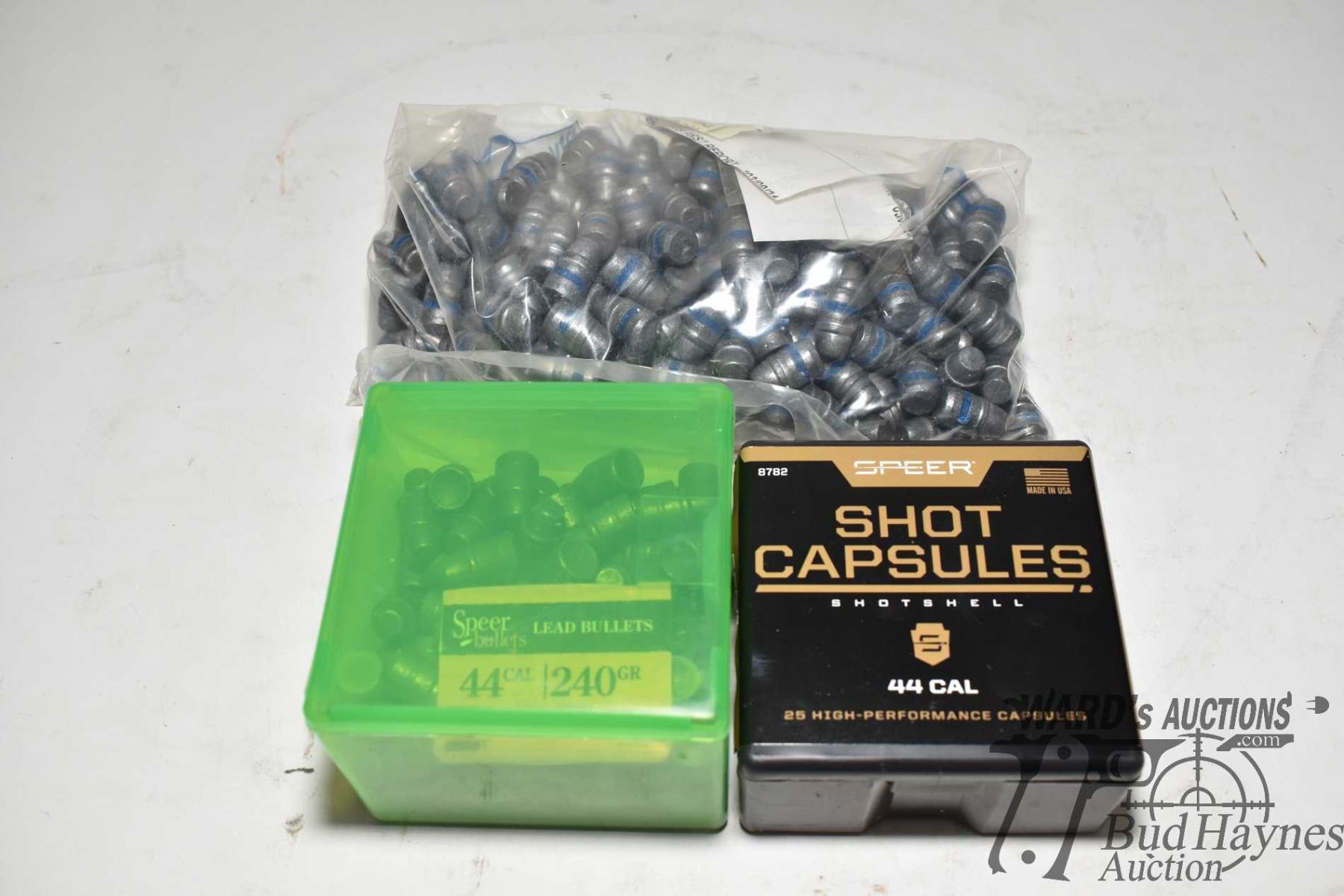 Bag w/ 227 .44 cal 240 gr SWC and plastic box w/ 100 .44 cal 240 gr SWC w/ silicone cover and a box of 50 Speer .44 cal shot capsules