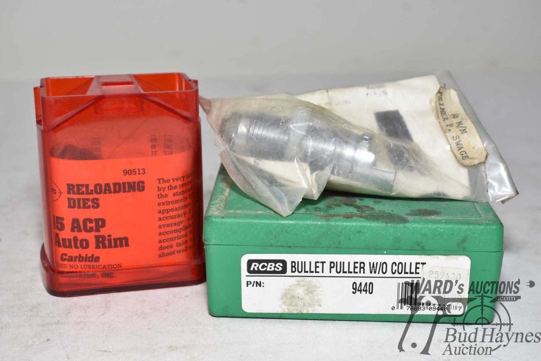 Bag w/ one RCBS bullet puller w/o collet, a 9mm primer swage and a Lee .45 ACP auto rim