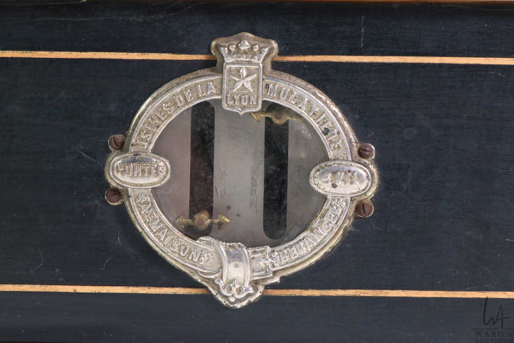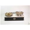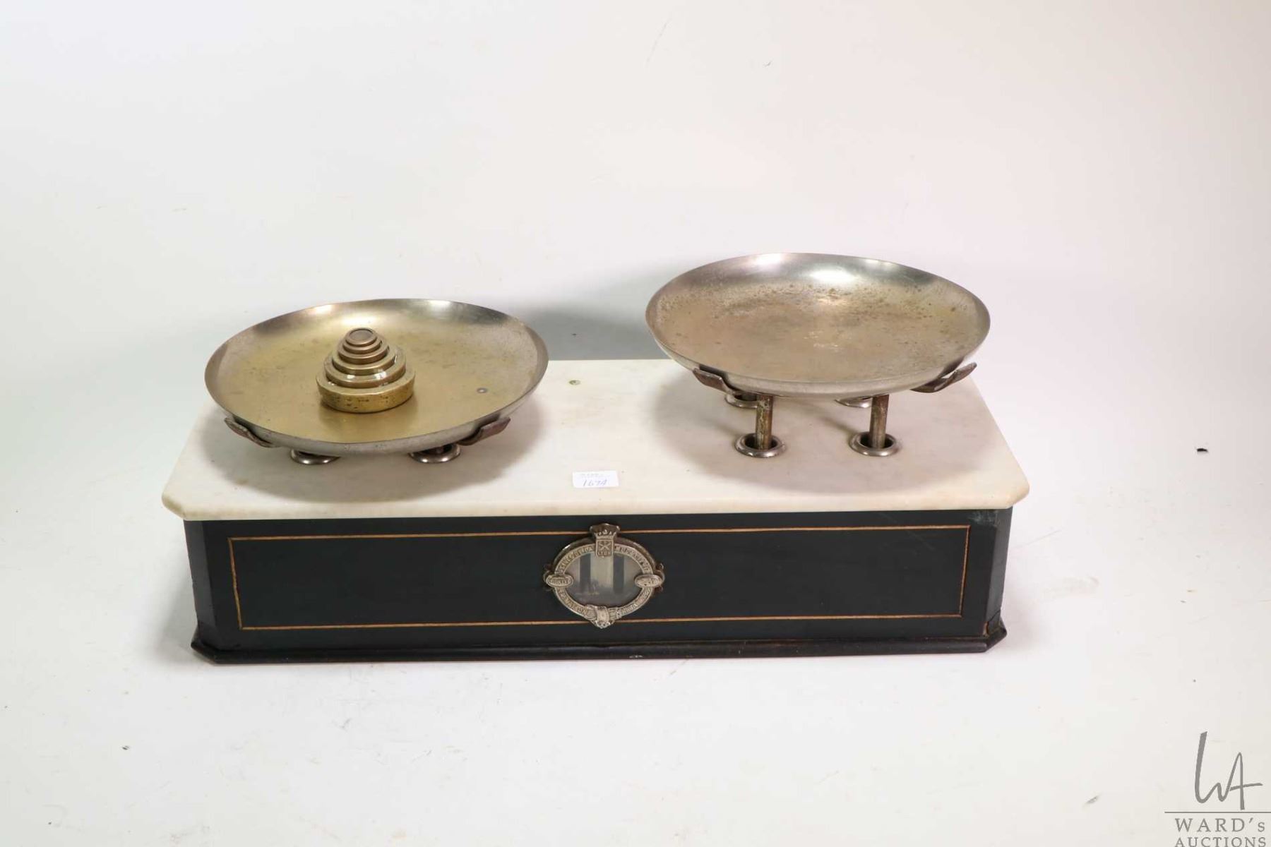 Balance scale contained in wooden box with marble top with double balance indicators in sight glass, includes some weights 19" wide