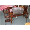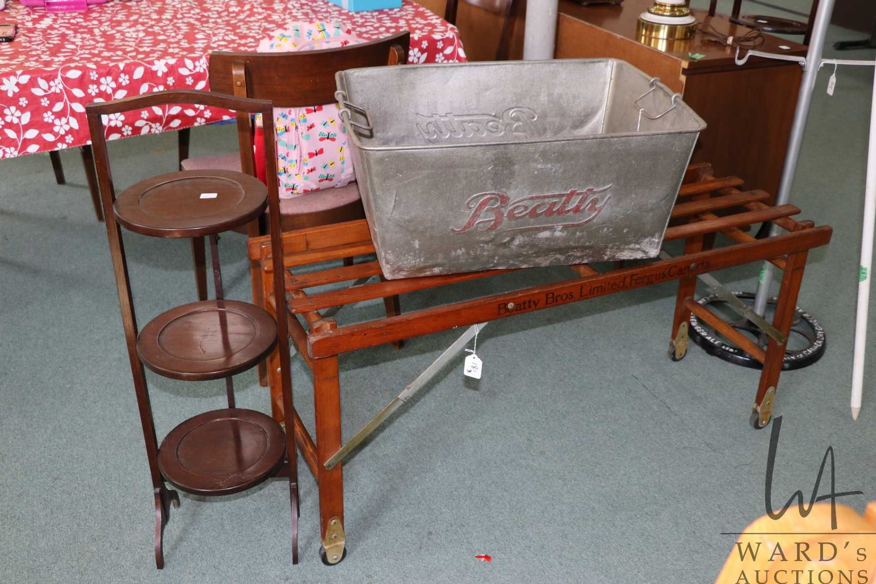 Beatty wash tub, Beatty Bros. folding stand, two gallon canvas water canteen and a folding three tier cake butler