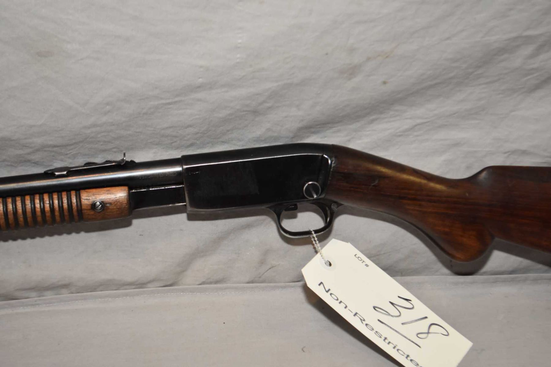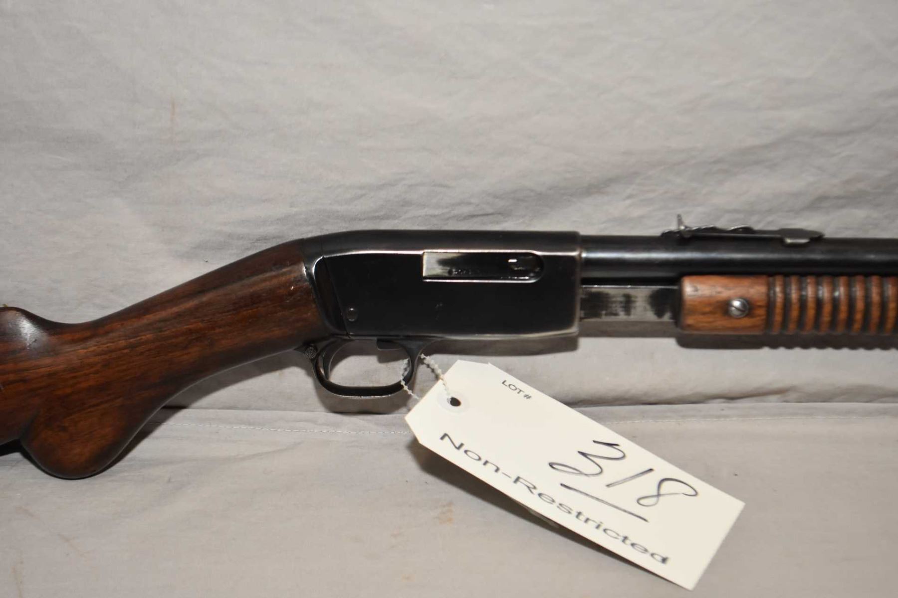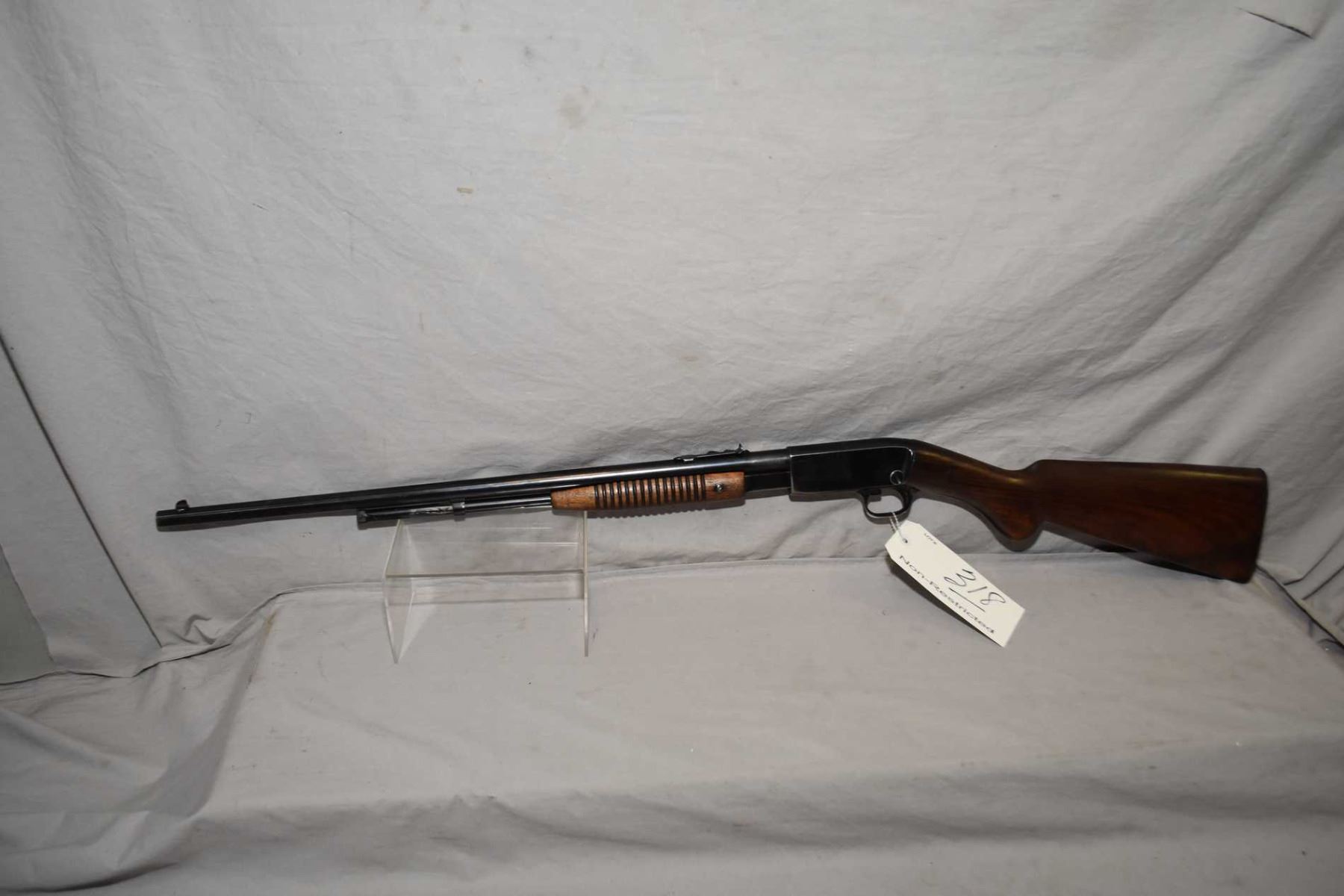 Belgian Browning Model Trombone .22 Long Cal ONLY Tube Fed Pump Action Rifle w/ 22" bbl [ old reblued finish, starting to wear in carry areas, rounded pistol grip stock with grooved forend , metal butt plate, few marks to wood and metal ] Ser # 12093
