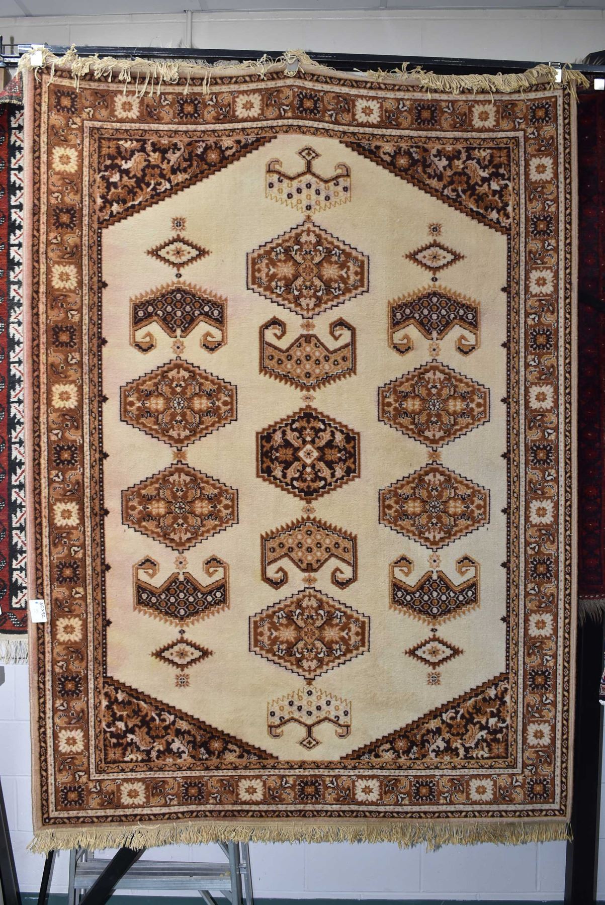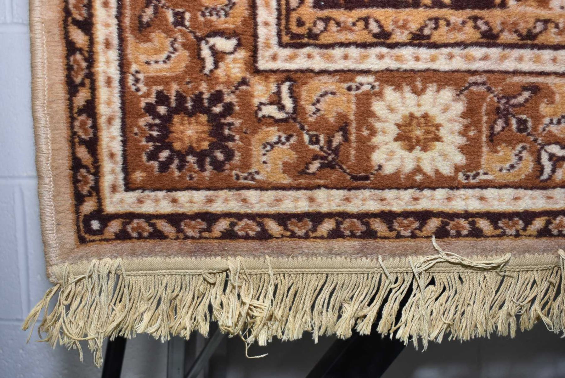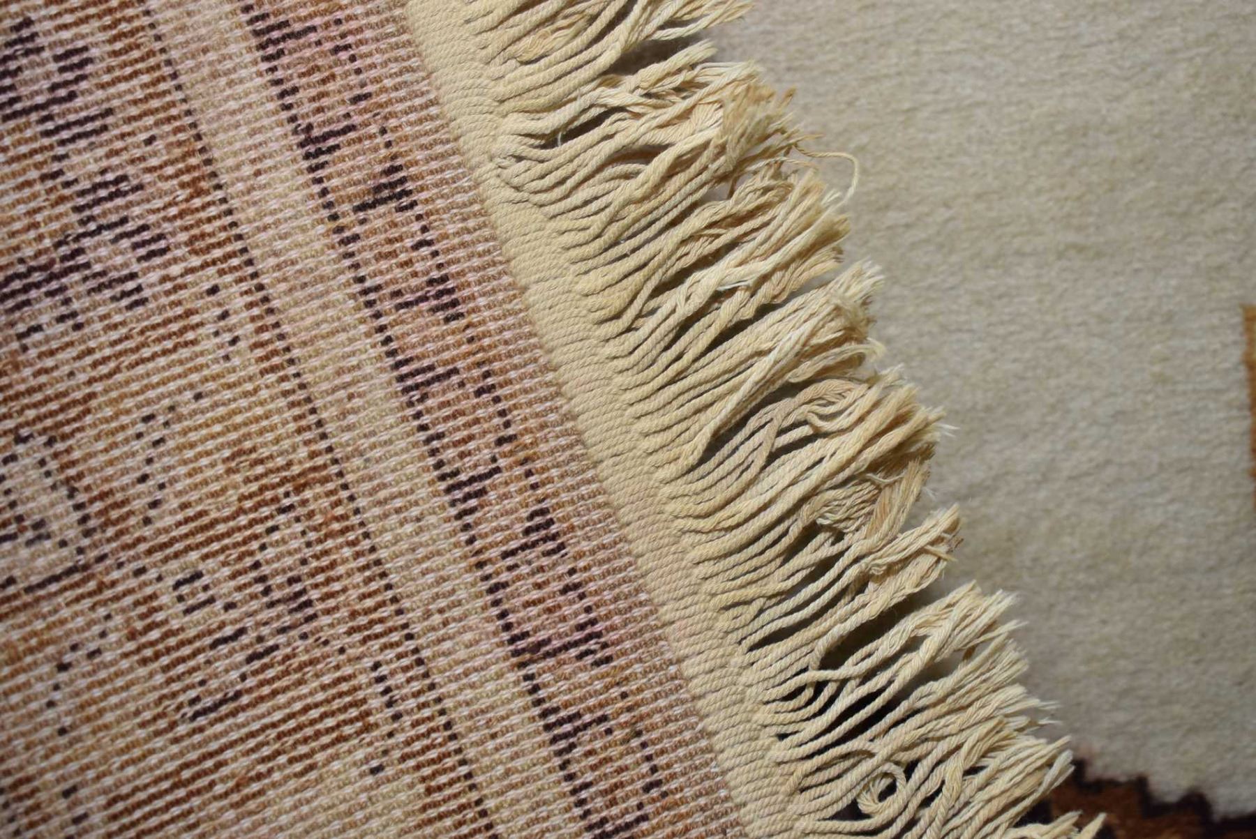 Belgian made 100% pure wool area carpet with geometric pattern, cream background and multiple borders, highlights of taupe, copper, brown etc. 65" X 92"