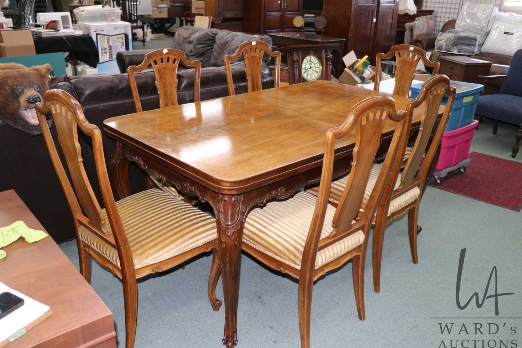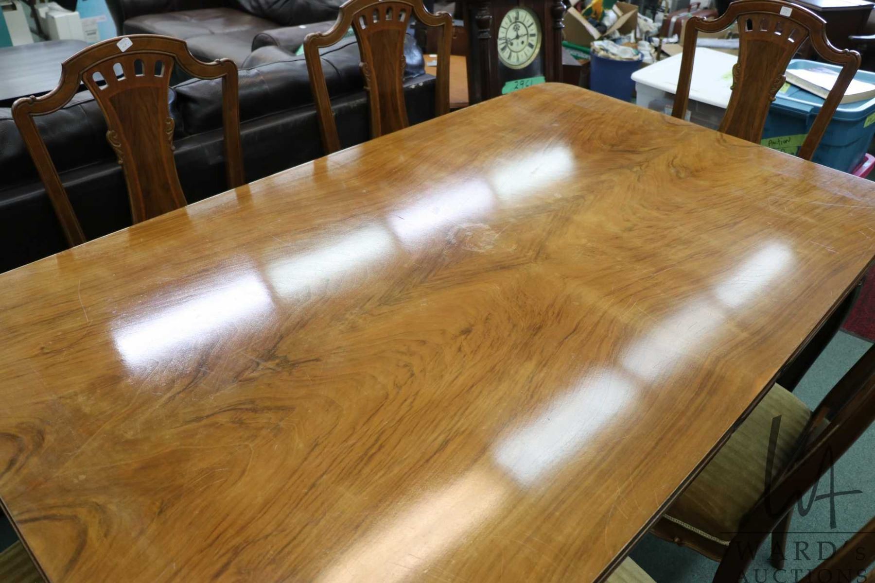 Belgian walnut dining suite including 39" X 63" table with two 25" draw leaves, six dining chairs wi