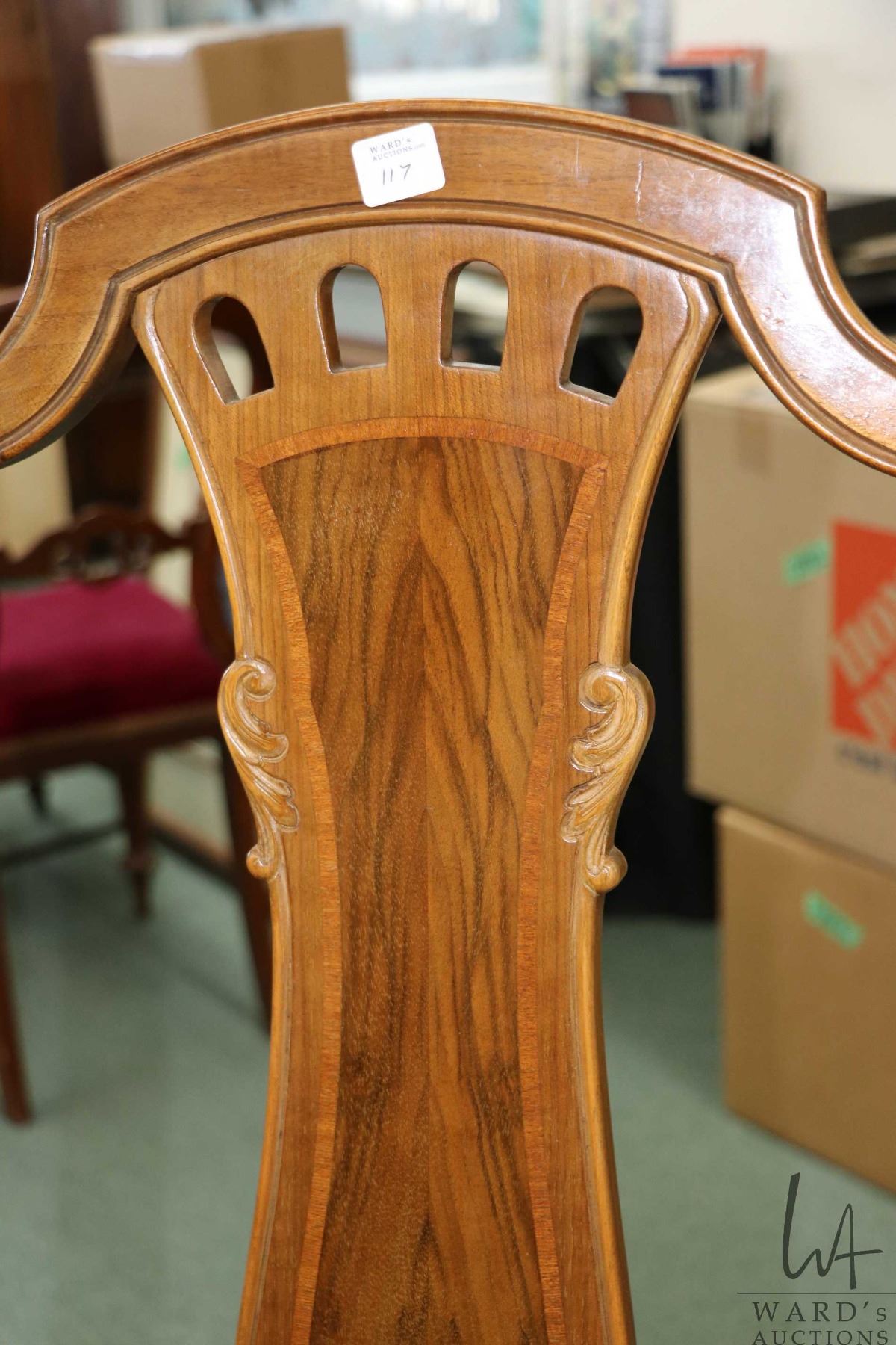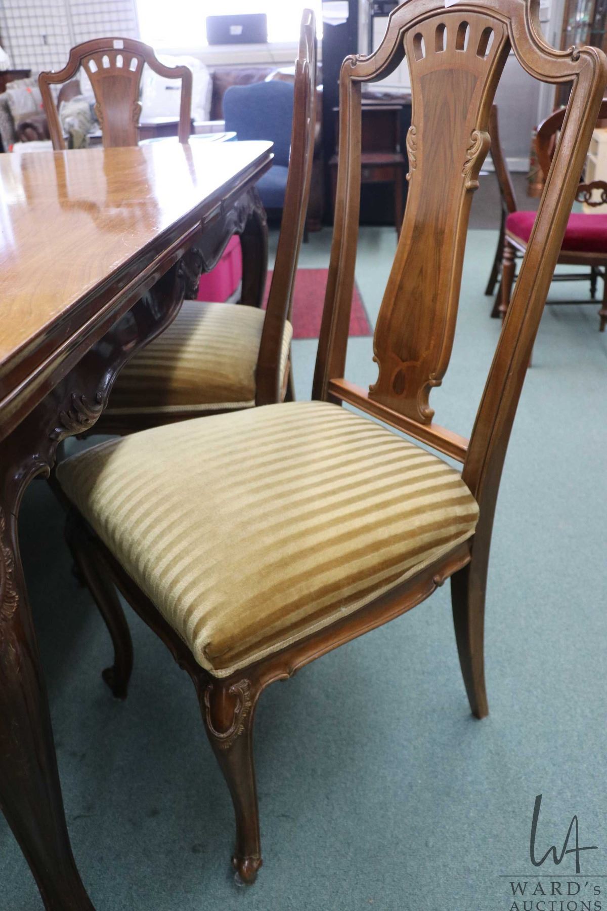 Belgian walnut dining suite including 39" X 63" table with two 25" draw leaves, six dining chairs with inlaid backs and matching scroll feet and golden stripped velvet upholstery, circa 1940