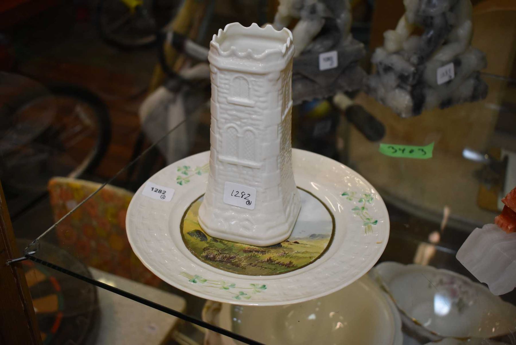 Belleek Thonond Tower and a Belleek plate hand painted and signed R.B. Higgins
