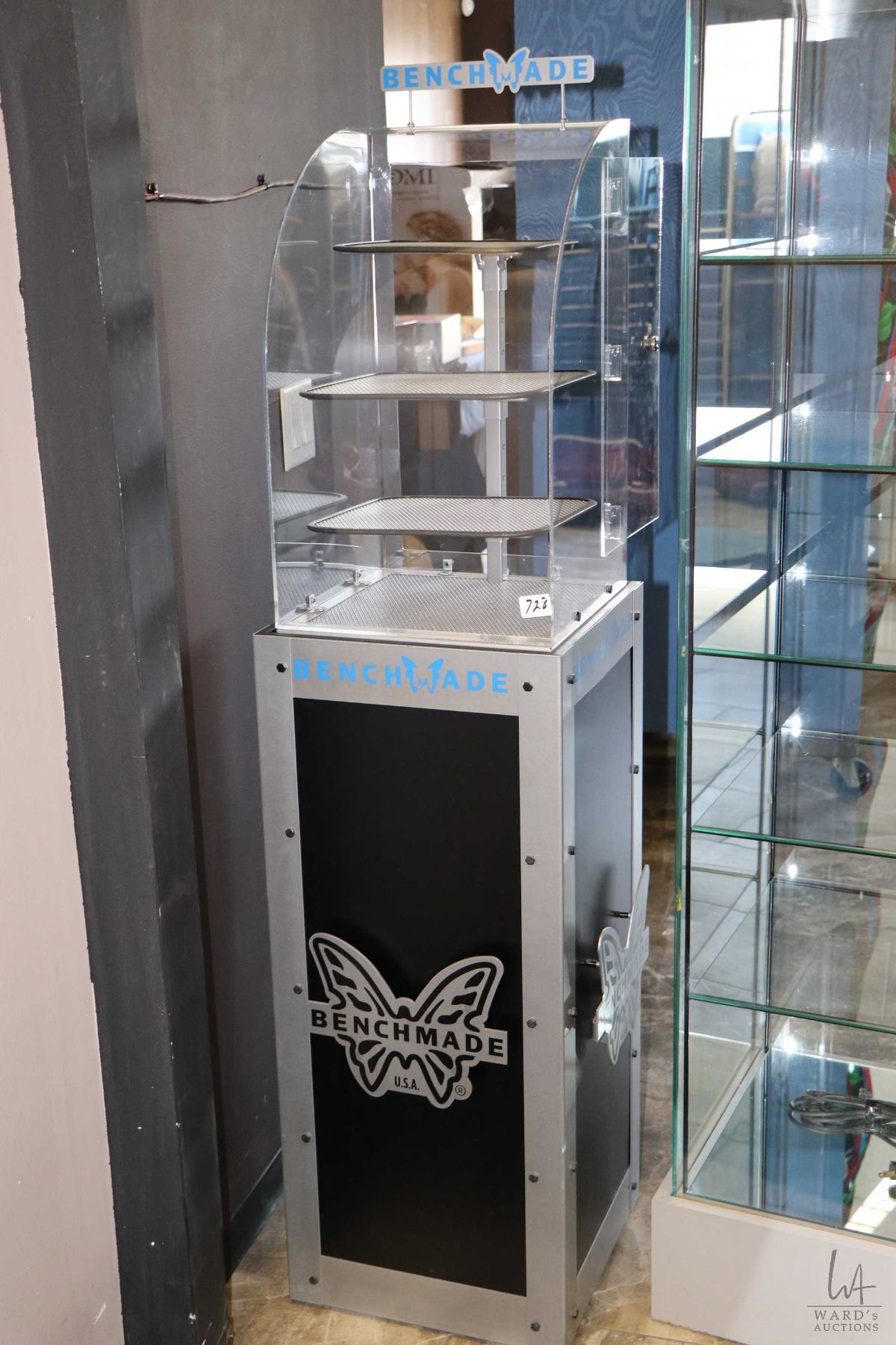 Bench Wade retail display cabinet with cabinet base 15.5" X 15.5" X 37" and curved plexiglass upper cabinet with three shelves 14" X 14" X 23" NO KEY