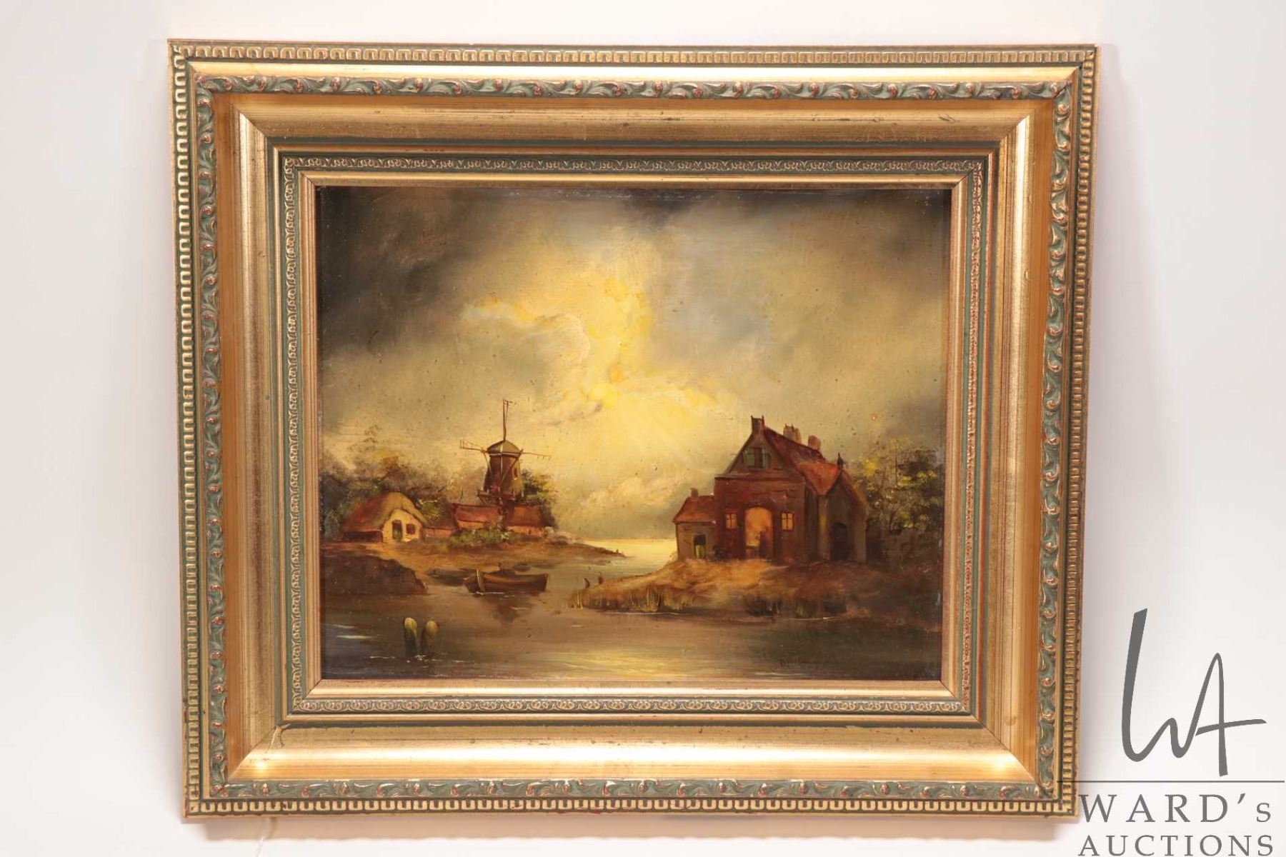 Berger gilt framed oil on board painting of a Dutch windmill and forge scene, artist signed, 9" X 11 1/2"