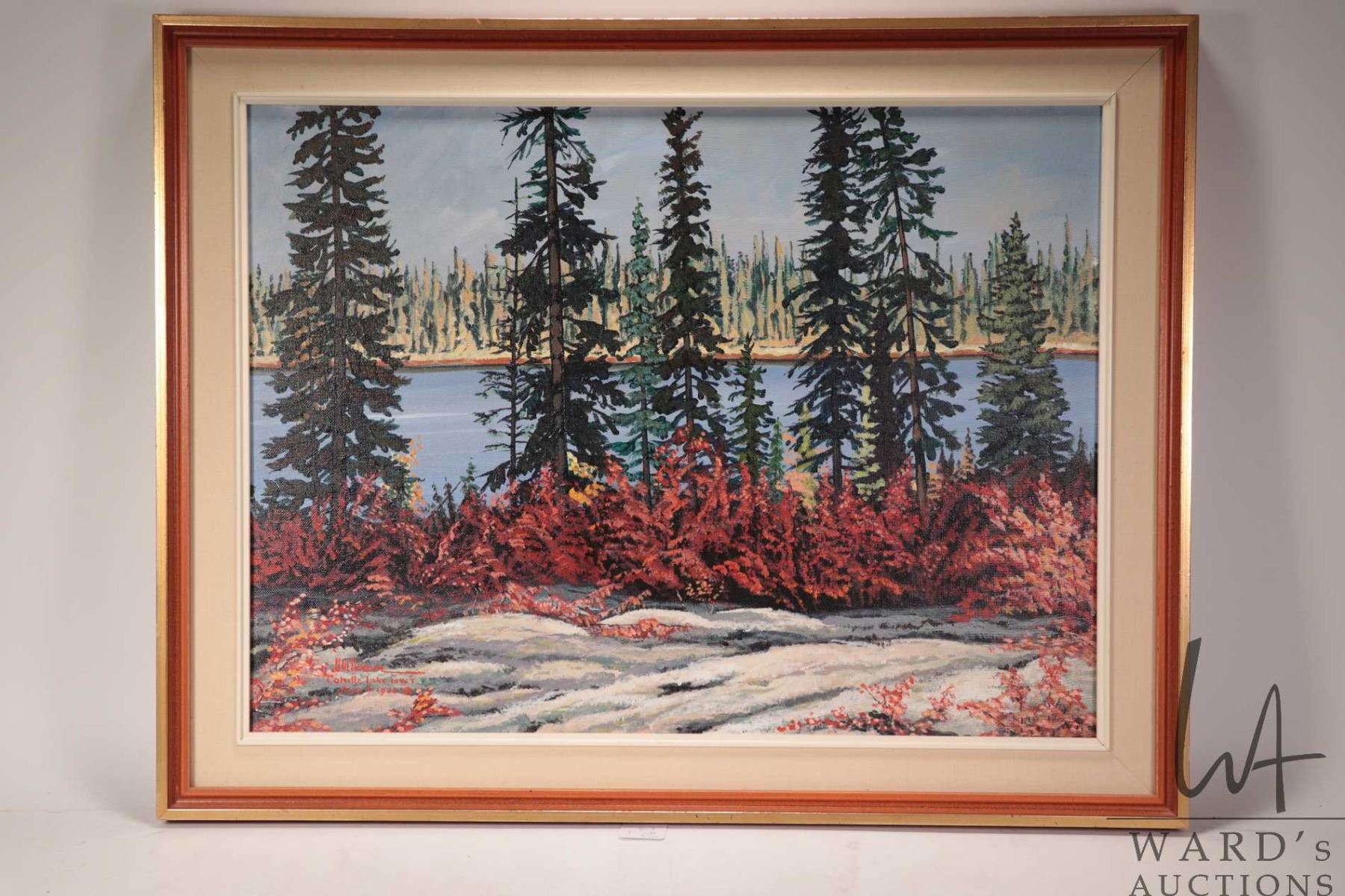 Bern Will Brown framed acrylic on canvas painting, titled on verso "Black Spruce 1988" 18" X 24". Note: Not available for shipping. Local pickup only
