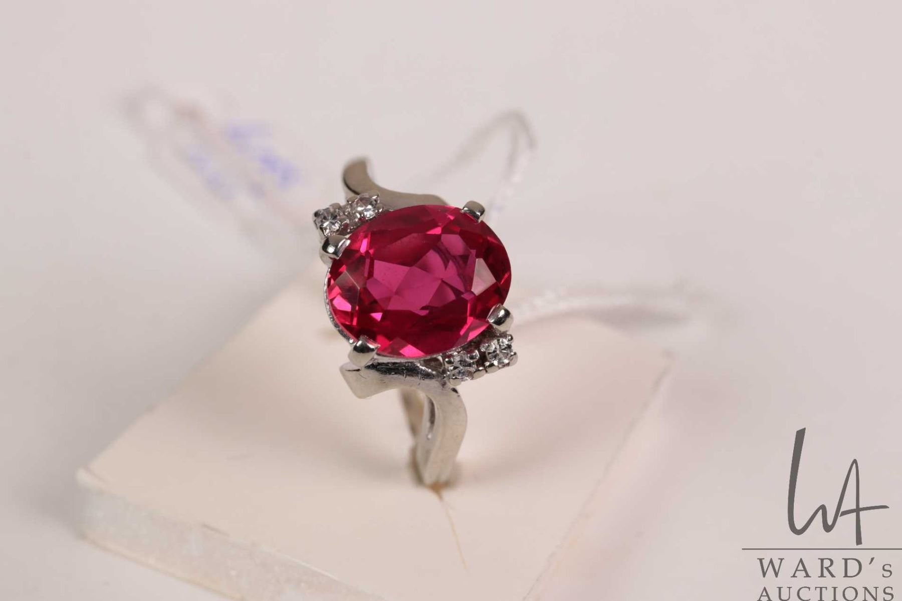 Birks 10kt white gold ring set with oval synthetic ruby gemstone and four single cut accent stones