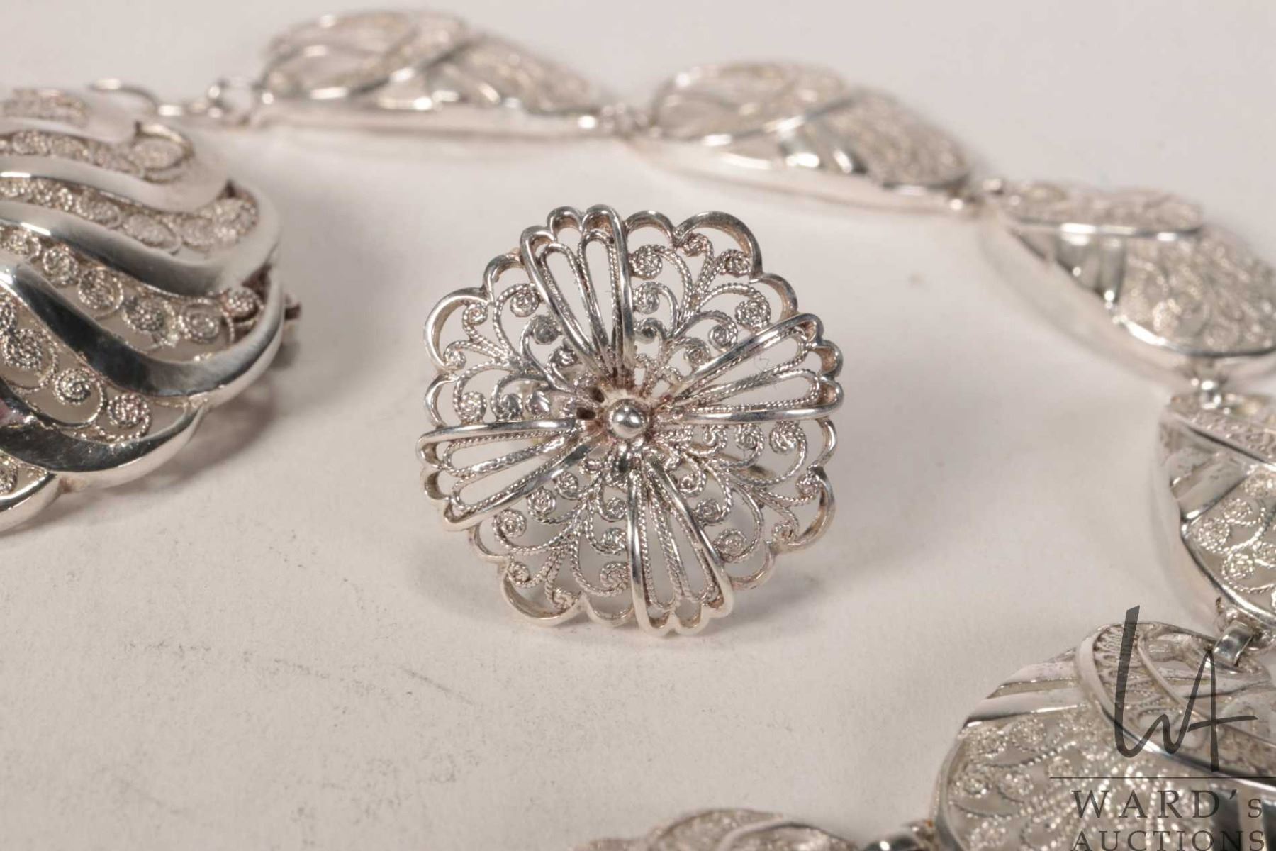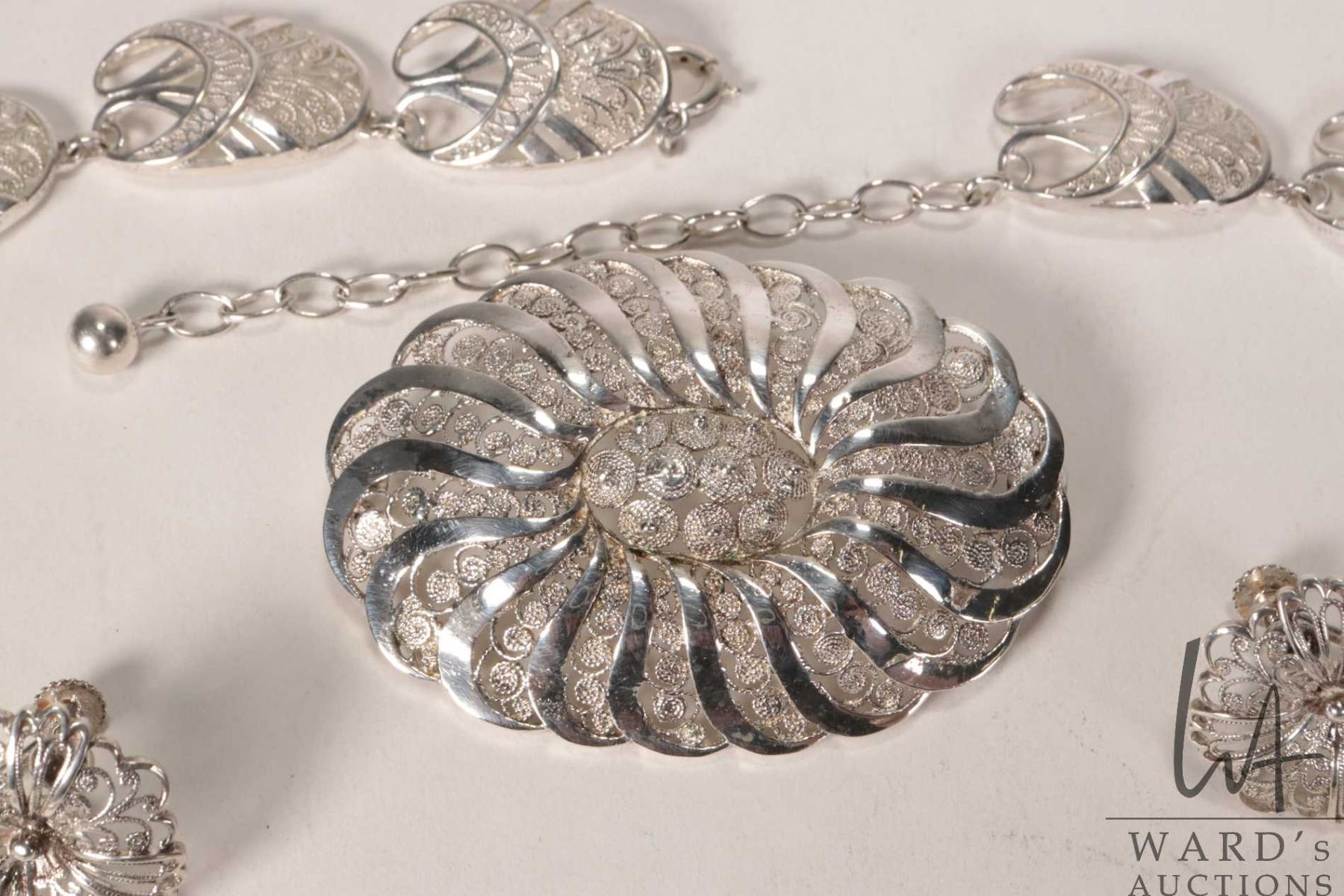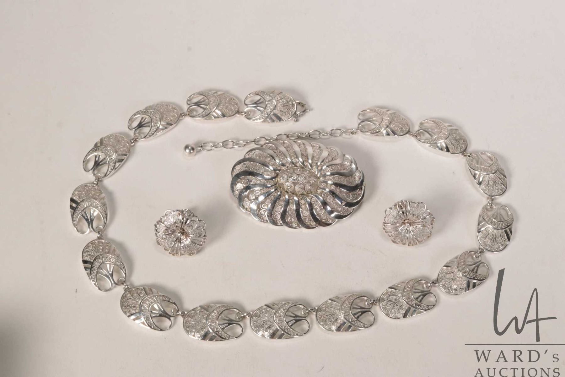 Birks sterling silver jewellery including 15"-16" filigree necklace, brooch and earrings