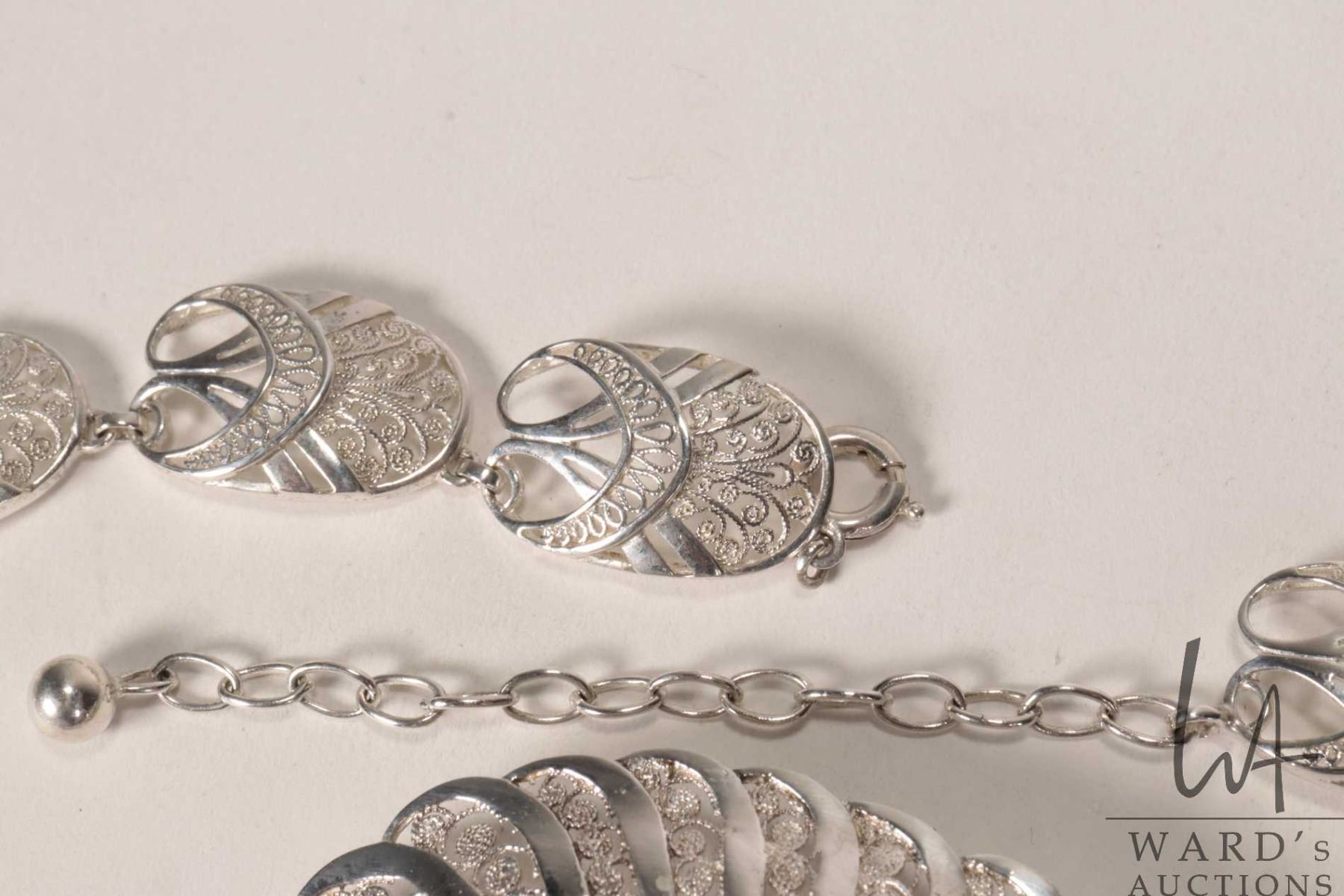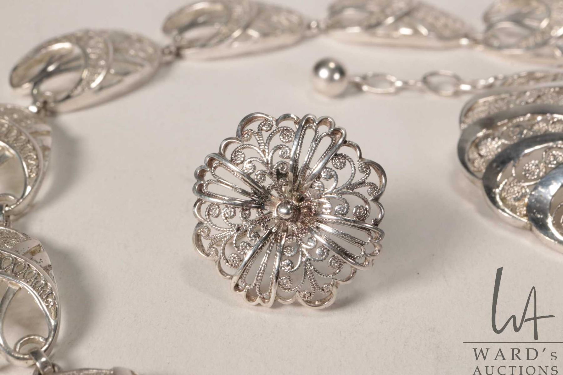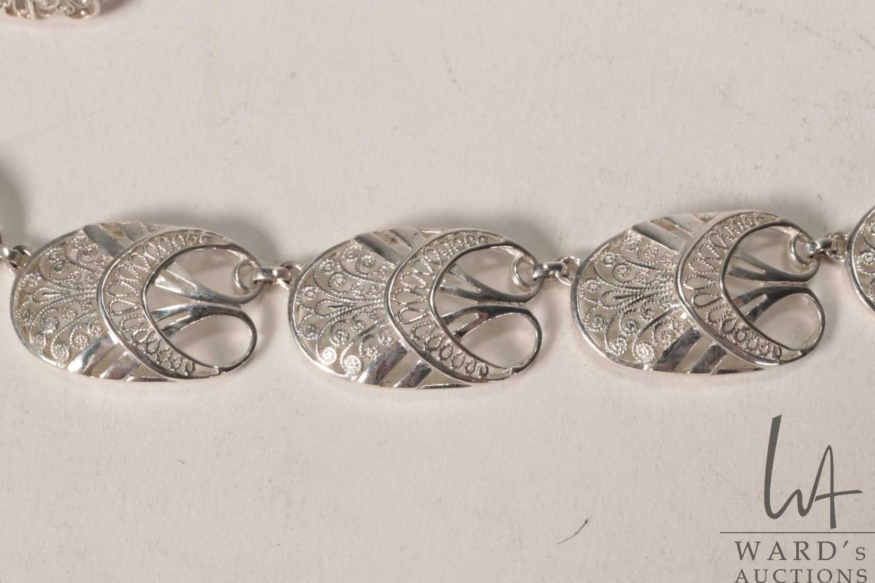 Birks sterling silver jewellery including 15"-16" filigree necklace, brooch and earrings