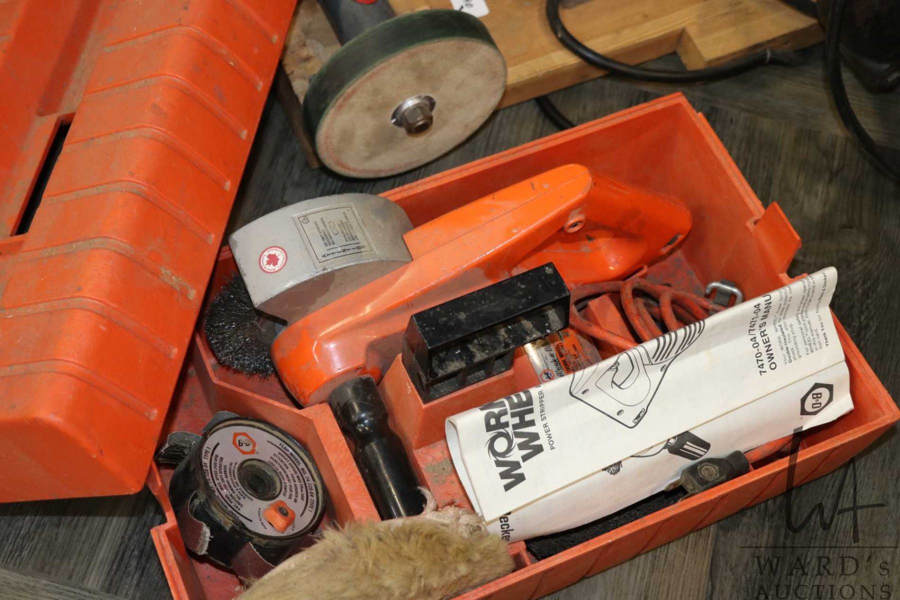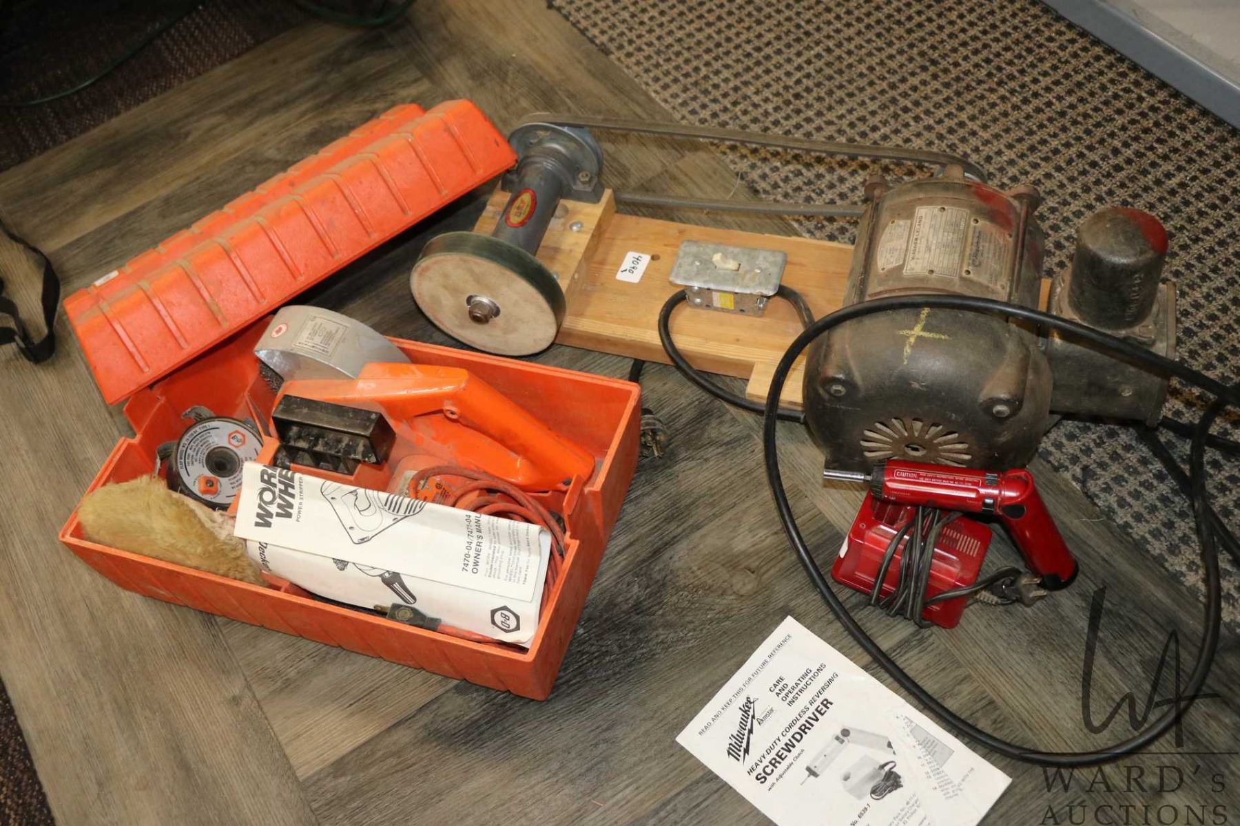 Black & Decker work wheel with attachments, Milwaukee cordless reversing screwdriver with charger and a plastic carrying case plus a homemade grinder with wax polishing wheel, all working at time of cataloguing