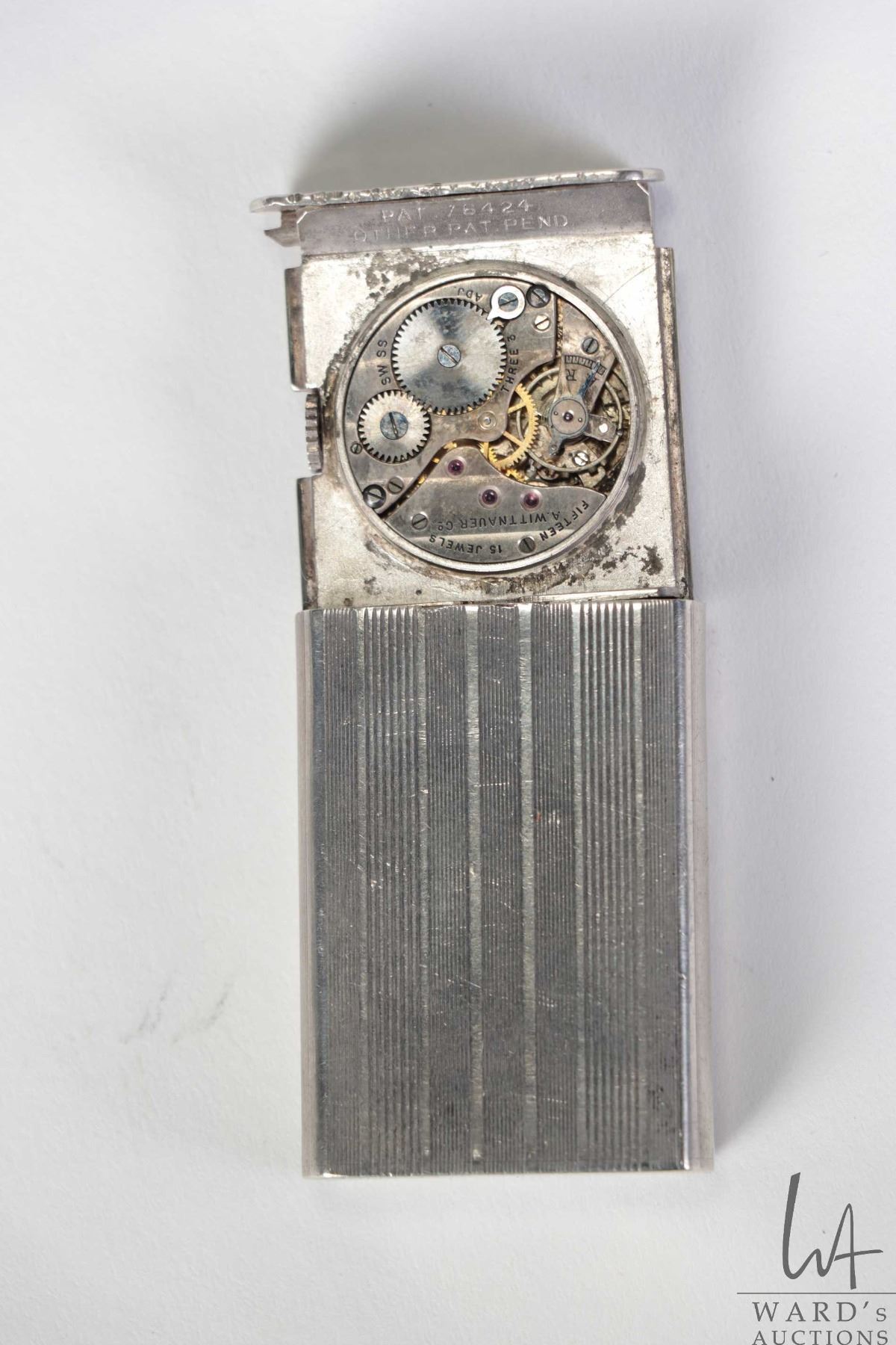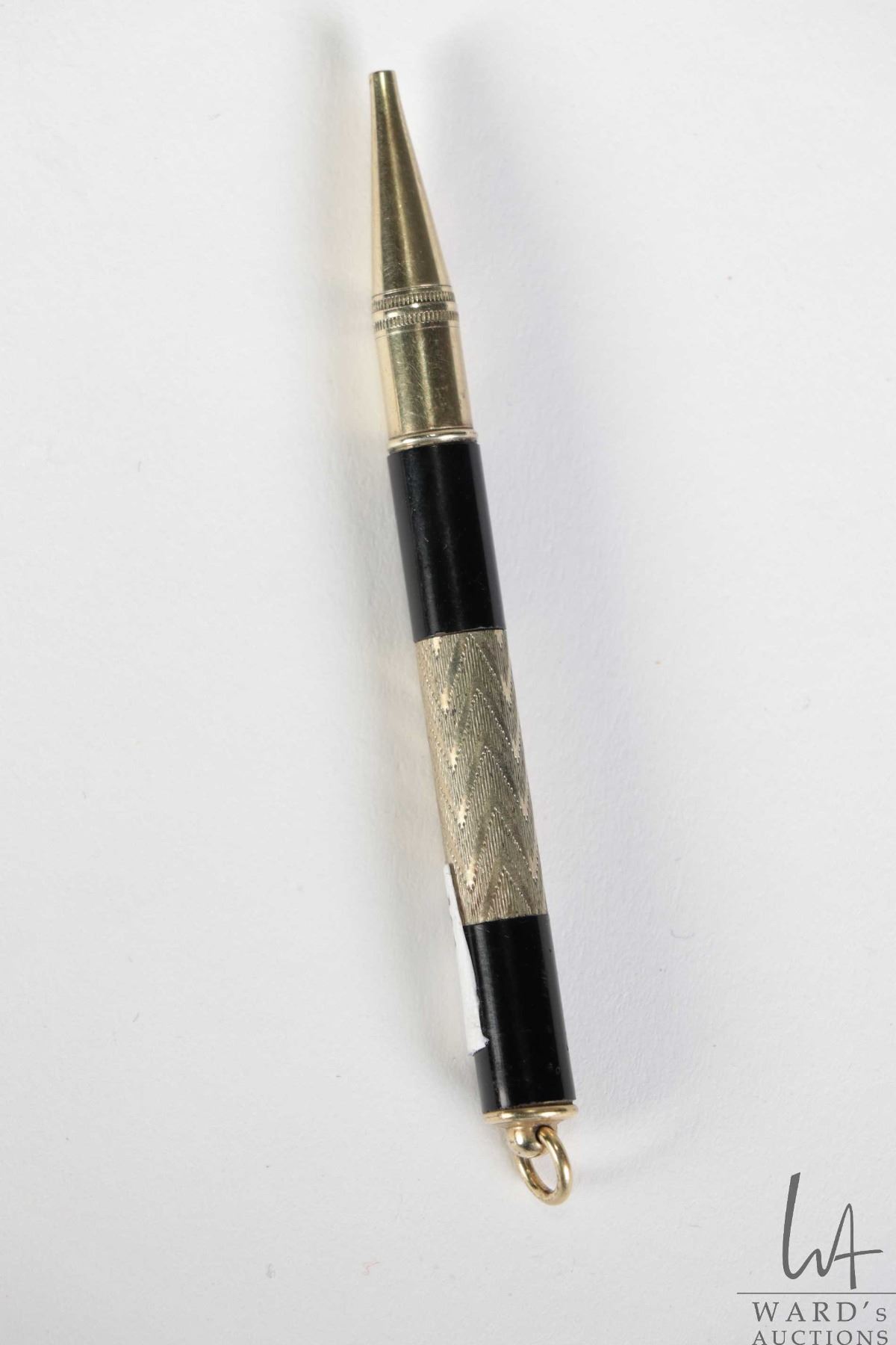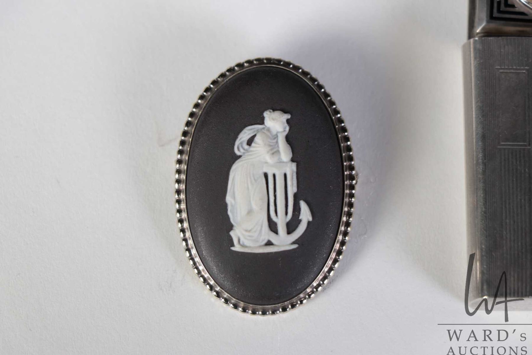 Black Wedgwood Jasperware brooch in silver bezel, Art Deco Wittnauer travel clock, not working at time of cataloguing and a mechanical pencil