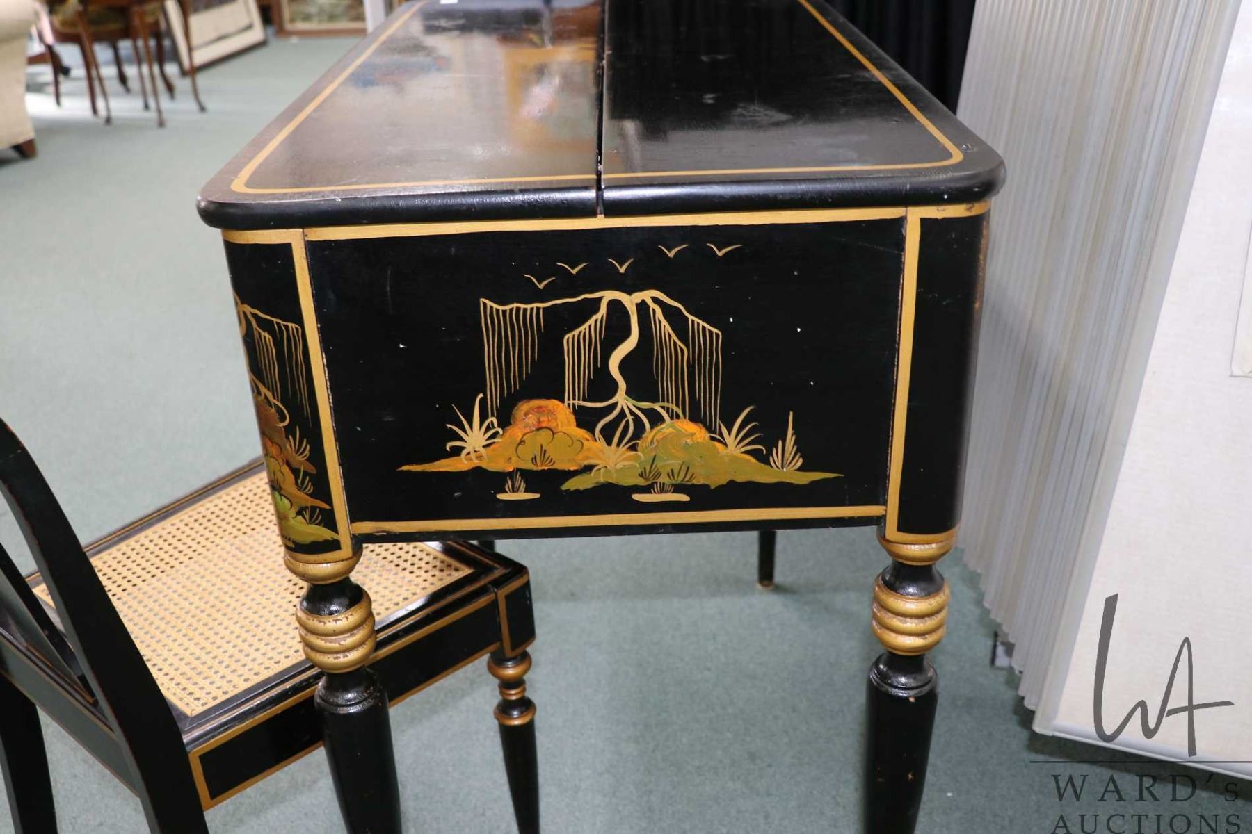 Black lacquered Chinoserie spinet desk with flip up top, pull out writing surface and fitted interior, plus matching chair, 33" H X 35" W X 19" D