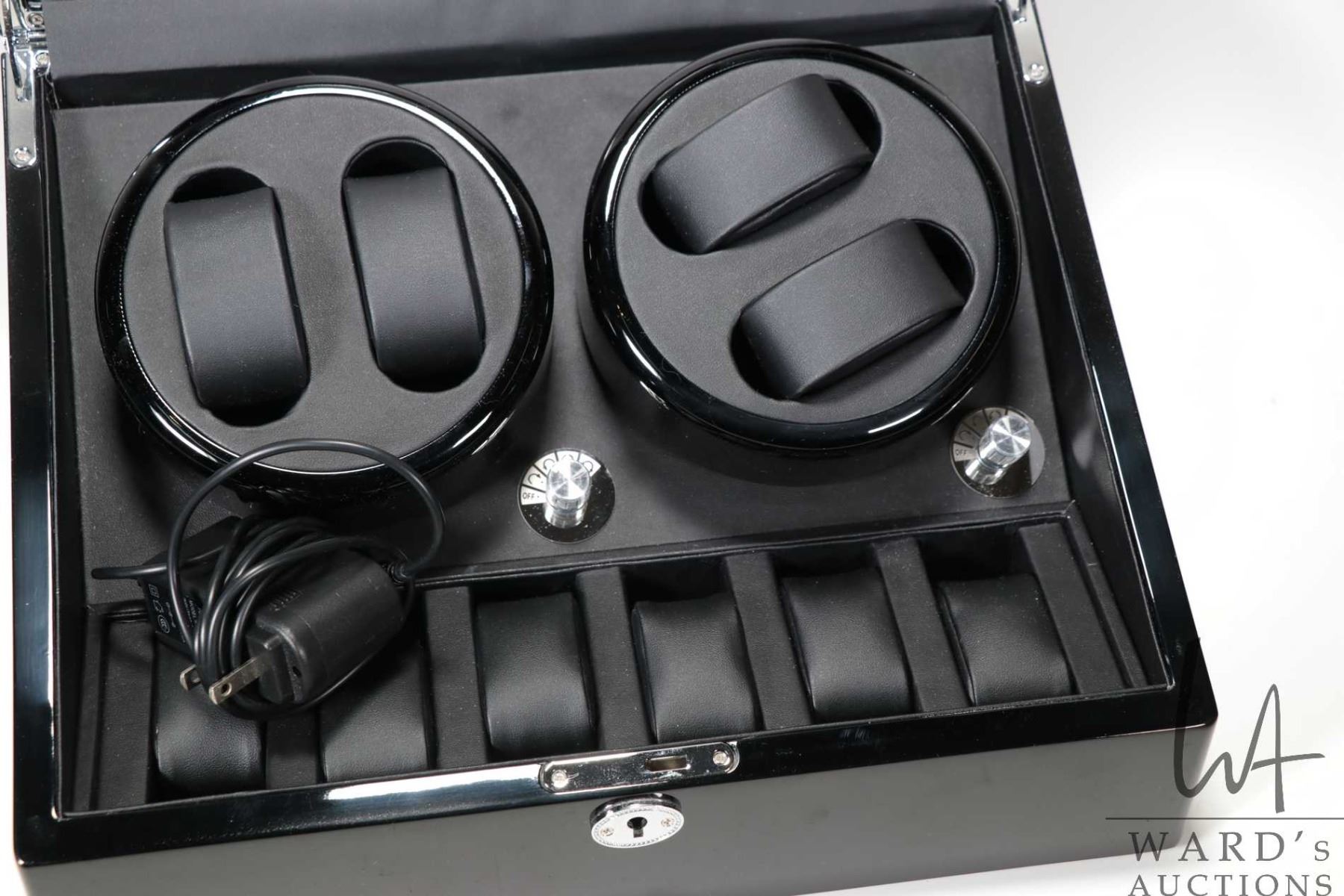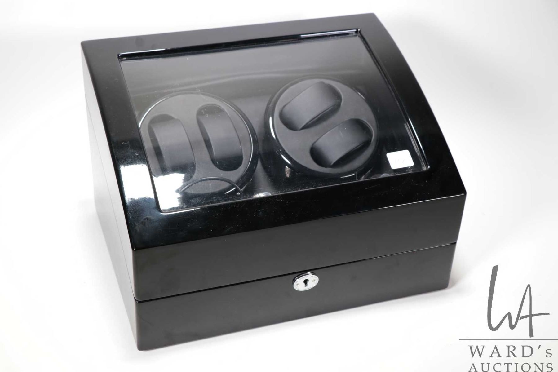 Black lacquered wooden automatic watch winder with glass top and quad winders, storage for six watches, electric with battery back-up
