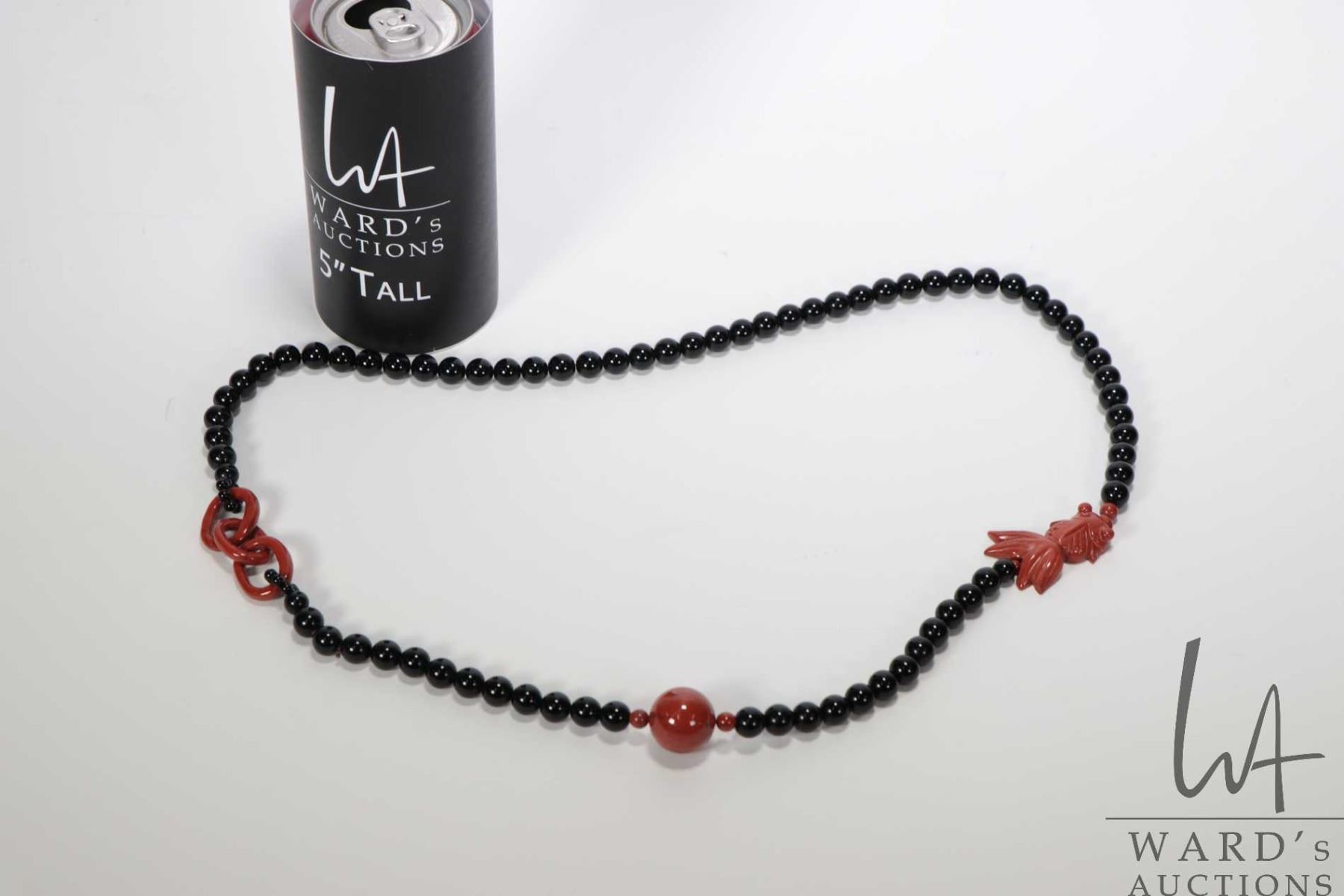 Black onyx beaded necklace with red jasper Koi, 32" in length