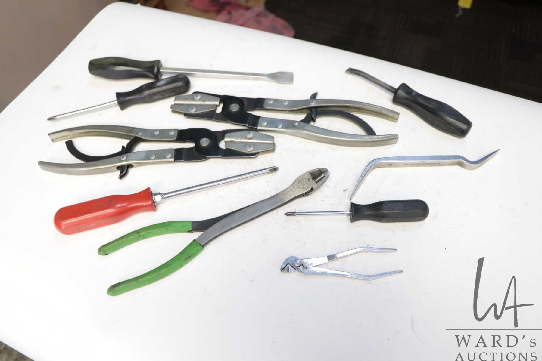 Blue Point hose pliers, Snap-On scraper, pry bar and brake adjusting tools, Mac Tools set of side cutters with long handle, small channel lock pliers plus three Philips screwdriver bits