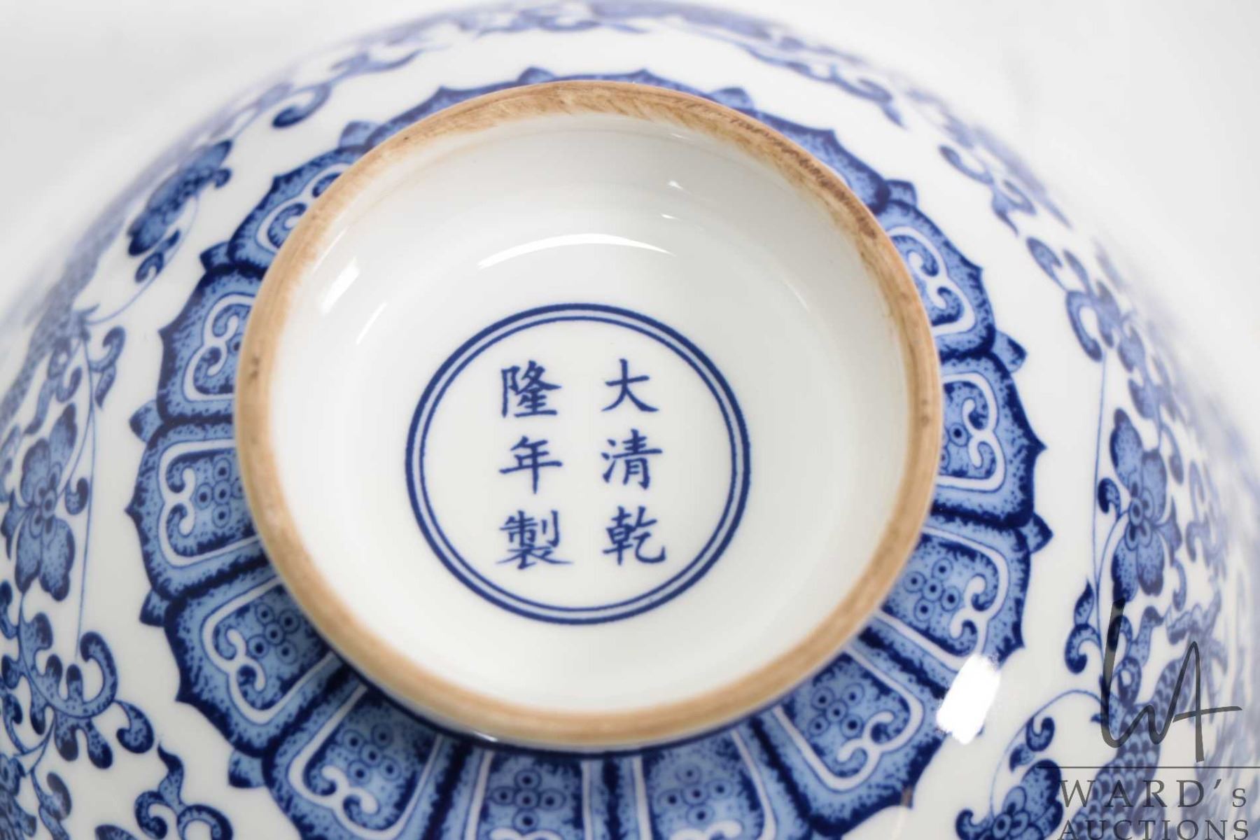 Blue and white Dragon Branch bowl with Chien Lung reign mark 5" in diameter plus a blue and white hand painted flower pond dish 8 3/4" in diameter