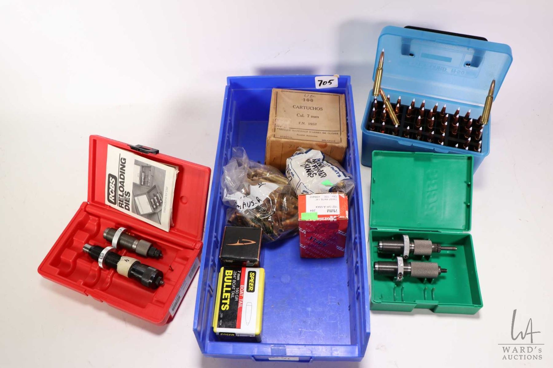 Blue plastic box and contents including pale blue ammunition box with 7mm X 57 160 grain reloads, a Forster 7X 57 Mauser die set, a RCBS 7 X 57 Mauser die set, plus a box of 49 count 7mm ammunition and a selection of 7mm brass and lead.