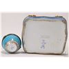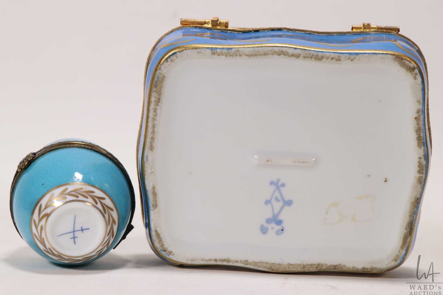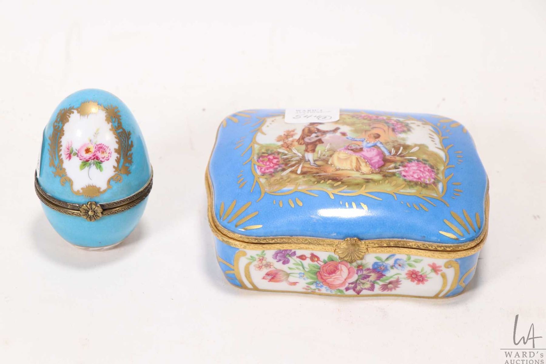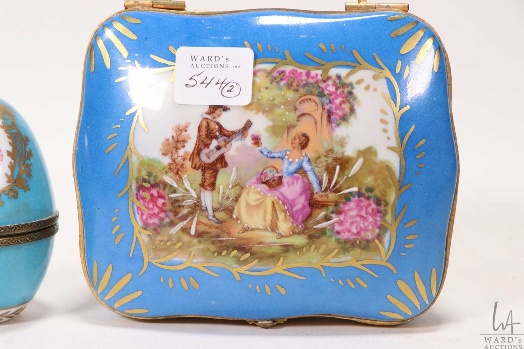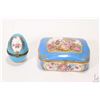 Blue porcelain Sevres style lidded jewellery casket with hand painted gilt detailing and a Meissen style blue porcelain etc.