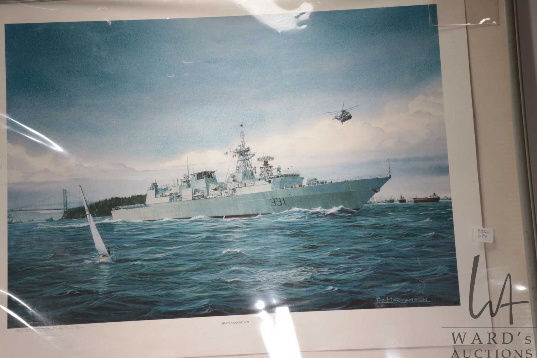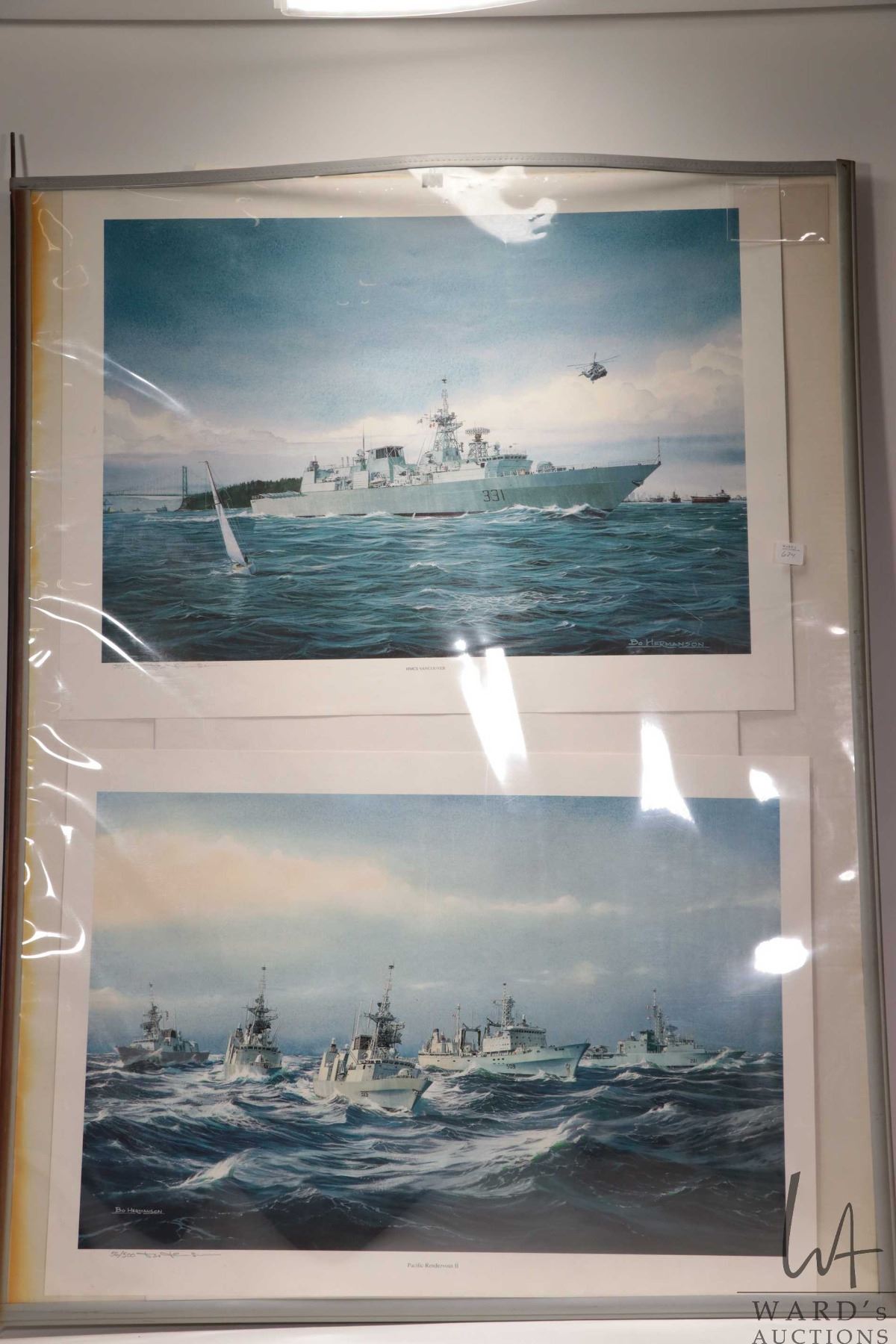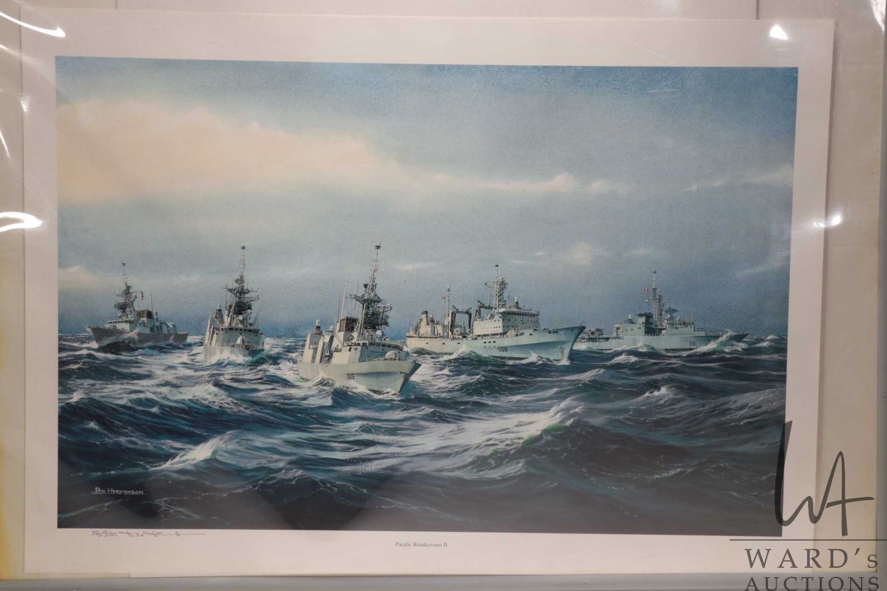 Bo Hermanson, two unframed limited edition prints including "HMCS Vancouver" 30/331 and " Pacific Rendezvous II" 56/500, both pencil signed by artist. Each 19" X 25" overall dimensions. Includes folio envelope