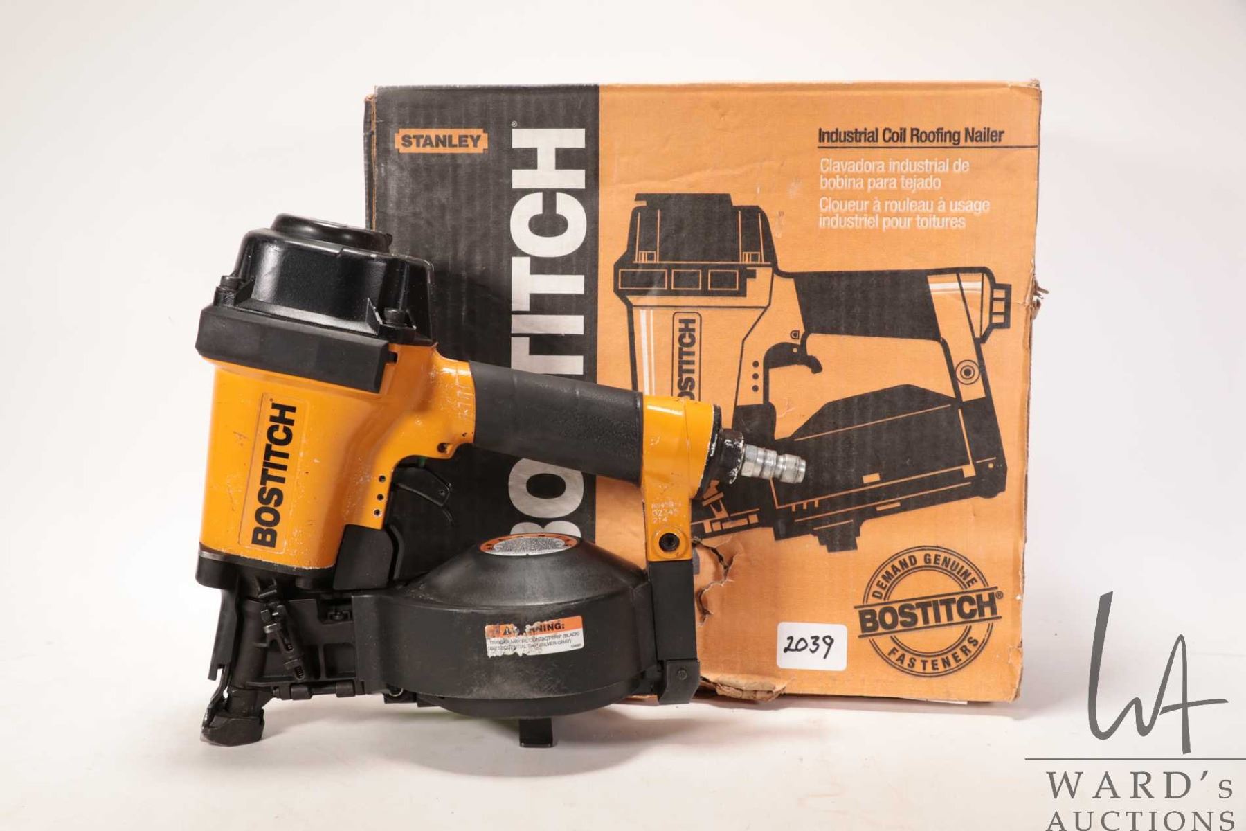 Bostitch RN45B-1 industrial coil roofing nailer w/ box and nails. Working at time of cataloging