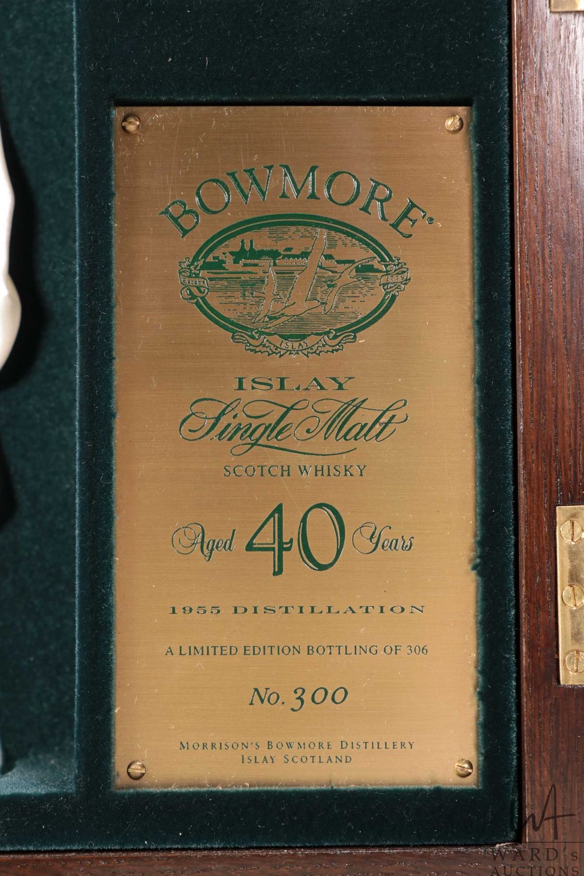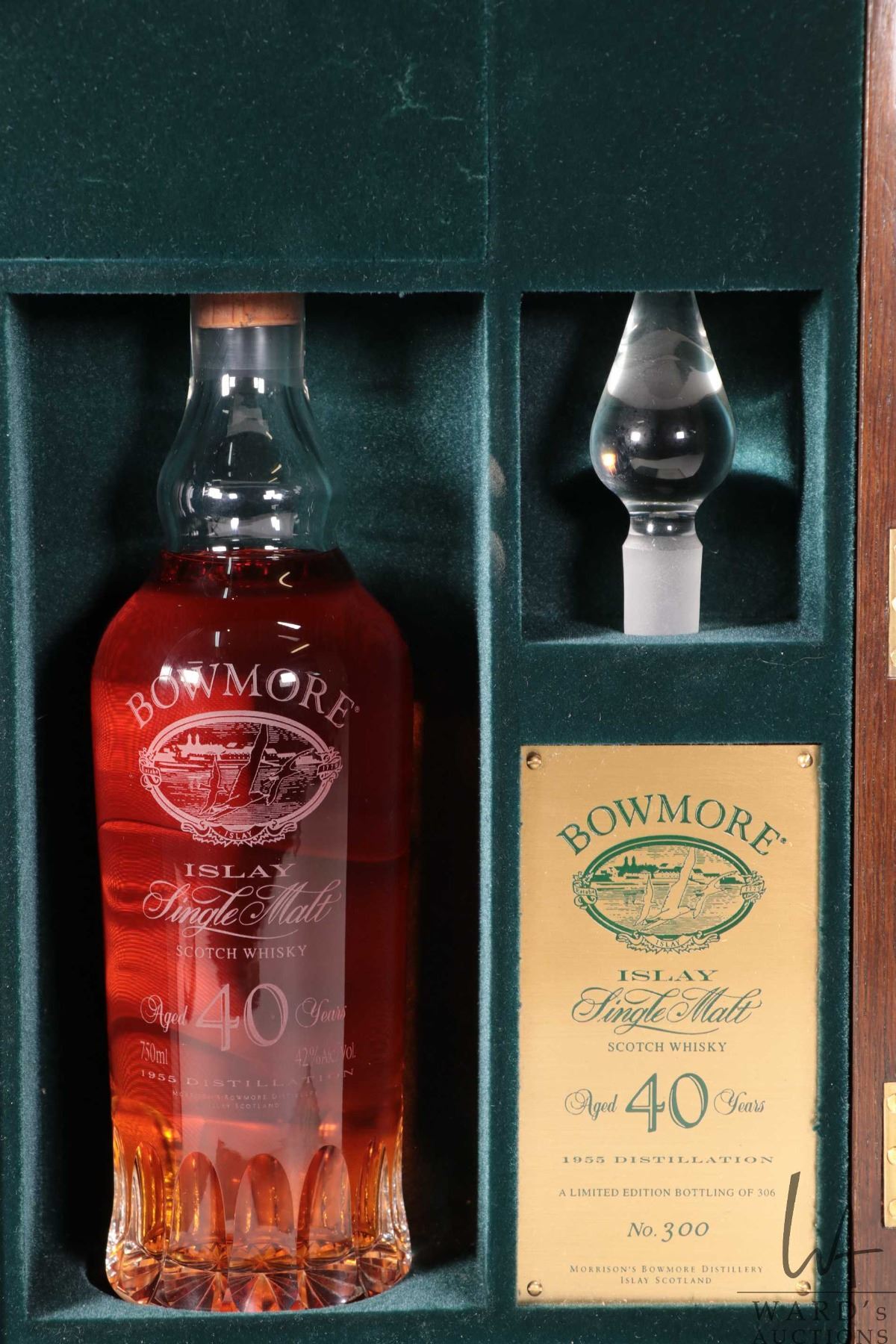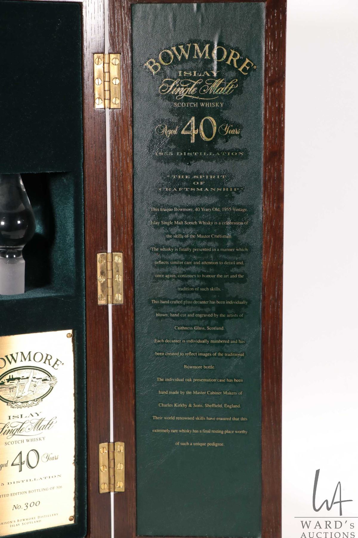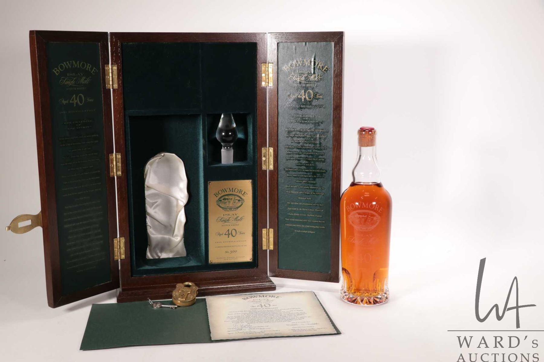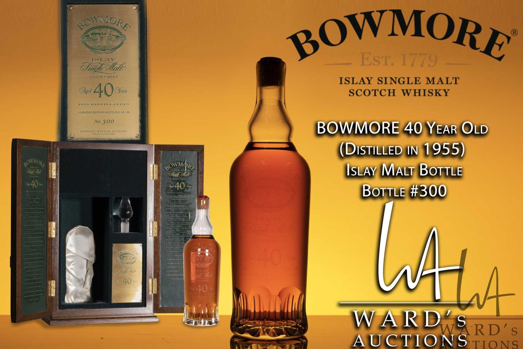 Bowmore/ Rare 40 Year-Old/ Single Malt Scotch Whiskey / 700ml/ 42% ABV This limited edition package is bottle number 300 of a total edition of 306 and only 294 issued to the public. You'll find very few on sale to the public today and research indicates that there are only two bottles known to be in Canada. Not only is it in the oak display case, with crystal bottle and stopper, you also get the certificate of authenticity, original pad lock with key and the original shipping packaging. This bottle has only had one owner since leaving the Bowmore distillery. This whisky was distilled on November 22nd, 1955, first in a bourbon hogshead for twenty years and then moved to a sherry cask. Bottled in 1995. Ward's Auctions will store this bottle for up to six months for foreign buyers to arrange for export brokerage. Insurance during that time will be the responabilty of the buyer and Ward's Auctions will accept no responsibilty for damage or loss during that time. Although every effort will be made to keep it safe. Note: Alcohol cannot be insured by any courier in Canada. Local pick up is recommended. Canadian bidders only