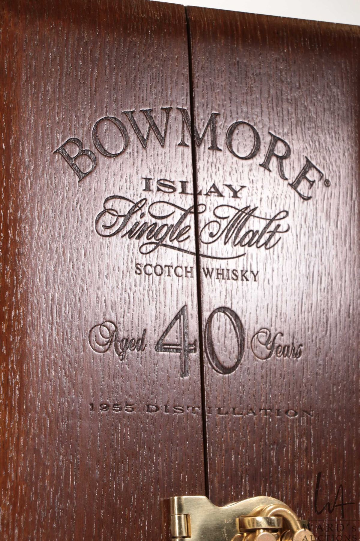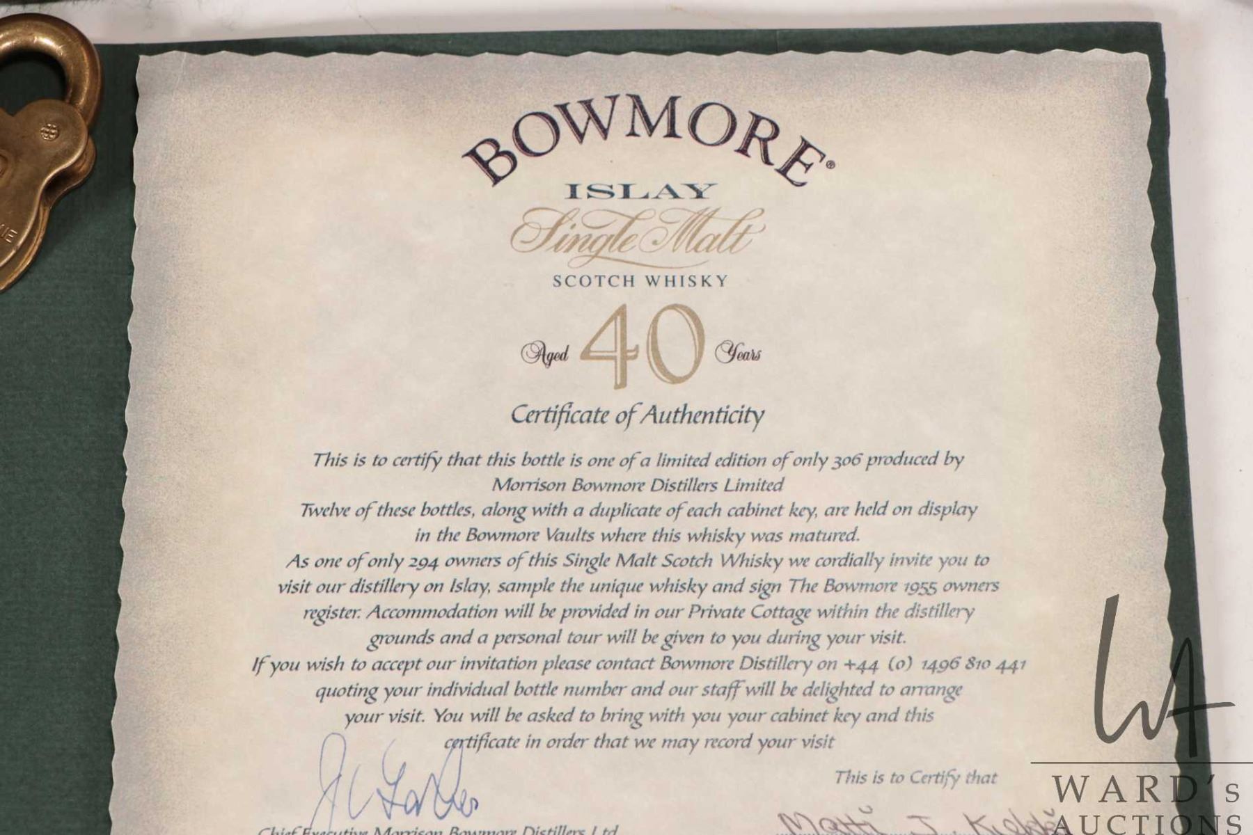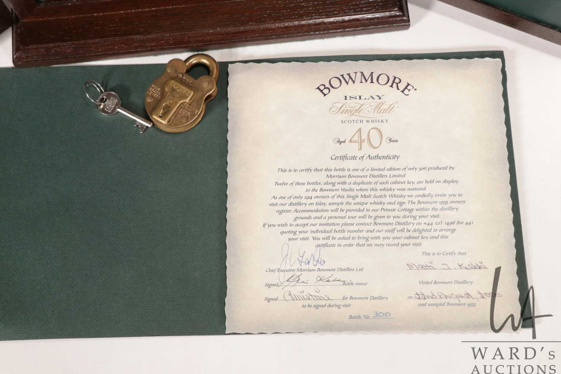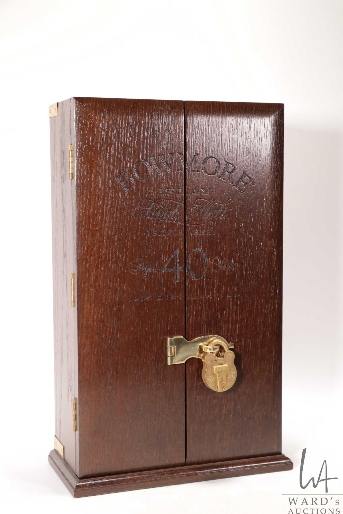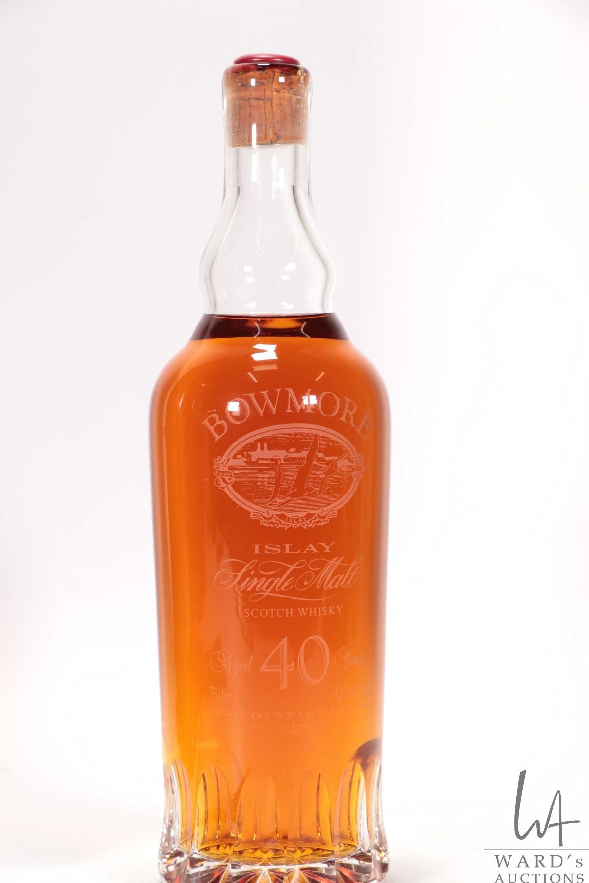 Bowmore/ Rare 40 Year-Old/ Single Malt Scotch Whiskey / 700ml/ 42% ABV This limited edition package is bottle number 300 of a total edition of 306 and only 294 issued to the public. You'll find very few on sale to the public today and research indicates that there are only two bottles known to be in Canada. Not only is it in the oak display case, with crystal bottle and stopper, you also get the certificate of authenticity, original pad lock with key and the original shipping packaging. This bottle has only had one owner since leaving the Bowmore distillery. This whisky was distilled on November 22nd, 1955, first in a bourbon hogshead for twenty years and then moved to a sherry cask. Bottled in 1995. Ward's Auctions will store this bottle for up to six months for foreign buyers to arrange for export brokerage. Insurance during that time will be the responabilty of the buyer and Ward's Auctions will accept no responsibilty for damage or loss during that time. Although every effort will be made to keep it safe. Note: Alcohol cannot be insured by any courier in Canada. Local pick up is recommended. Canadian bidders only