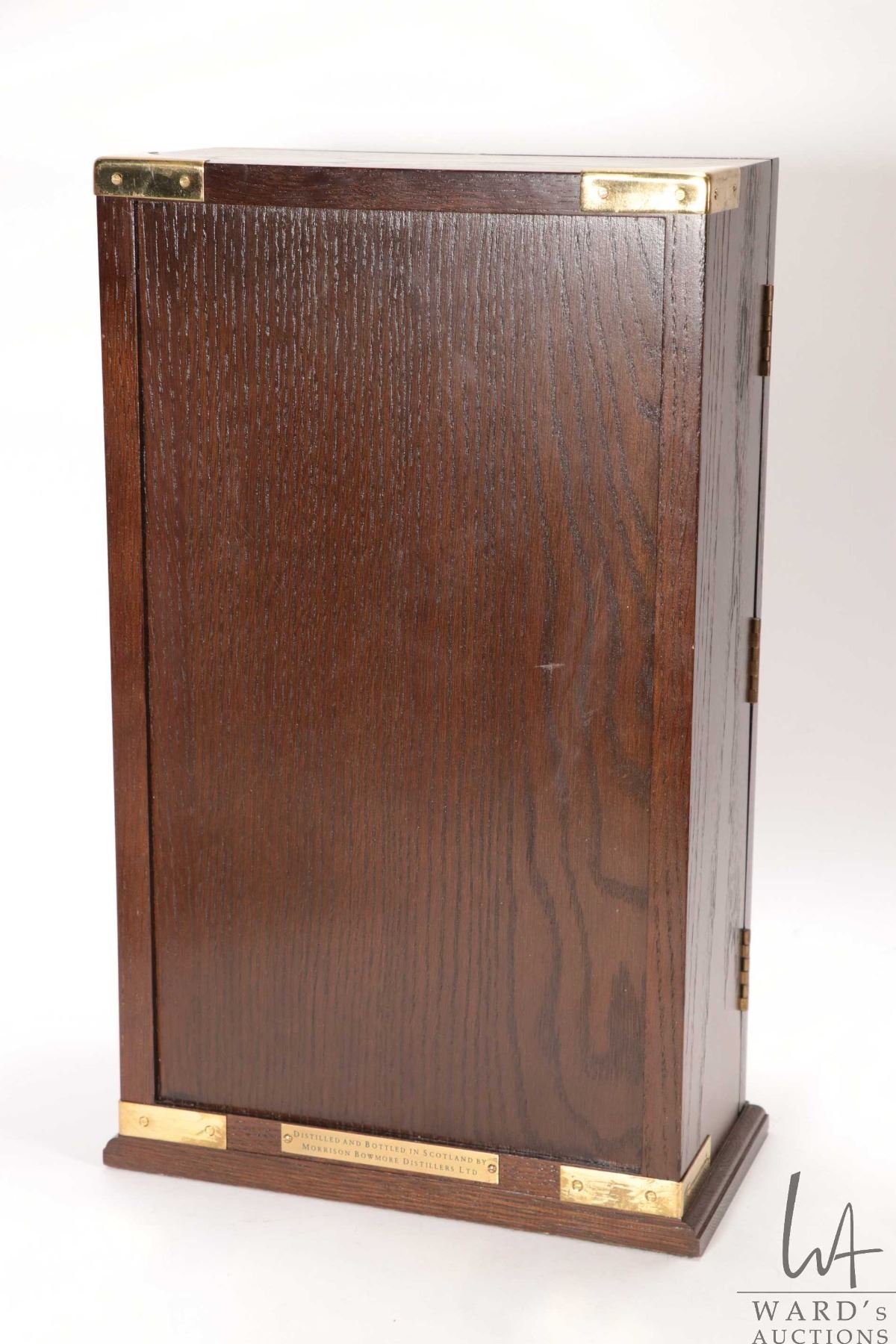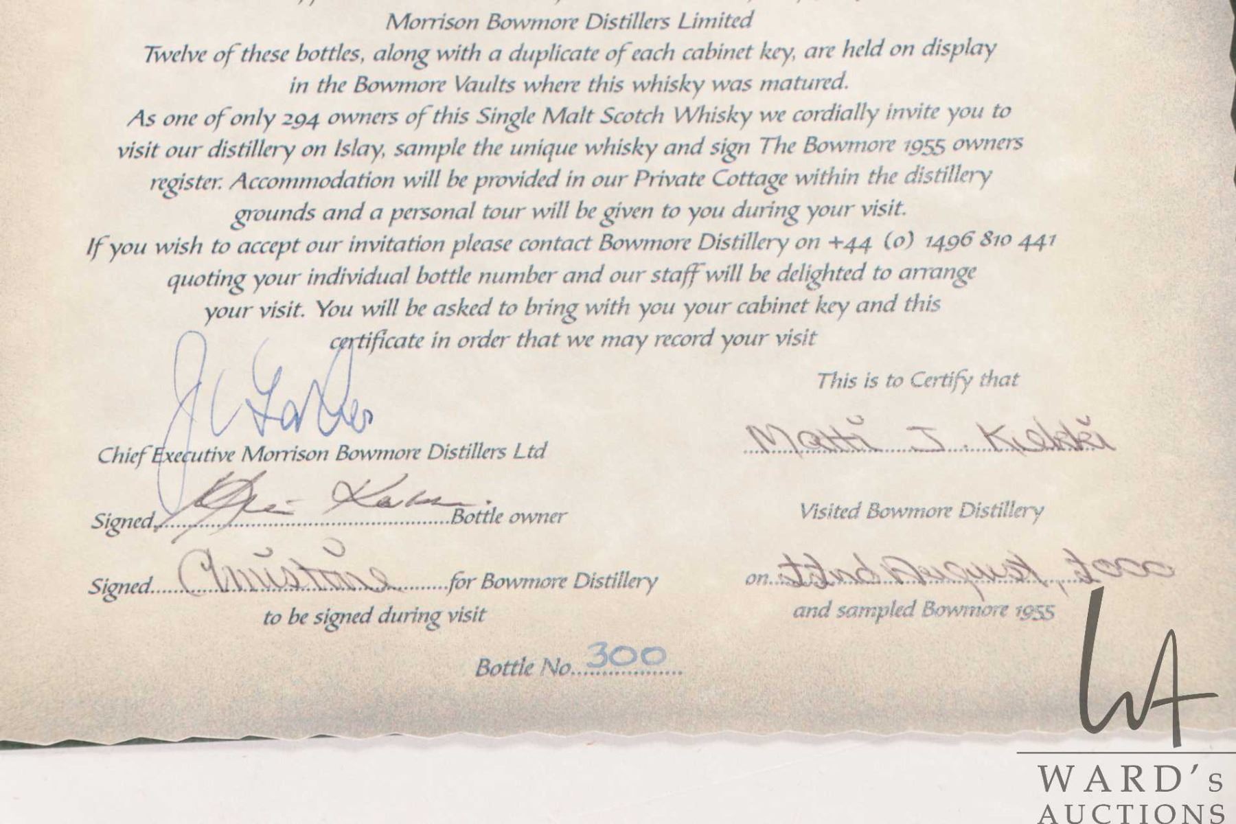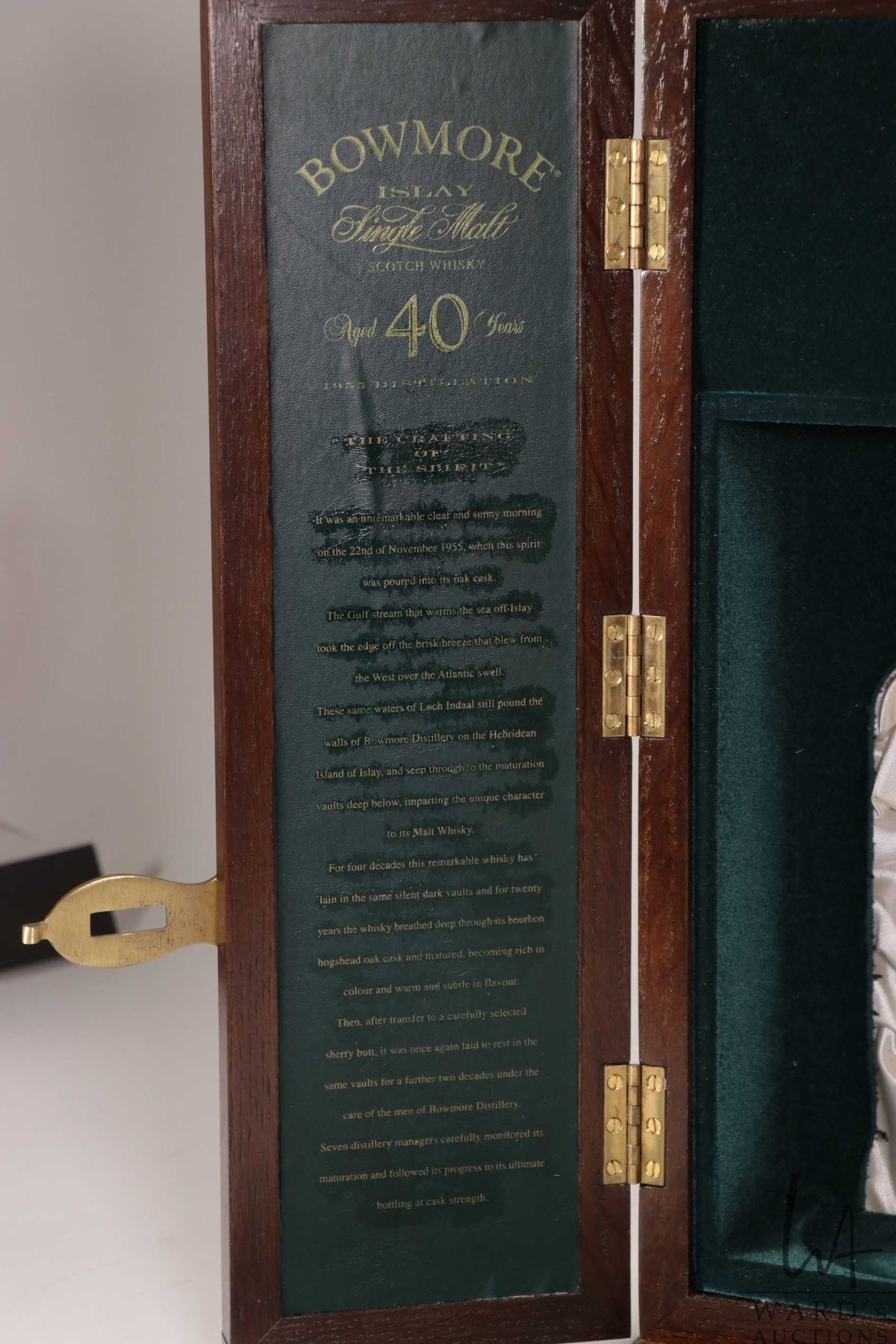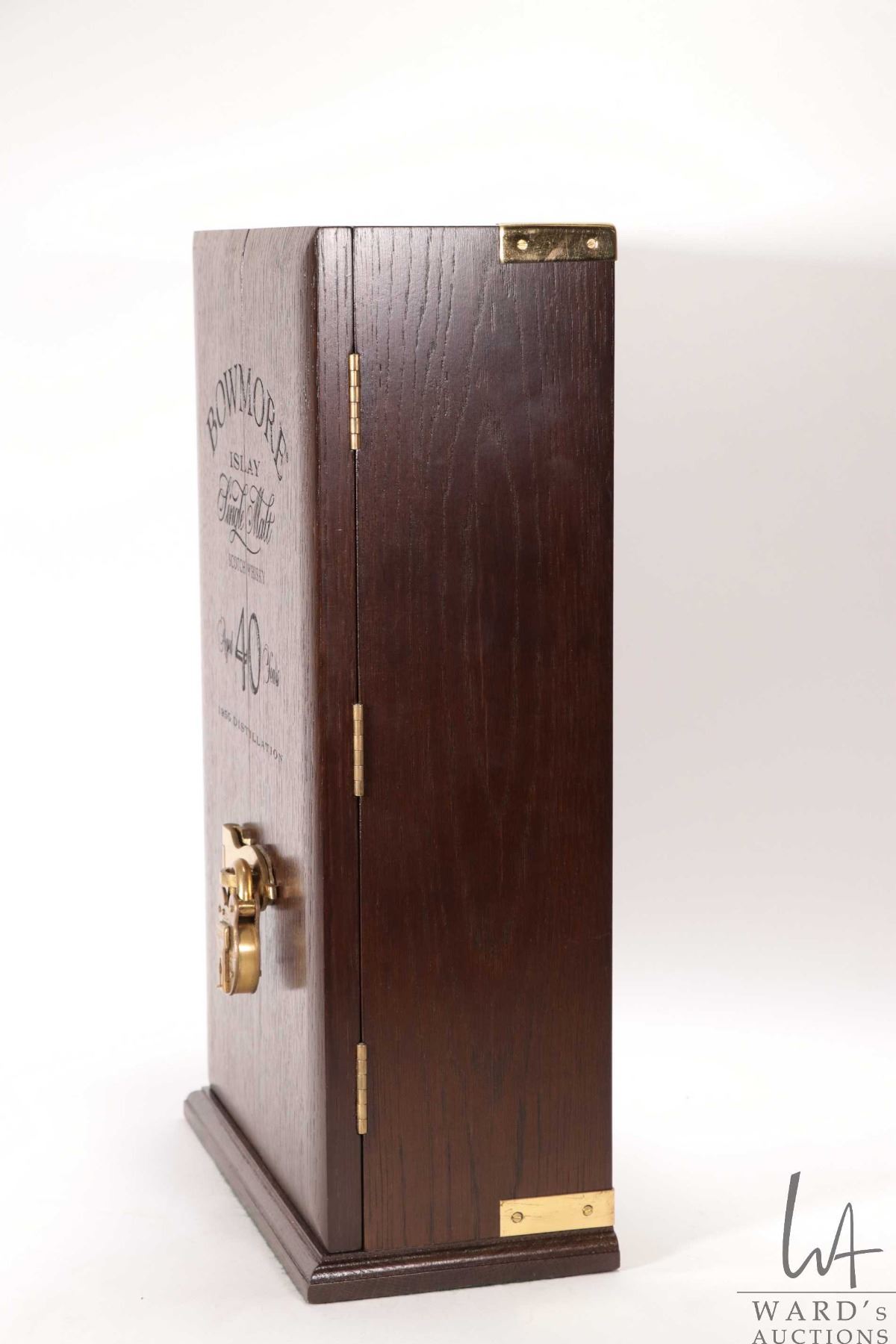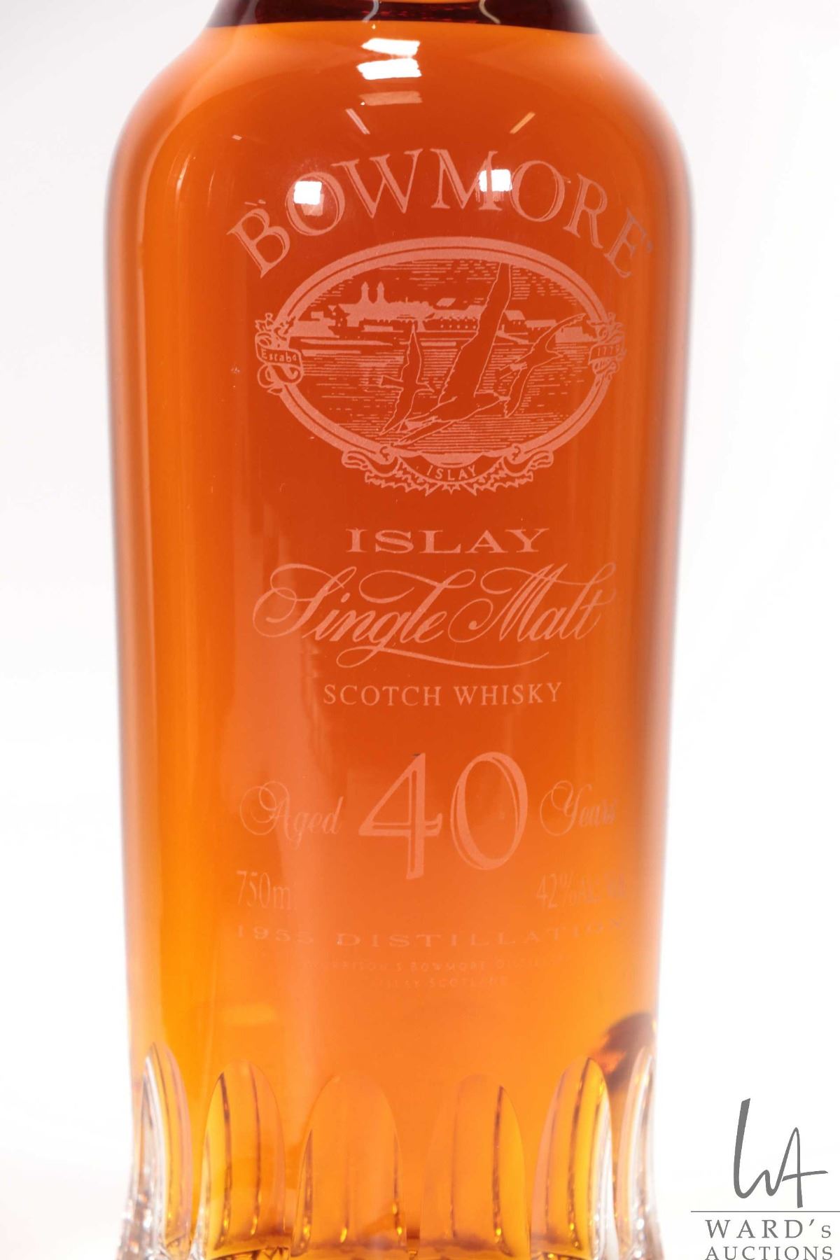 Bowmore/ Rare 40 Year-Old/ Single Malt Scotch Whiskey / 700ml/ 42% ABV This limited edition package is bottle number 300 of a total edition of 306 and only 294 issued to the public. You'll find very few on sale to the public today and research indicates that there are only two bottles known to be in Canada. Not only is it in the oak display case, with crystal bottle and stopper, you also get the certificate of authenticity, original pad lock with key and the original shipping packaging. This bottle has only had one owner since leaving the Bowmore distillery. This whisky was distilled on November 22nd, 1955, first in a bourbon hogshead for twenty years and then moved to a sherry cask. Bottled in 1995. Ward's Auctions will store this bottle for up to six months for foreign buyers to arrange for export brokerage. Insurance during that time will be the responabilty of the buyer and Ward's Auctions will accept no responsibilty for damage or loss during that time. Although every effort will be made to keep it safe. Note: Alcohol cannot be insured by any courier in Canada. Local pick up is recommended. Canadian bidders only